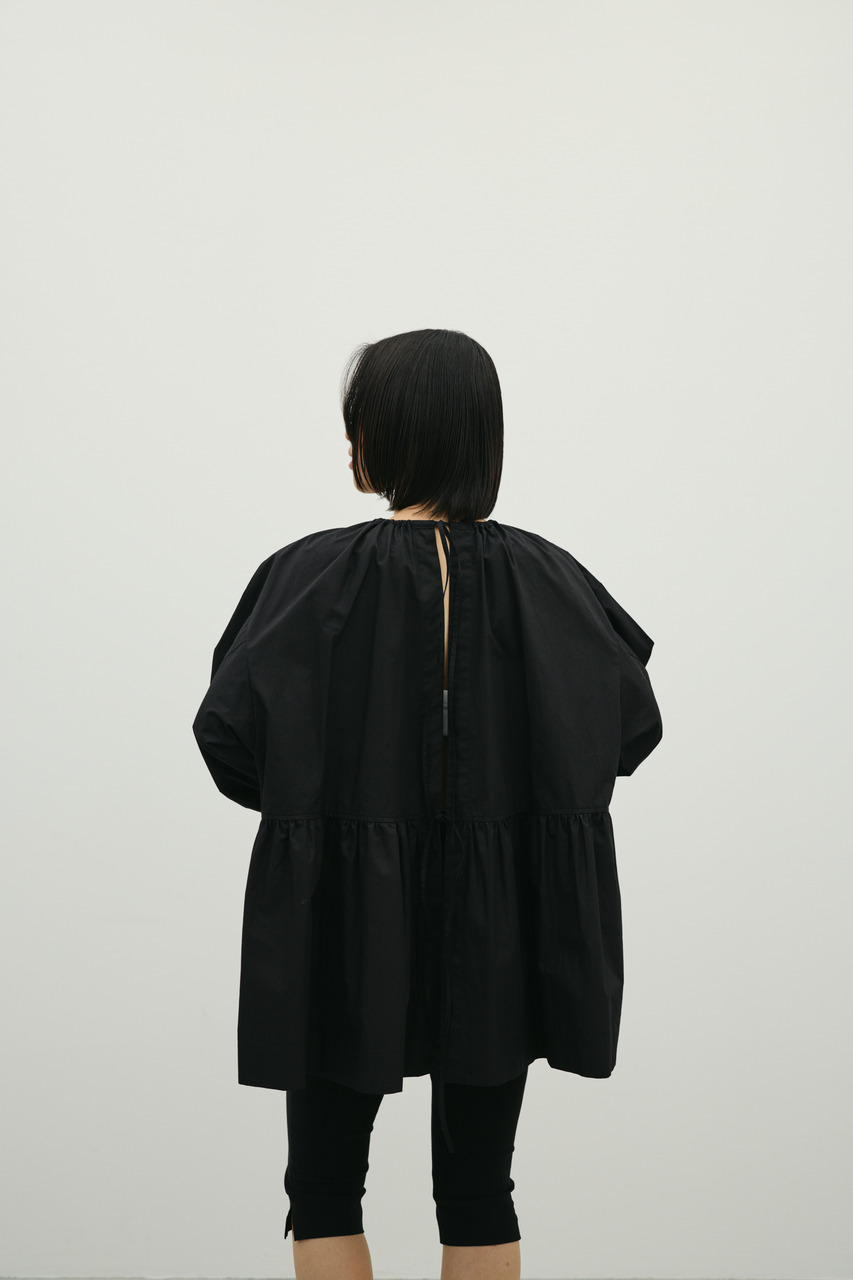 動いた時のフレアシルエットが美しくエアリー感のあるギャザーをたっぷりと寄せたコットンシャツ。前立ては共地リボン開き仕様になっており、前後2WAYで着用可能。衿ぐりの共地リボンは調整可能なため、お好みのネックの開き具合で着用いただけます。袖口はカフス仕様なので、たくしあげてパフっと着用するのがおすすめです。ハリのあるコットンを使用。透け感WHTややあり、ストレッチなし。