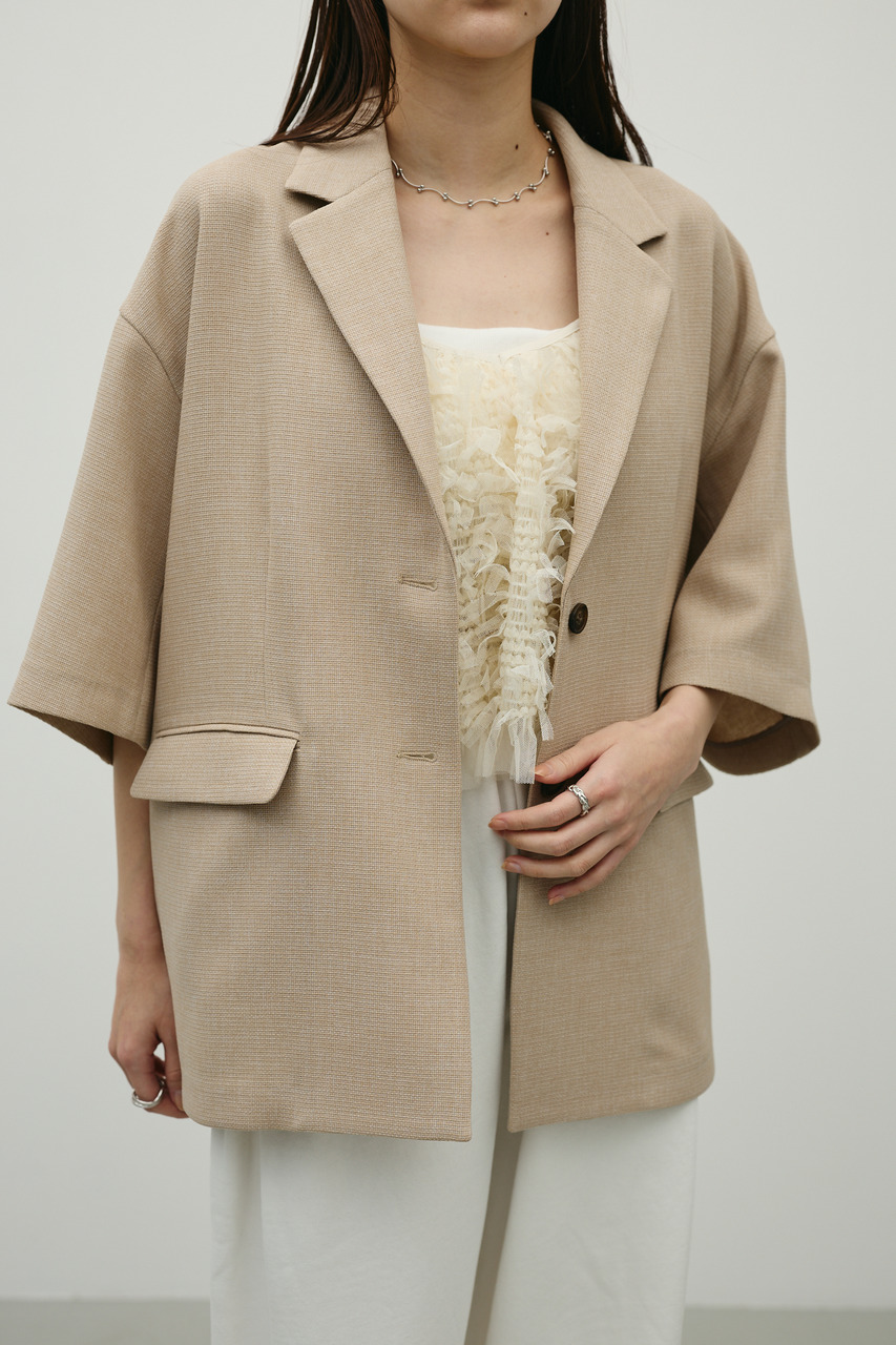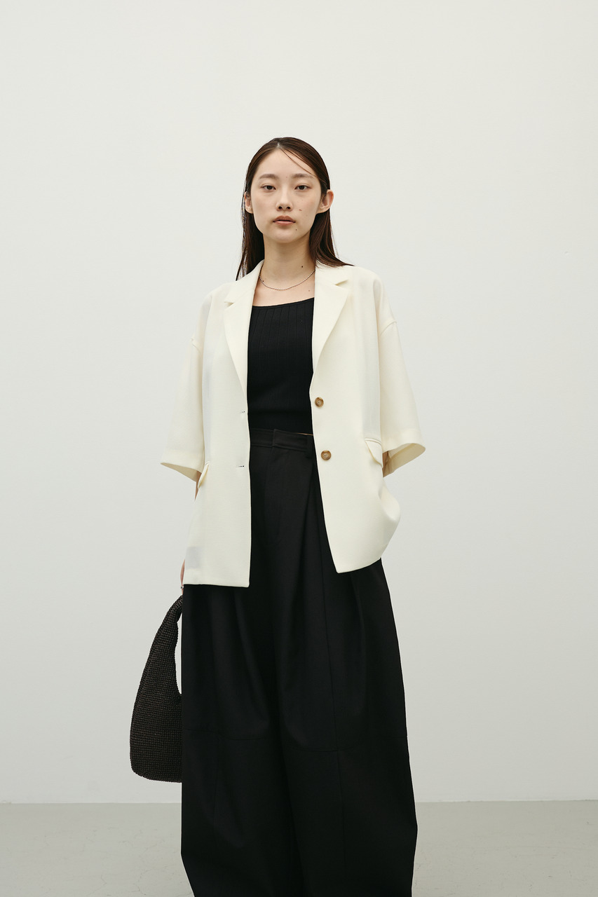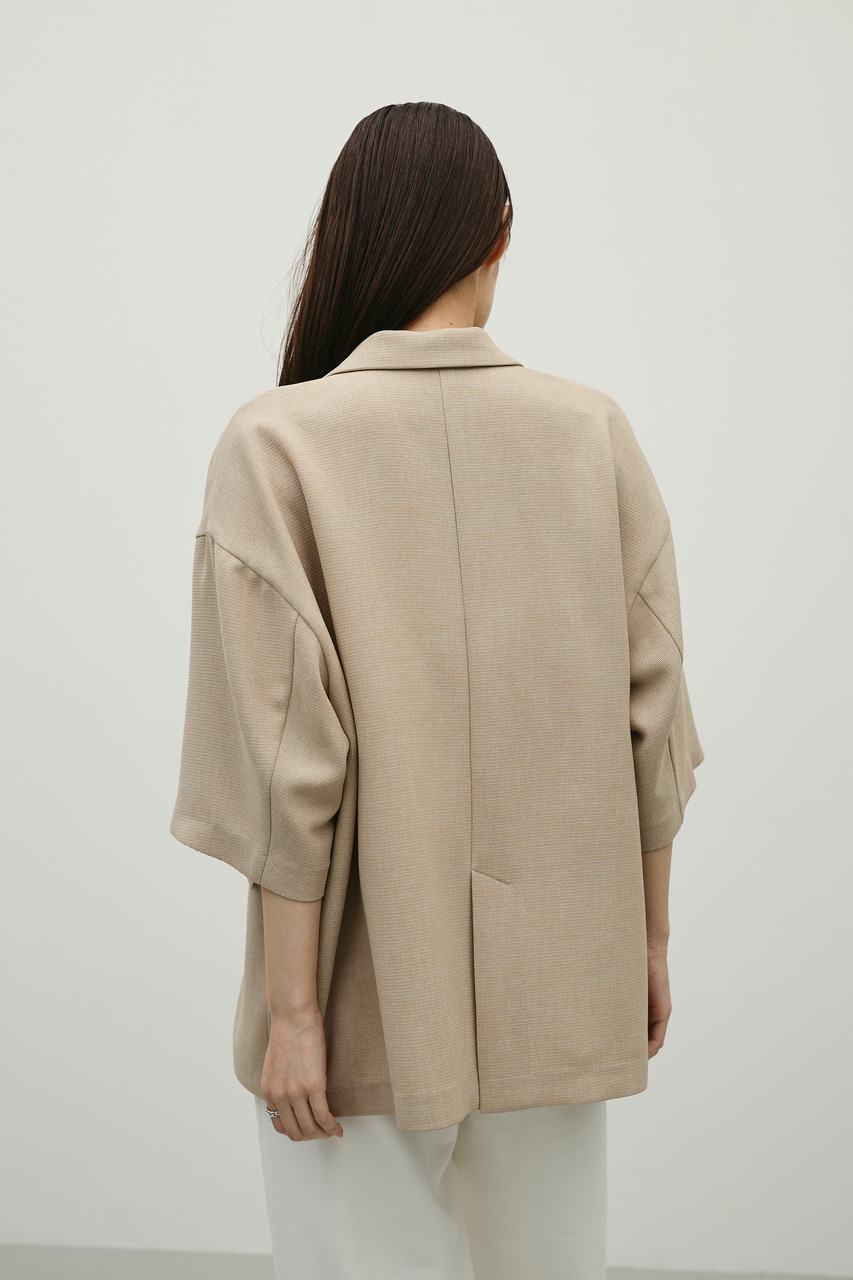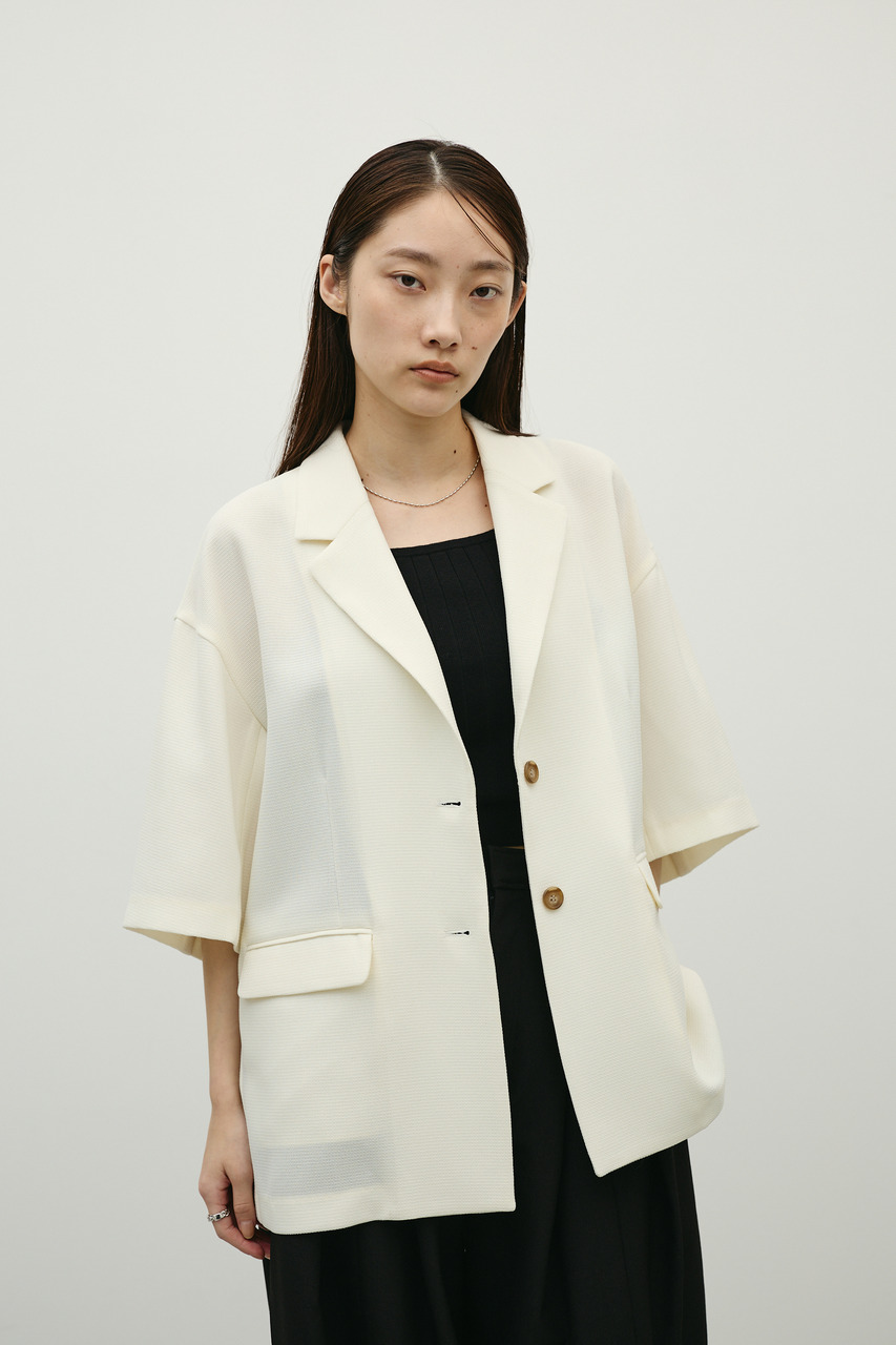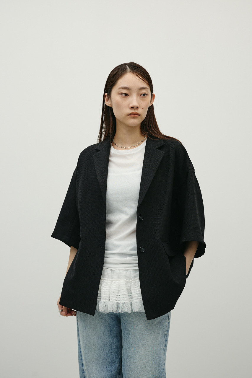 ざっくりとした表情感のあるリネンライクな半袖テーラージャケット。ナチュラルなメランジ調カラーが上品な印象に導きます。マニッシュにもレディにも着こなせるこだわりぬいたサイズ感とカラー展開。シャツのようにラフにスタイリングできるように、裏地は付けずパイピングで軽く仕上げました。500JSB31-1651(リネンライクストレートスカート)とセットアップ着用可能。透け感なし、ストレッチなし。