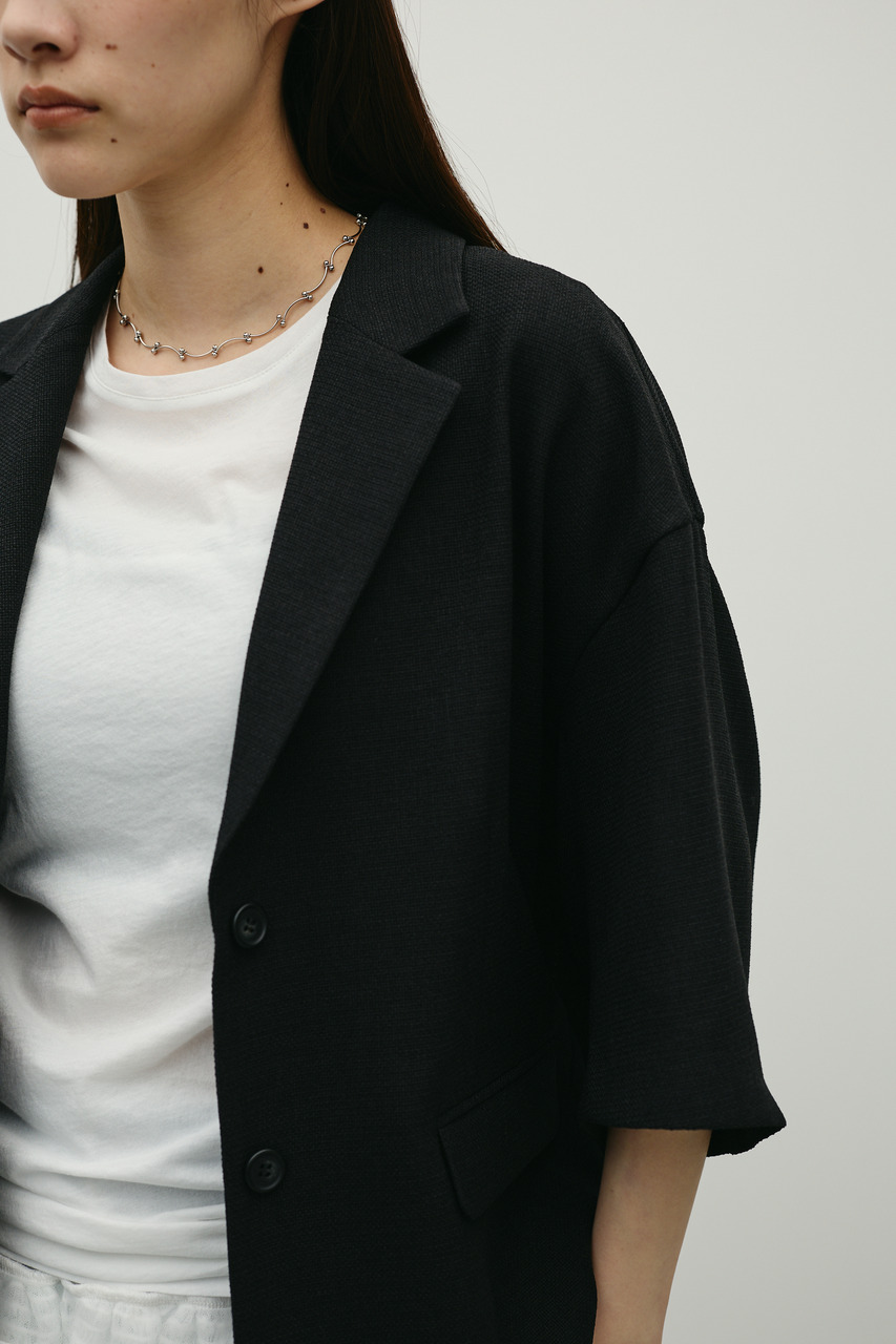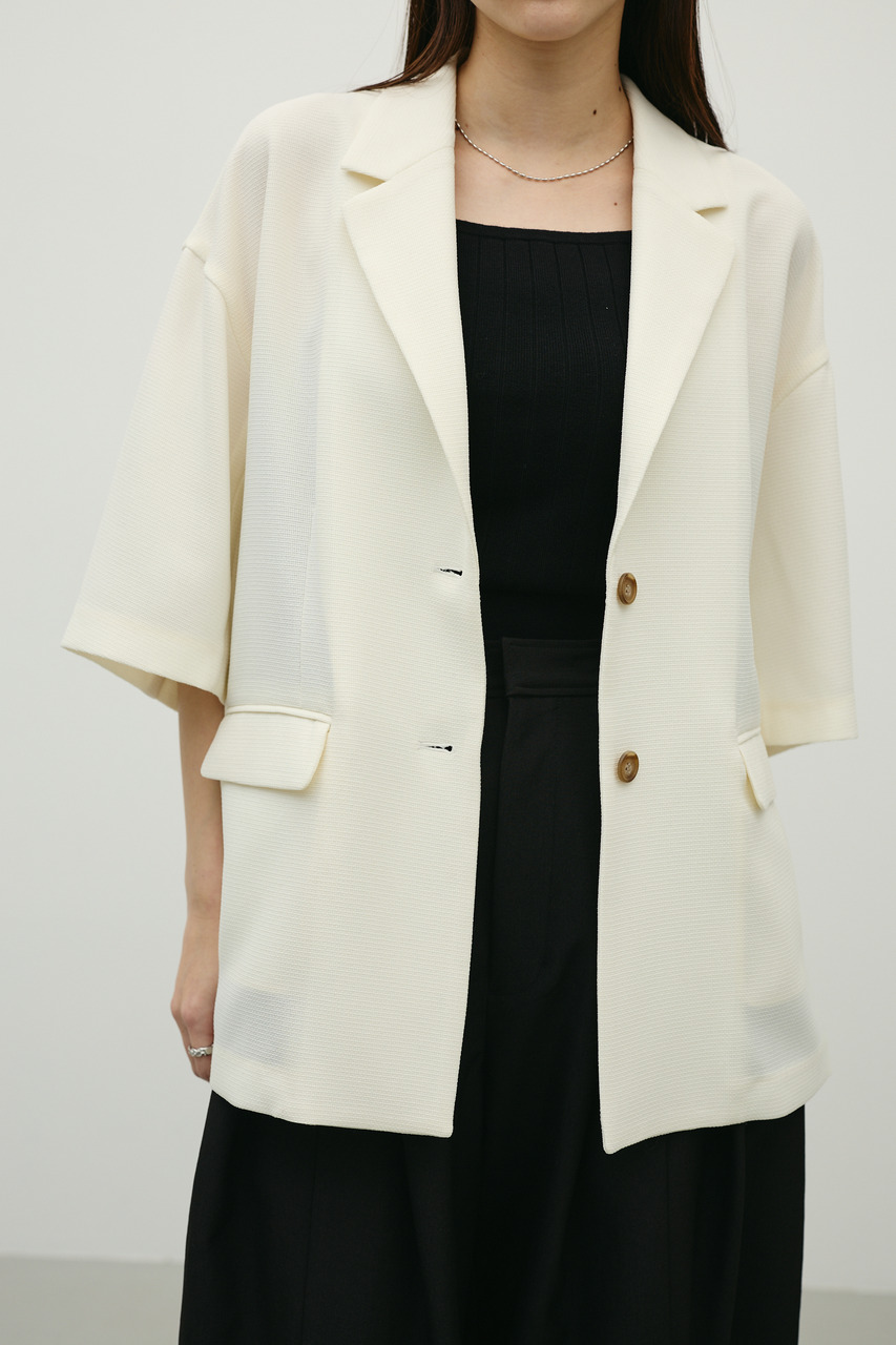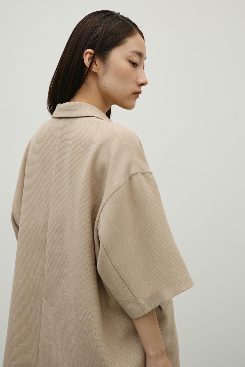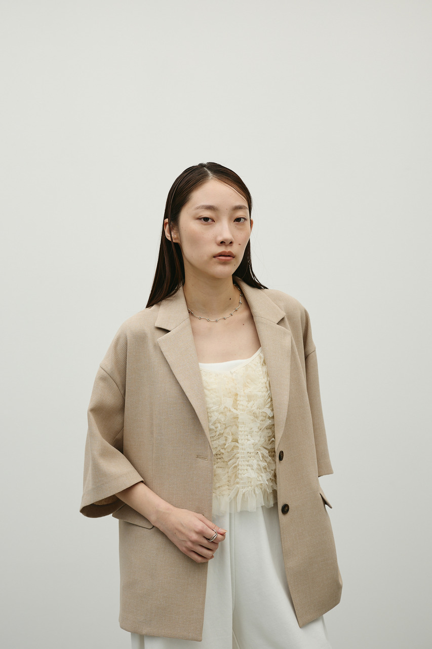 ざっくりとした表情感のあるリネンライクな半袖テーラージャケット。ナチュラルなメランジ調カラーが上品な印象に導きます。マニッシュにもレディにも着こなせるこだわりぬいたサイズ感とカラー展開。シャツのようにラフにスタイリングできるように、裏地は付けずパイピングで軽く仕上げました。500JSB31-1651(リネンライクストレートスカート)とセットアップ着用可能。透け感なし、ストレッチなし。