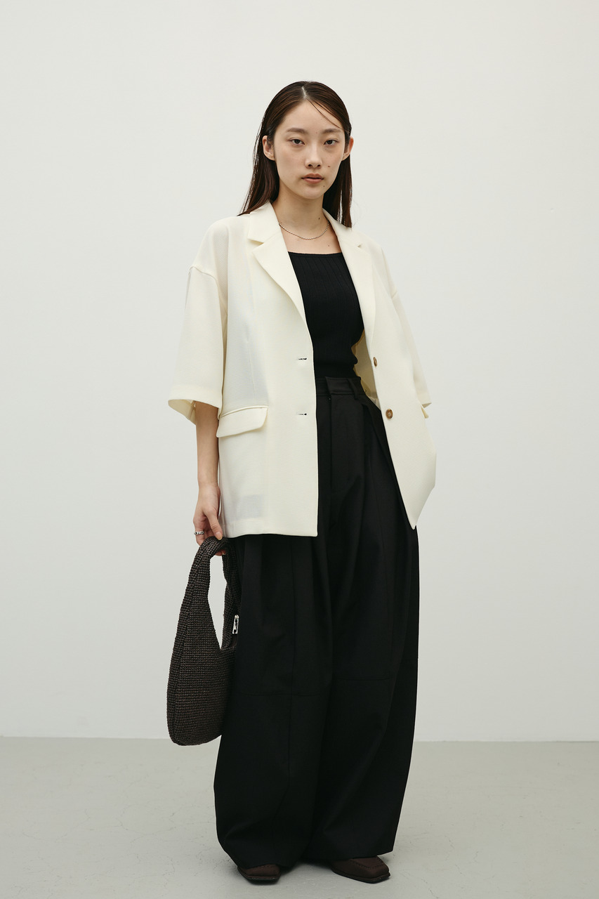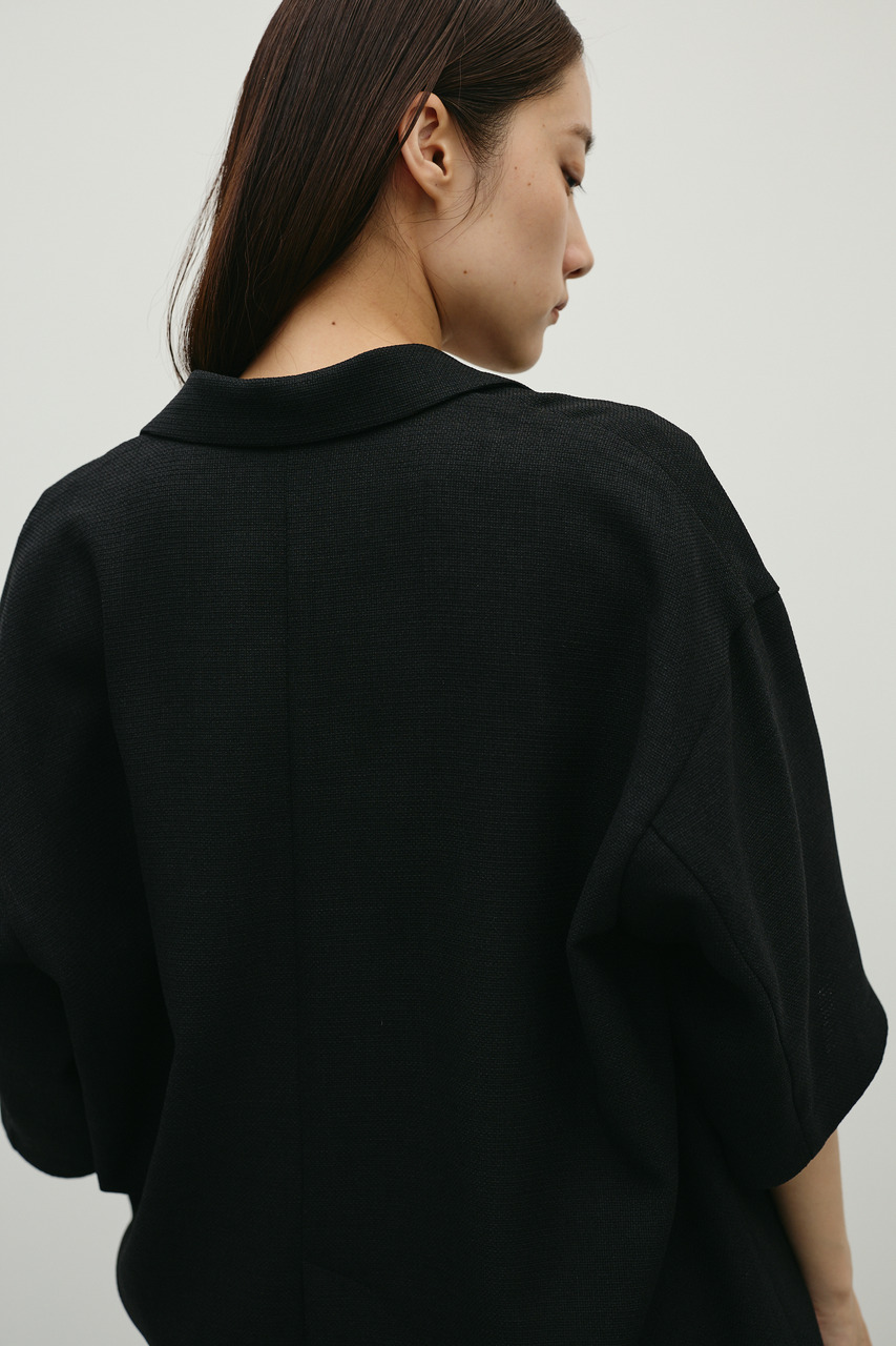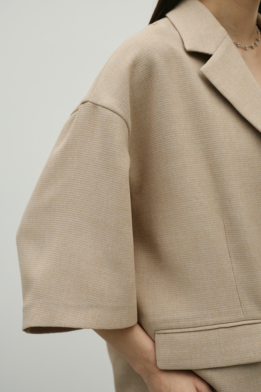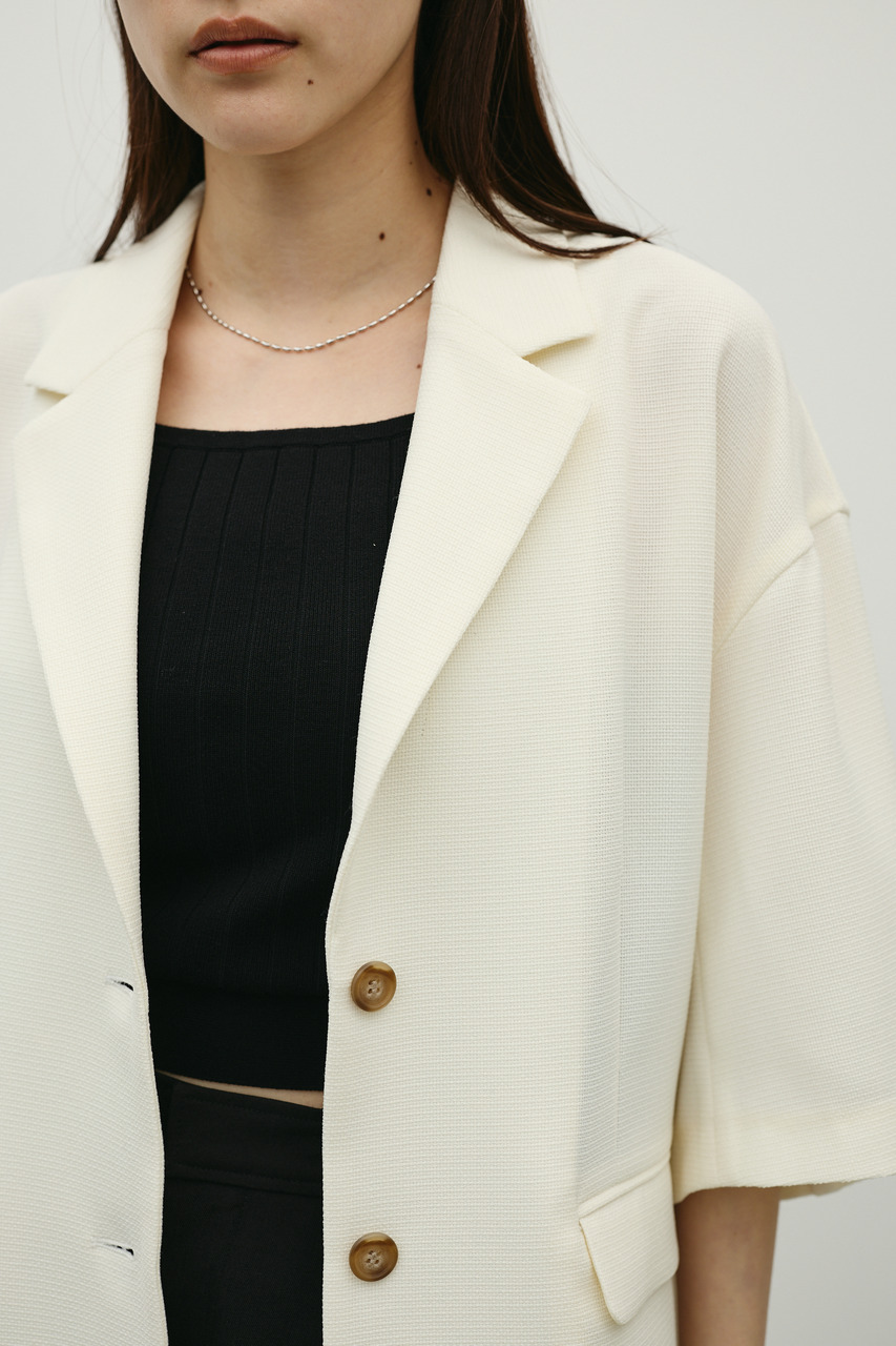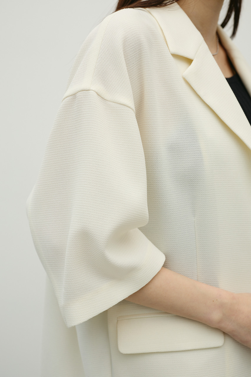 ざっくりとした表情感のあるリネンライクな半袖テーラージャケット。ナチュラルなメランジ調カラーが上品な印象に導きます。マニッシュにもレディにも着こなせるこだわりぬいたサイズ感とカラー展開。シャツのようにラフにスタイリングできるように、裏地は付けずパイピングで軽く仕上げました。500JSB31-1651(リネンライクストレートスカート)とセットアップ着用可能。透け感なし、ストレッチなし。