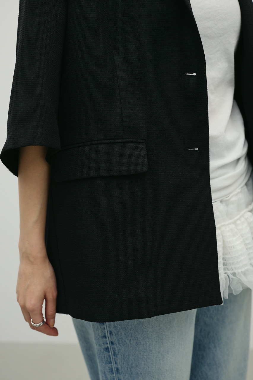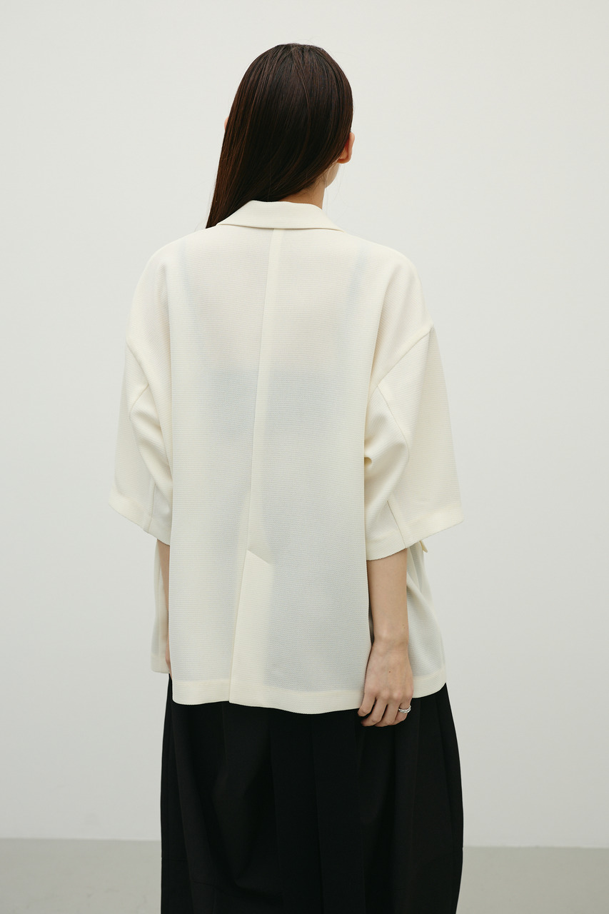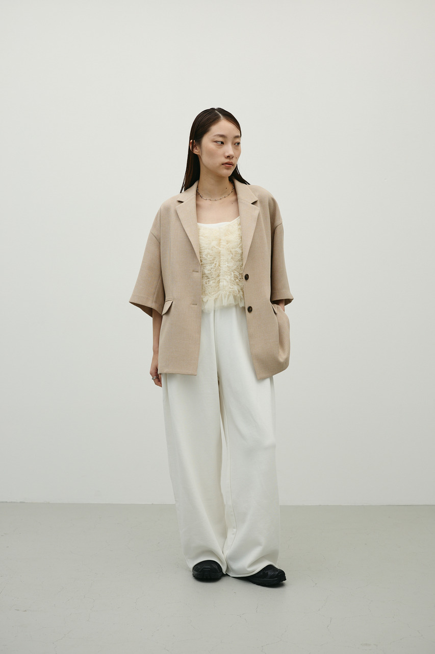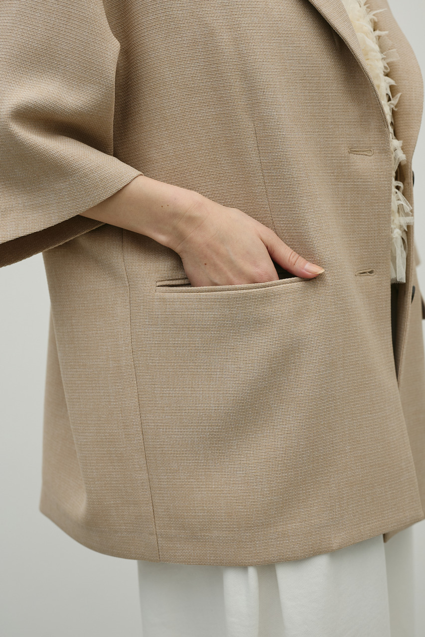 ざっくりとした表情感のあるリネンライクな半袖テーラージャケット。ナチュラルなメランジ調カラーが上品な印象に導きます。マニッシュにもレディにも着こなせるこだわりぬいたサイズ感とカラー展開。シャツのようにラフにスタイリングできるように、裏地は付けずパイピングで軽く仕上げました。500JSB31-1651(リネンライクストレートスカート)とセットアップ着用可能。透け感なし、ストレッチなし。