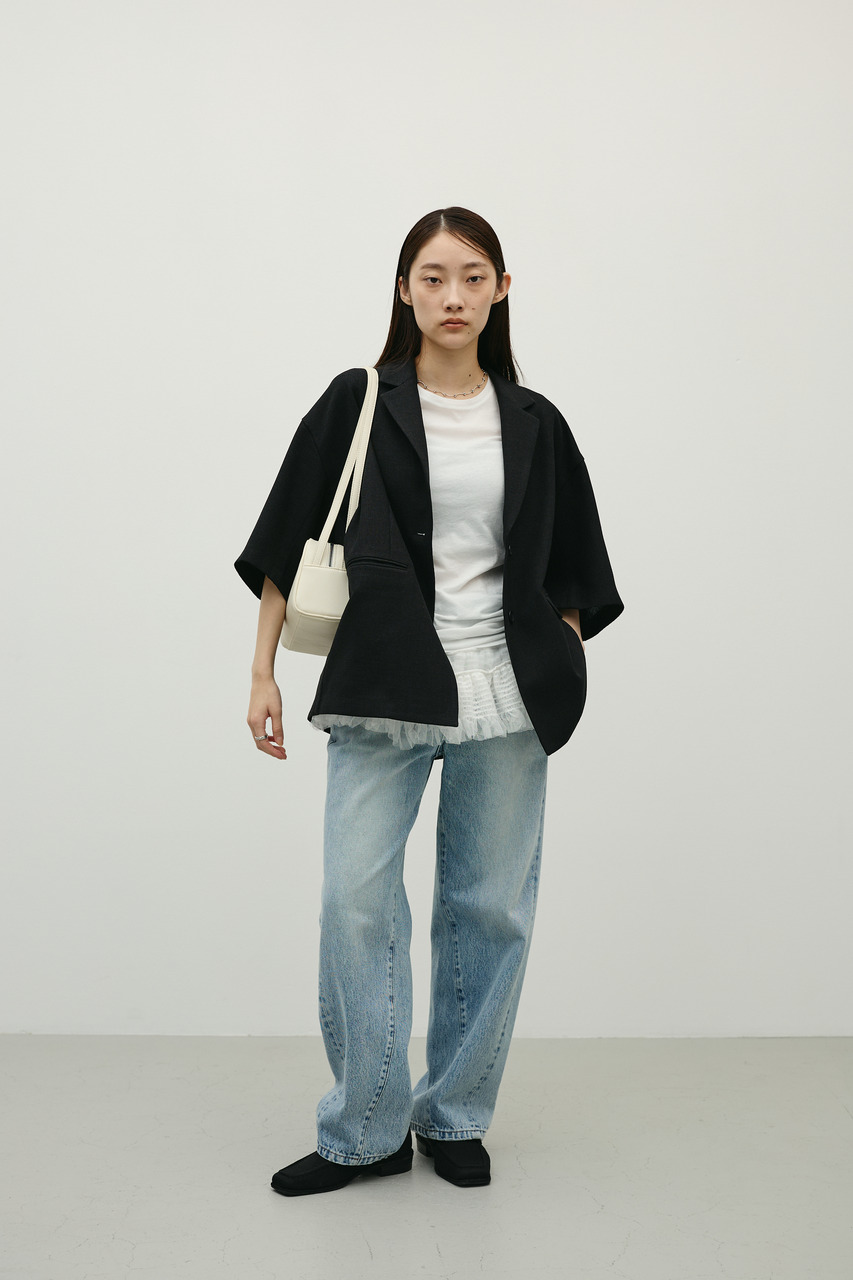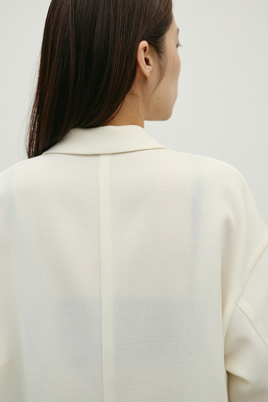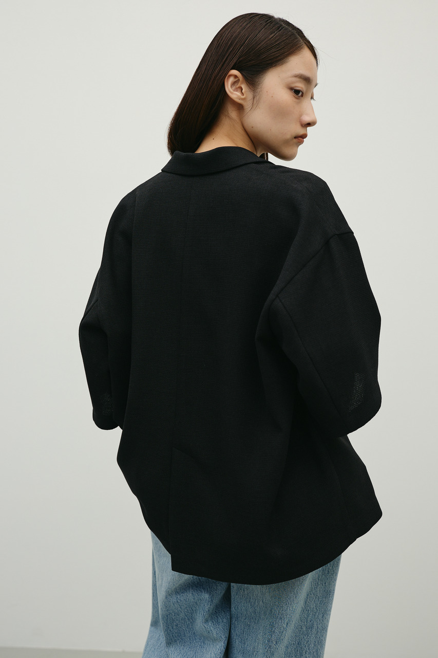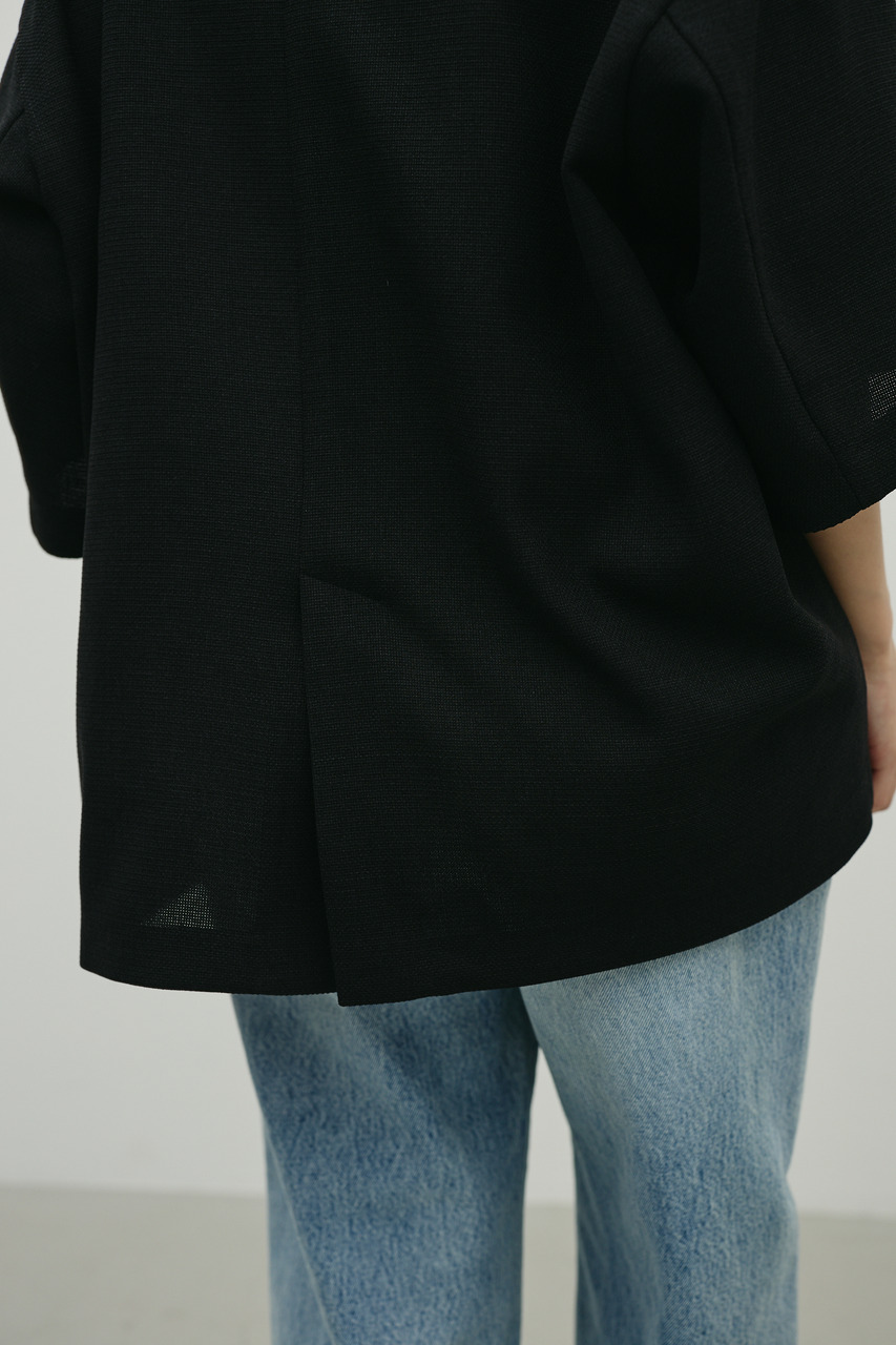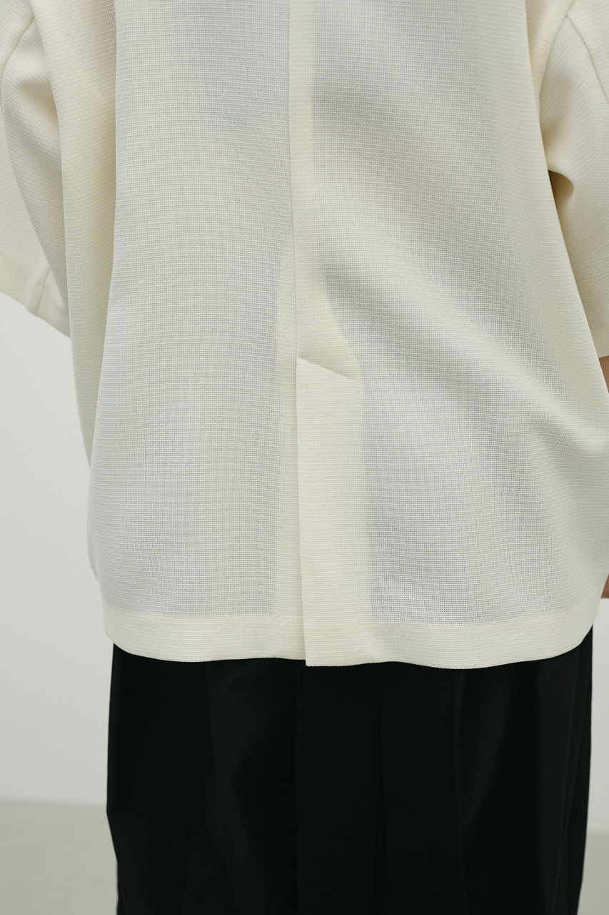 ざっくりとした表情感のあるリネンライクな半袖テーラージャケット。ナチュラルなメランジ調カラーが上品な印象に導きます。マニッシュにもレディにも着こなせるこだわりぬいたサイズ感とカラー展開。シャツのようにラフにスタイリングできるように、裏地は付けずパイピングで軽く仕上げました。500JSB31-1651(リネンライクストレートスカート)とセットアップ着用可能。透け感なし、ストレッチなし。