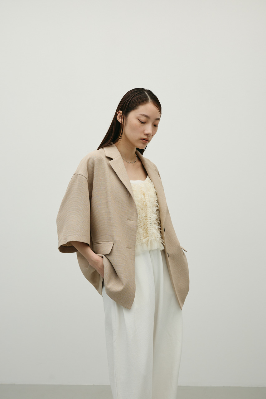 ざっくりとした表情感のあるリネンライクな半袖テーラージャケット。ナチュラルなメランジ調カラーが上品な印象に導きます。マニッシュにもレディにも着こなせるこだわりぬいたサイズ感とカラー展開。シャツのようにラフにスタイリングできるように、裏地は付けずパイピングで軽く仕上げました。500JSB31-1651(リネンライクストレートスカート)とセットアップ着用可能。透け感なし、ストレッチなし。