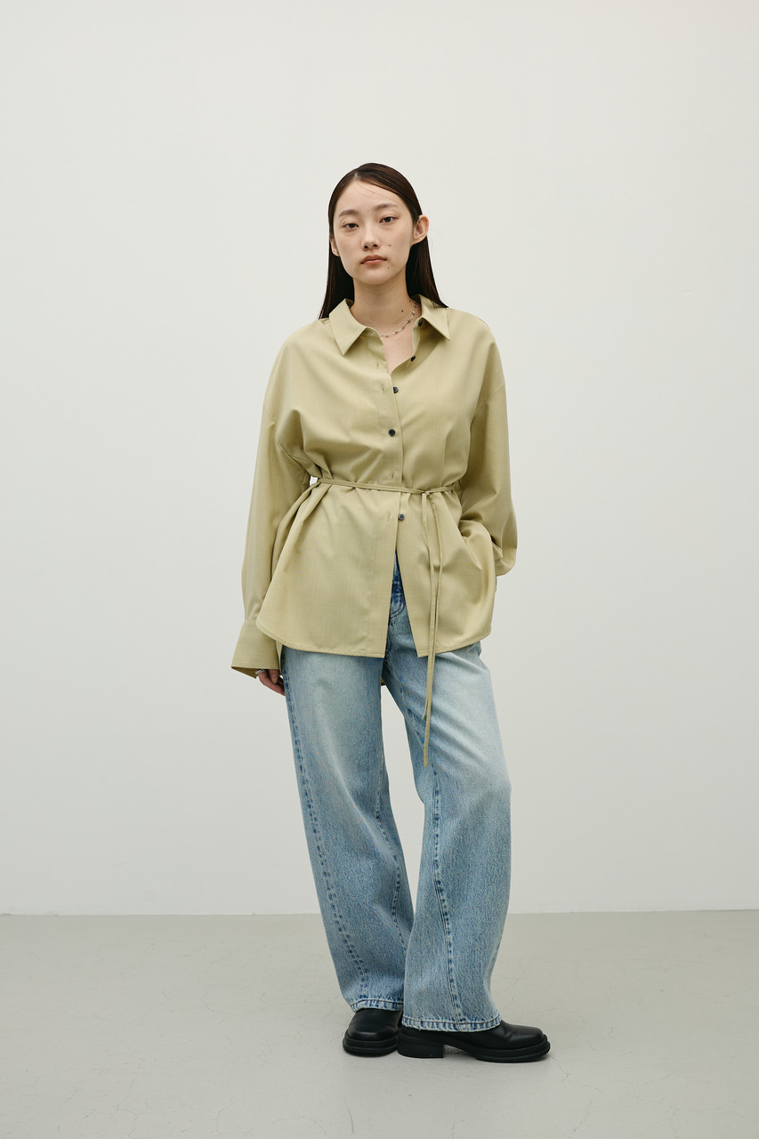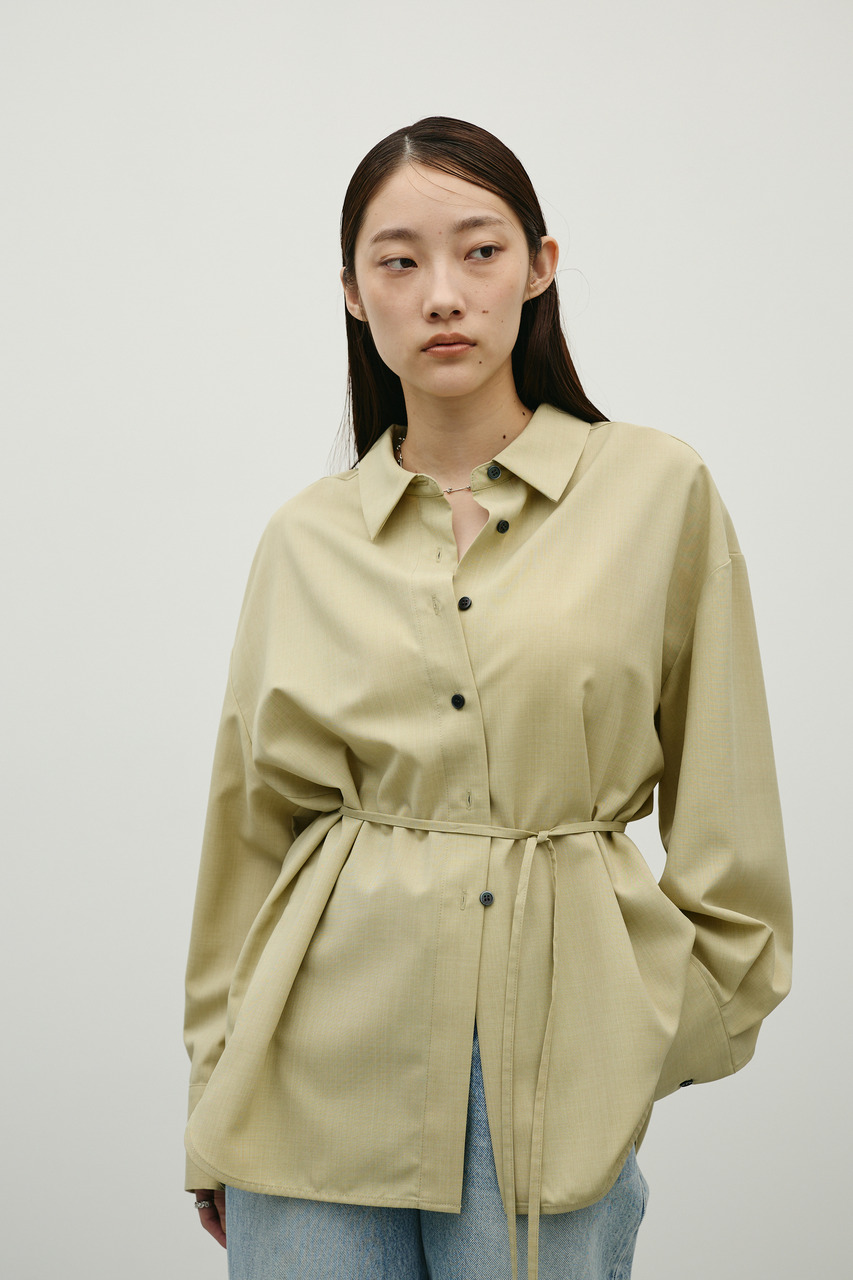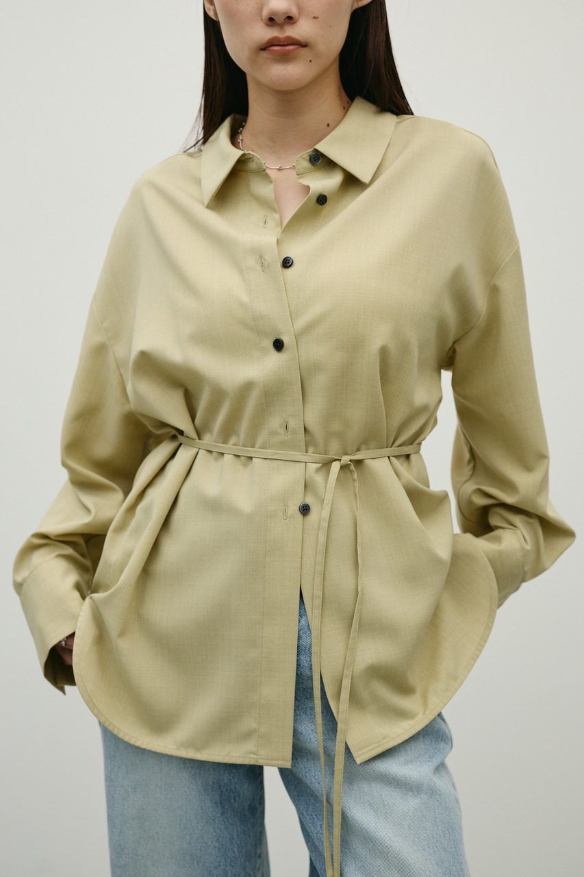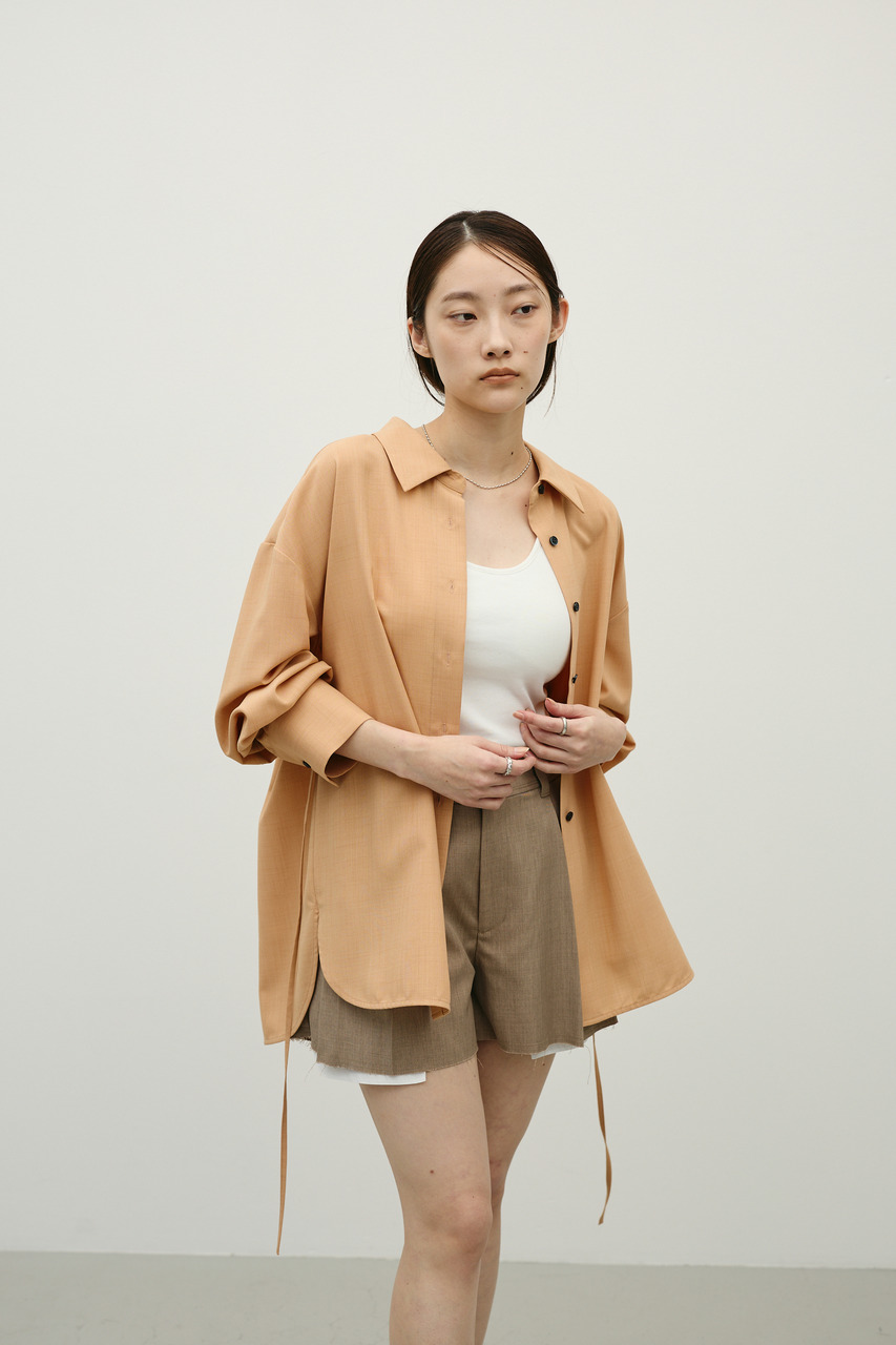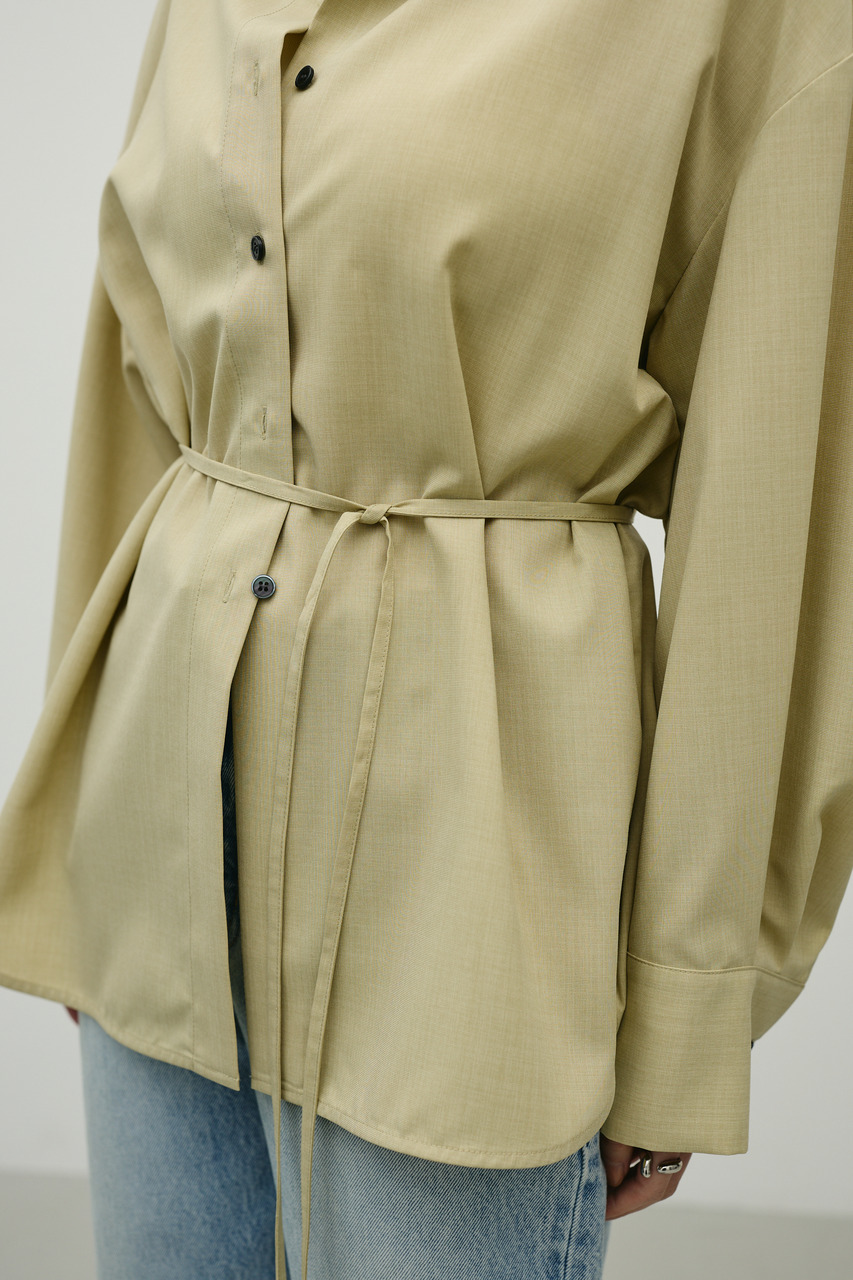 取り外し可能な共地紐がついたマニッシュカラーシャツ。ウエストのホールに紐を通してベルトとして使用したり、襟の下に巻いてチョーカーとしても使用でき、気分によってスタイリングをアレンジできます。サラッとした肌触りの良い素材なので、一枚でも羽織りとしてもオールシーズン使い回しできる万能シャツです。透け感あり、ストレッチなし。