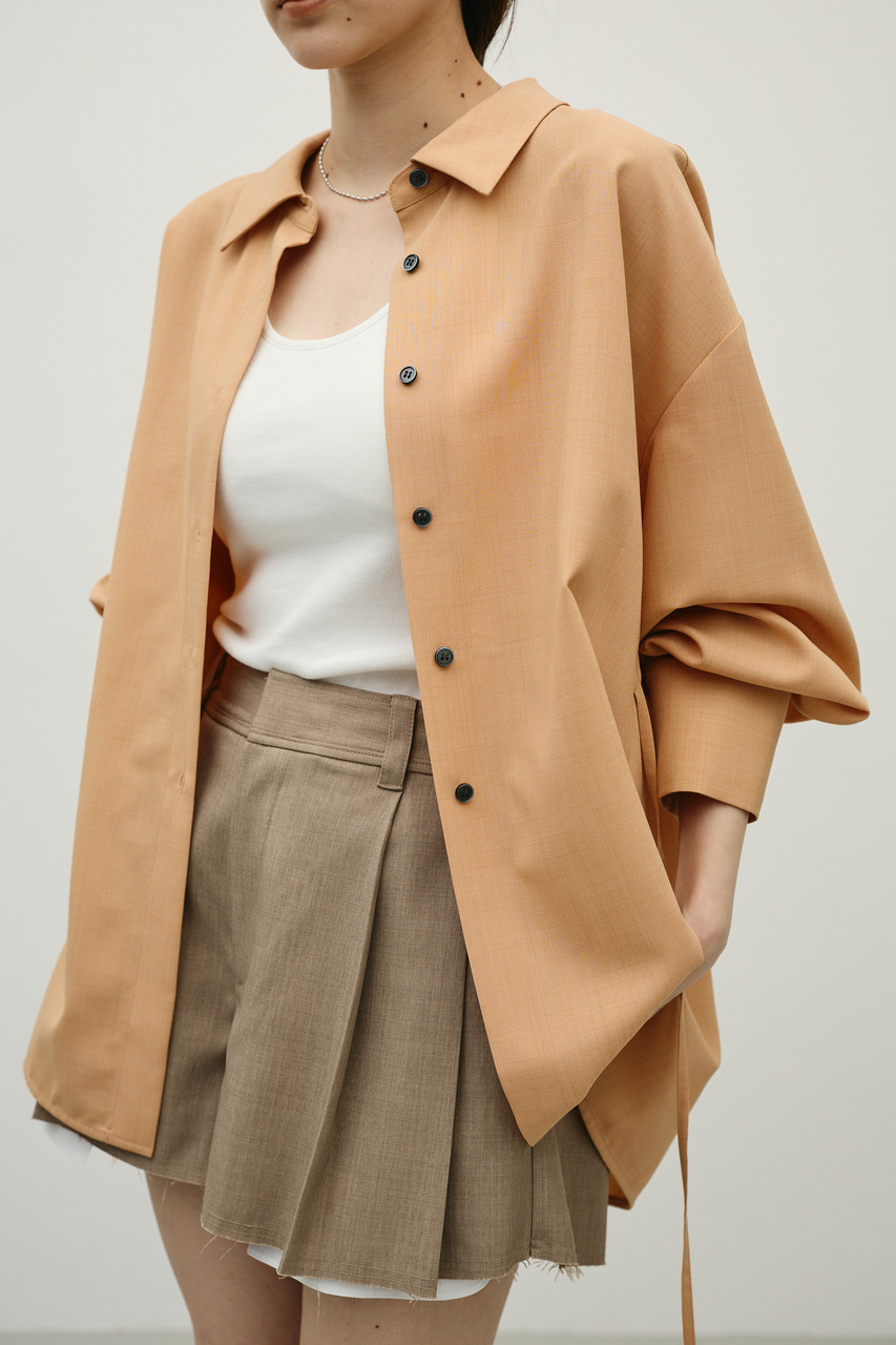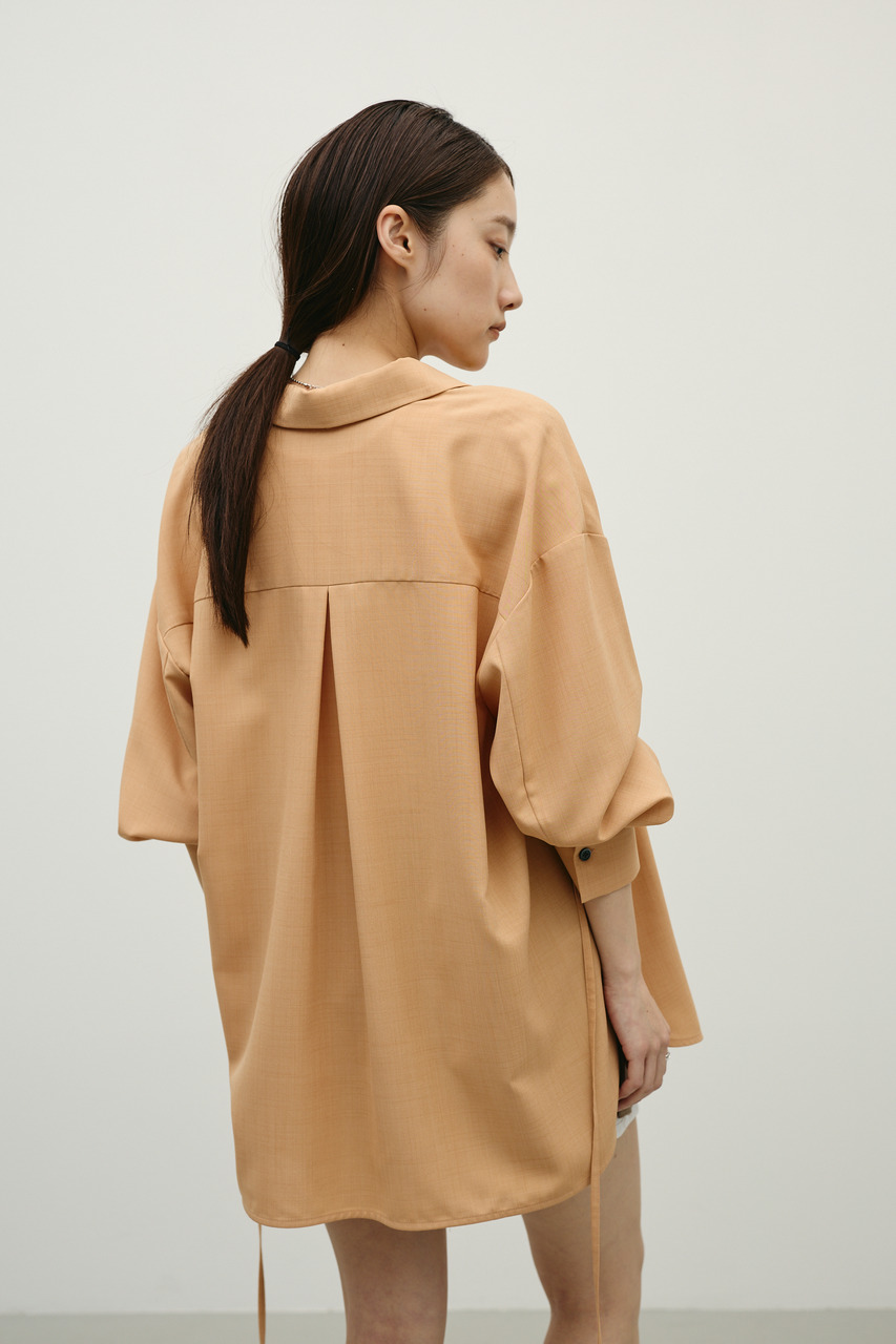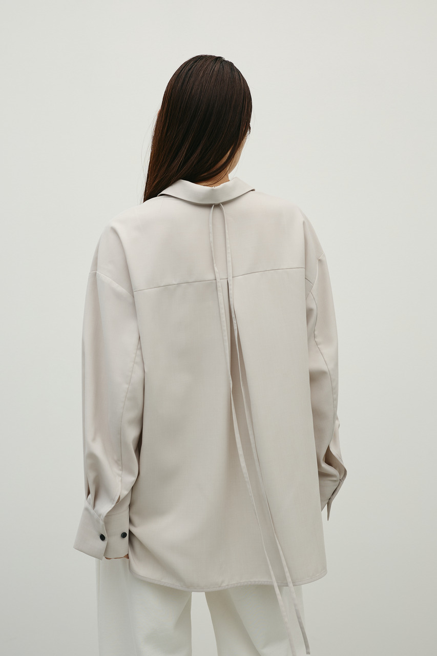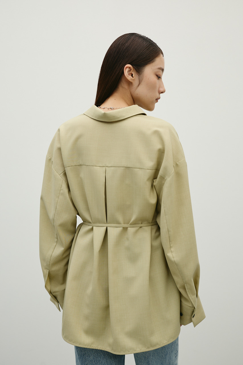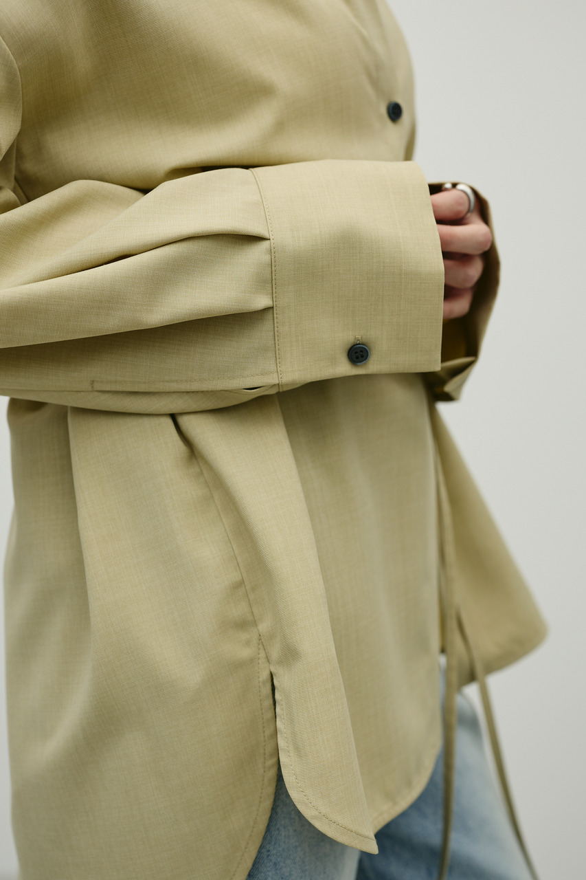取り外し可能な共地紐がついたマニッシュカラーシャツ。ウエストのホールに紐を通してベルトとして使用したり、襟の下に巻いてチョーカーとしても使用でき、気分によってスタイリングをアレンジできます。サラッとした肌触りの良い素材なので、一枚でも羽織りとしてもオールシーズン使い回しできる万能シャツです。透け感あり、ストレッチなし。