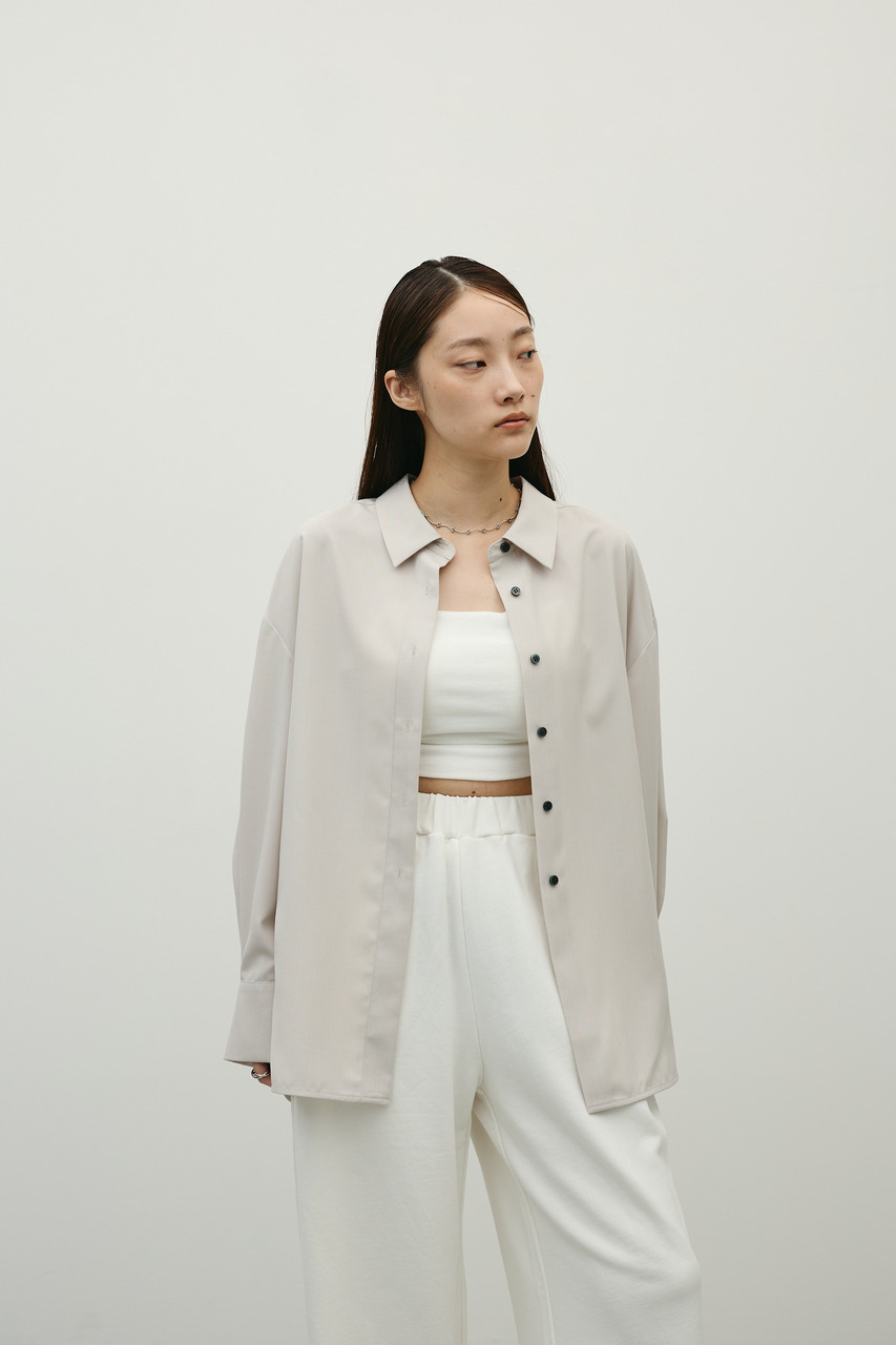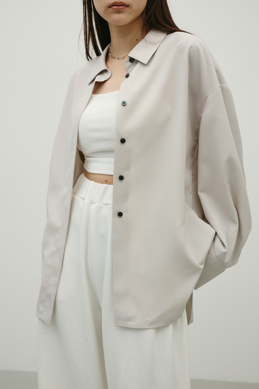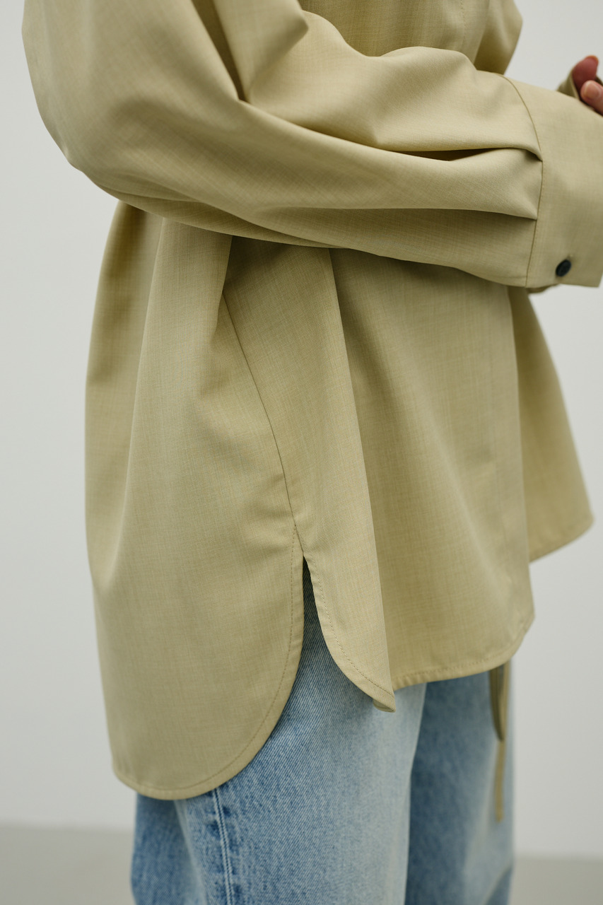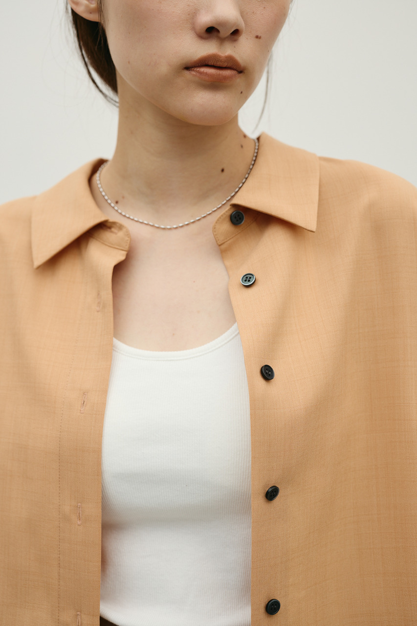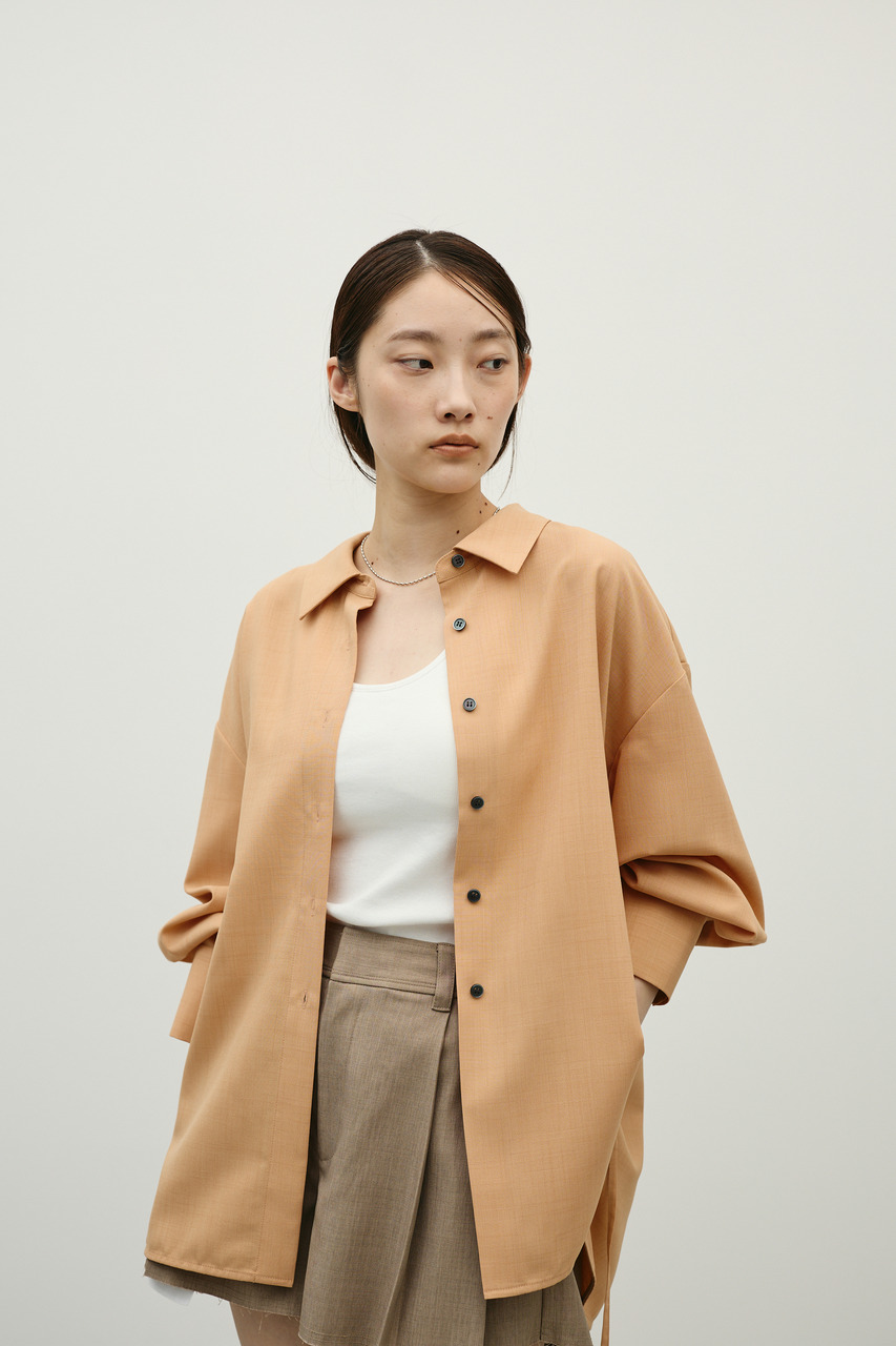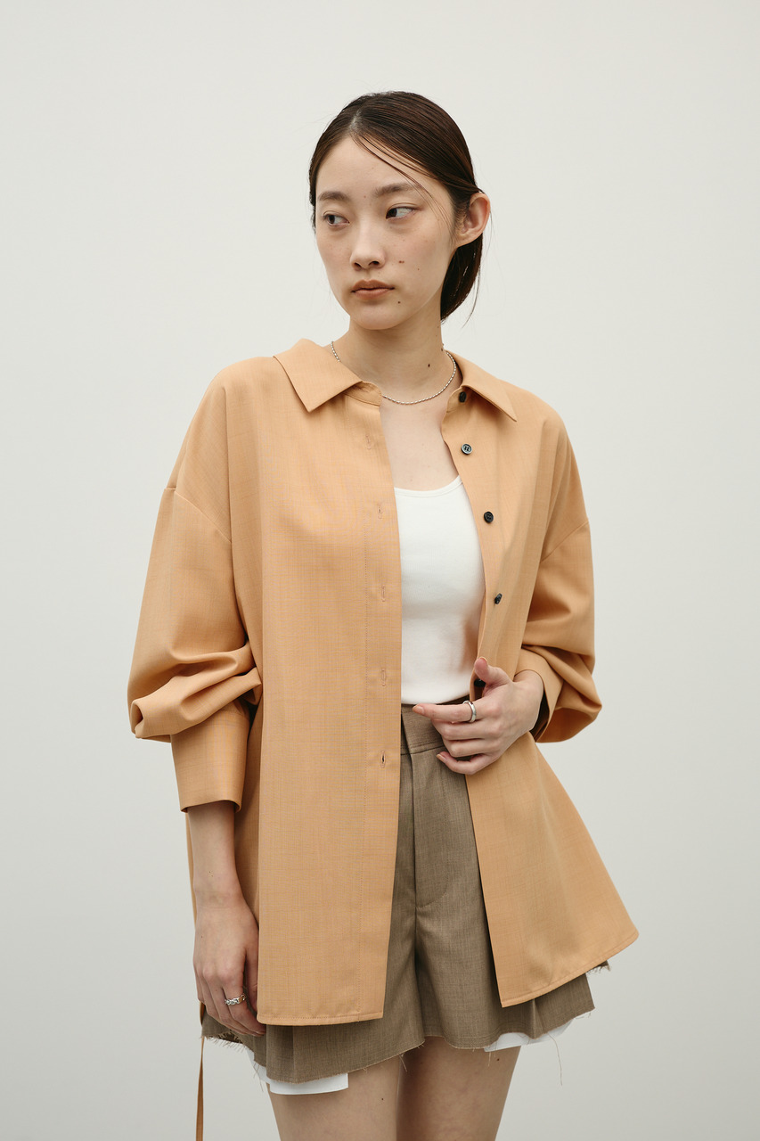 取り外し可能な共地紐がついたマニッシュカラーシャツ。ウエストのホールに紐を通してベルトとして使用したり、襟の下に巻いてチョーカーとしても使用でき、気分によってスタイリングをアレンジできます。サラッとした肌触りの良い素材なので、一枚でも羽織りとしてもオールシーズン使い回しできる万能シャツです。透け感あり、ストレッチなし。
