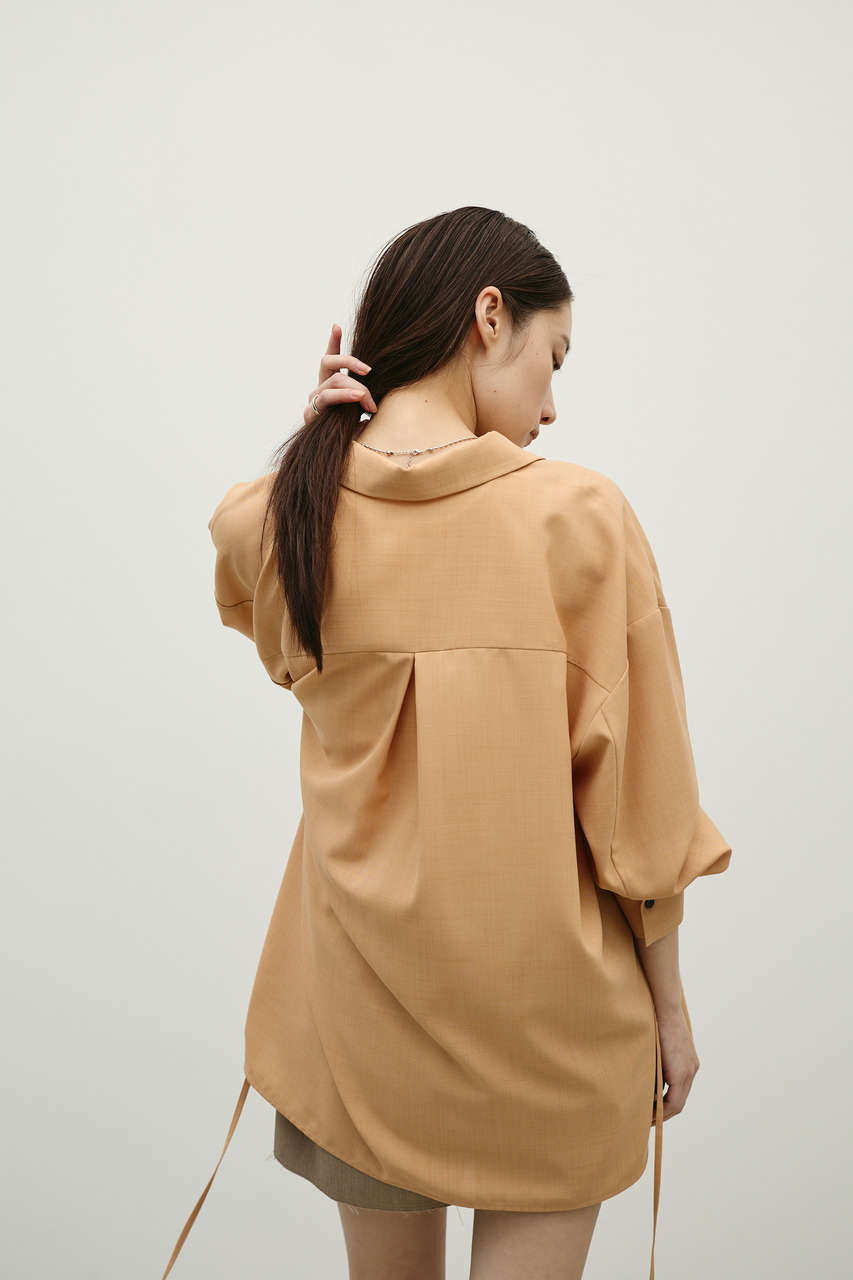 取り外し可能な共地紐がついたマニッシュカラーシャツ。ウエストのホールに紐を通してベルトとして使用したり、襟の下に巻いてチョーカーとしても使用でき、気分によってスタイリングをアレンジできます。サラッとした肌触りの良い素材なので、一枚でも羽織りとしてもオールシーズン使い回しできる万能シャツです。透け感あり、ストレッチなし。