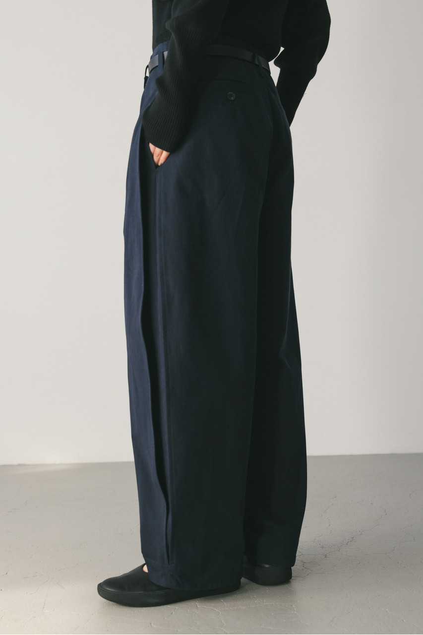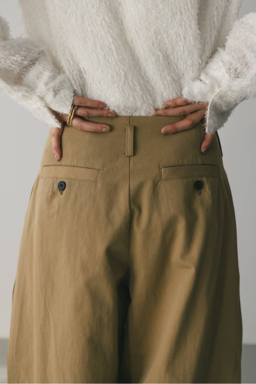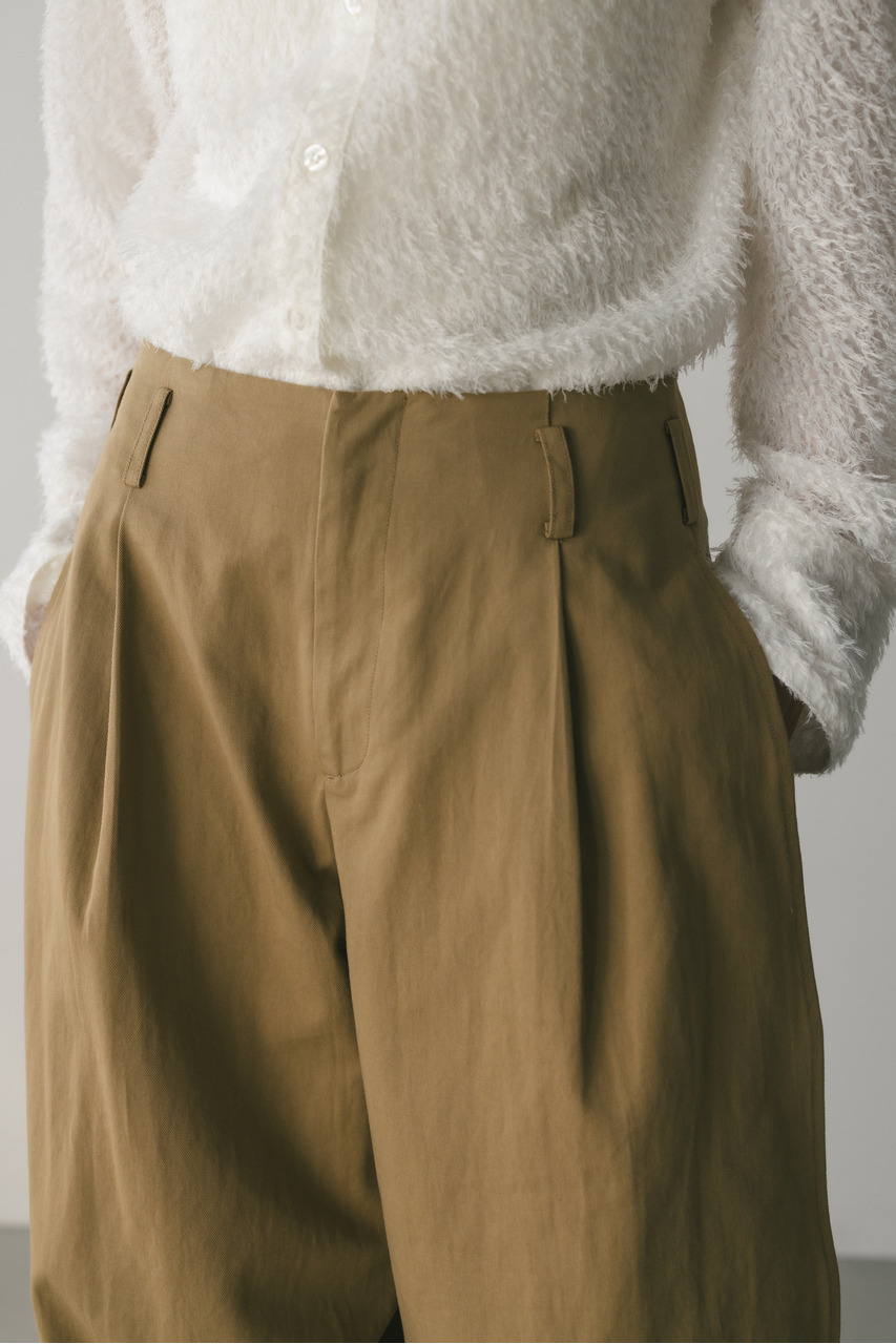 サイドに深いタックを入れたフォルムパンツ。コットンチノ素材を使用したローウエストデザインでルーズなシルエットがポイント。シルエットで新しさを出したスタミキらしいボトムです。透け感なし、ストレッチなし。
