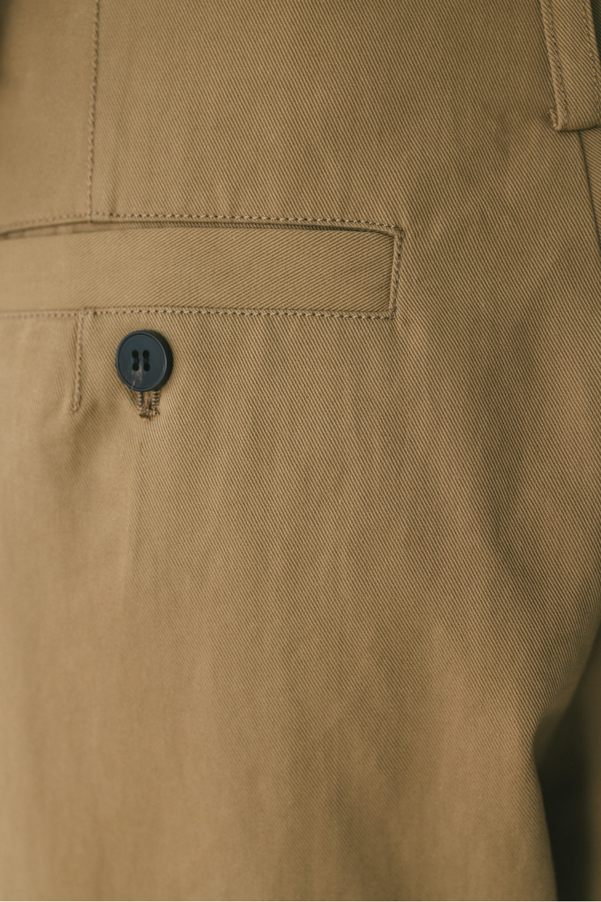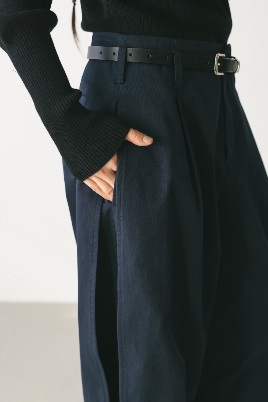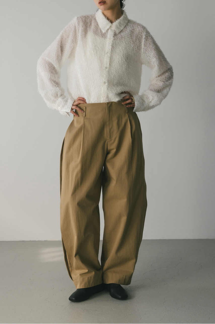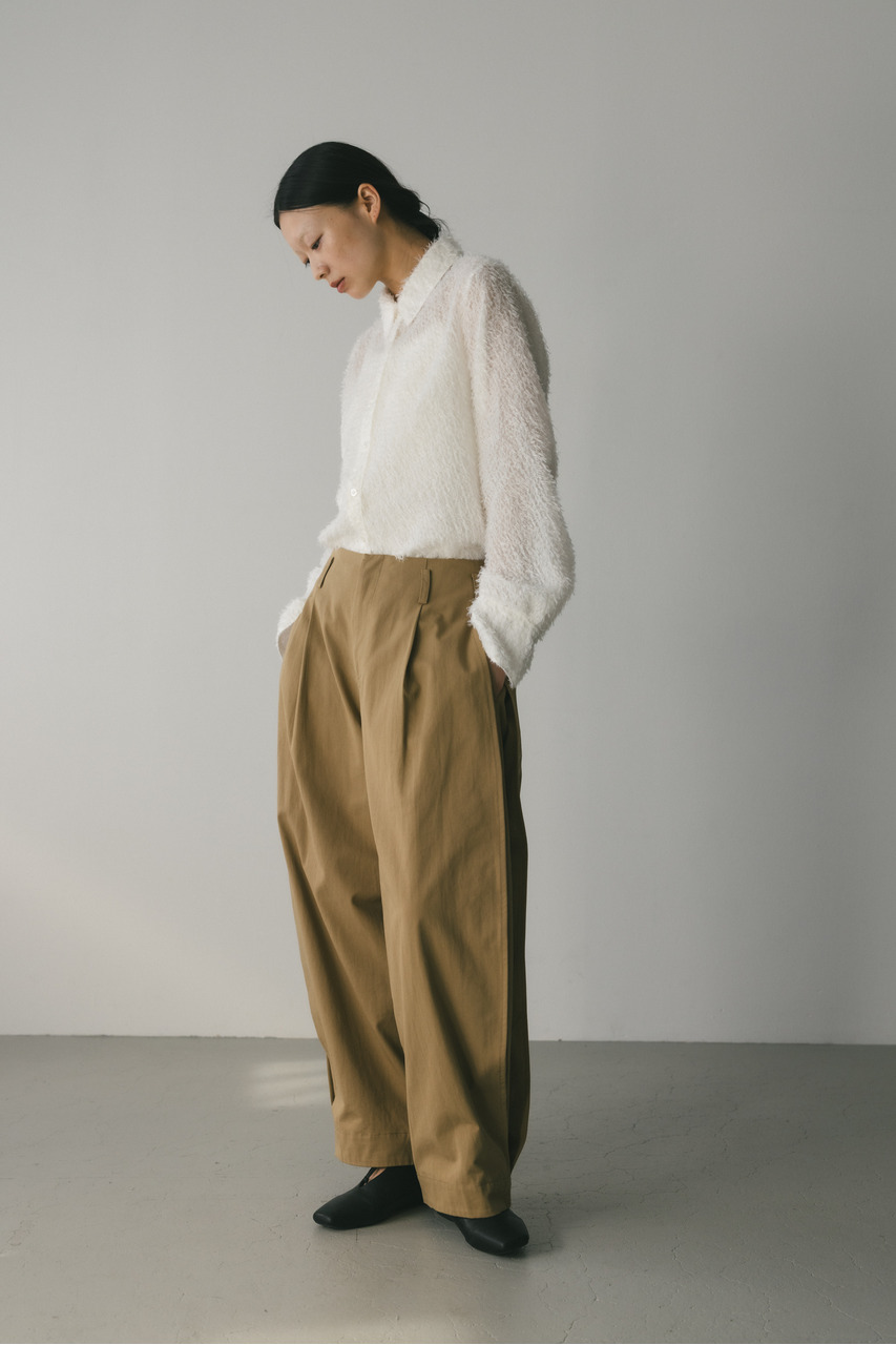 サイドに深いタックを入れたフォルムパンツ。コットンチノ素材を使用したローウエストデザインでルーズなシルエットがポイント。シルエットで新しさを出したスタミキらしいボトムです。透け感なし、ストレッチなし。