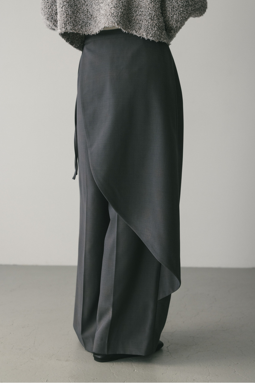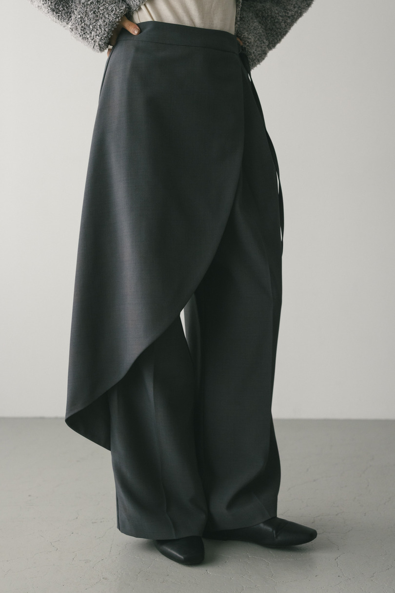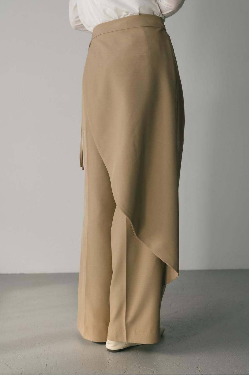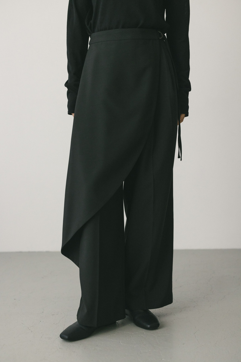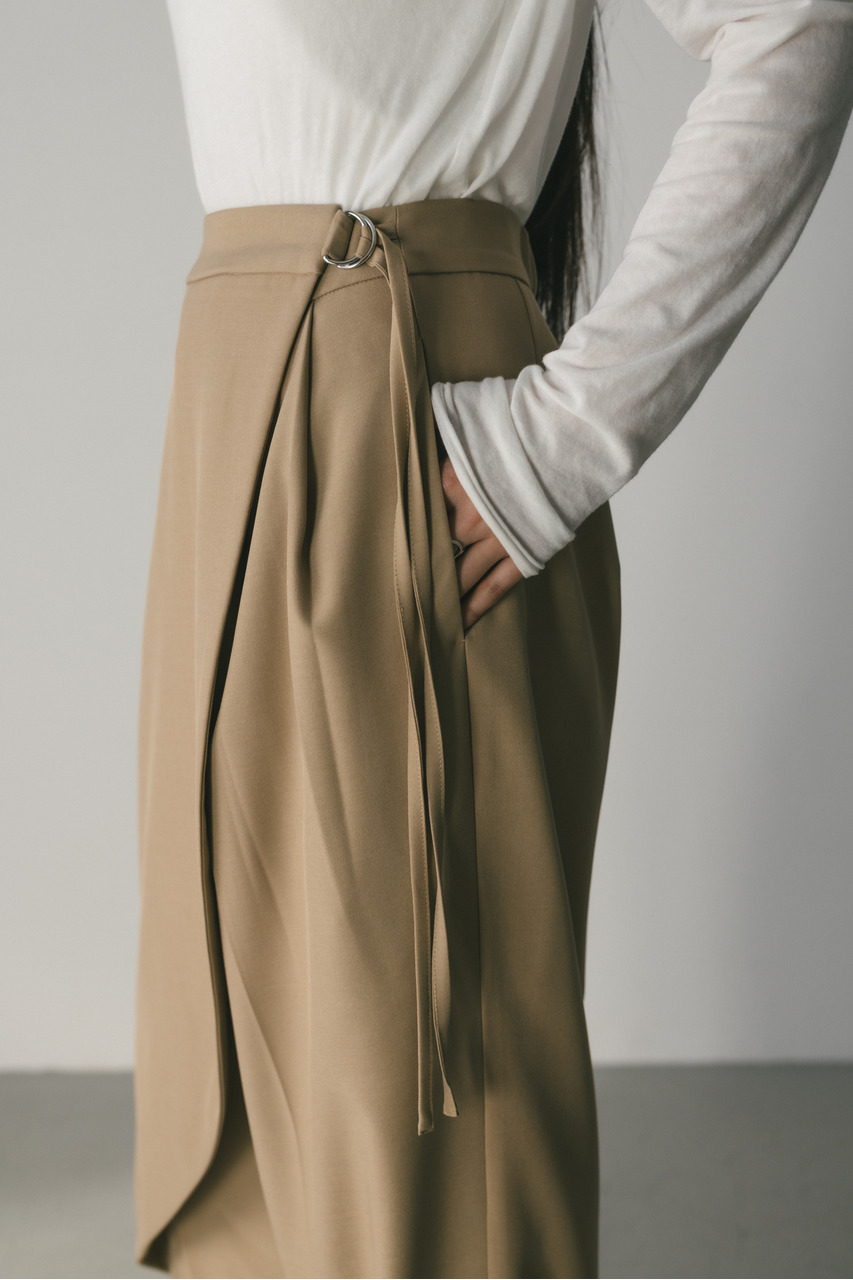 さらっとしたモードな表情感の素材を使用したサイドラップワイドパンツ。深いアシメデザインのラップとワイドシルエットのパンツはヒップ周りを自然にすっきりとカバーできるスタイルアップ効果の高いパンツです。左脇ベルト部分は細い2本の紐ベルトになっており、他にはないスタミキらしいデザインに仕上げました。ストレッチなし、透け感なし。