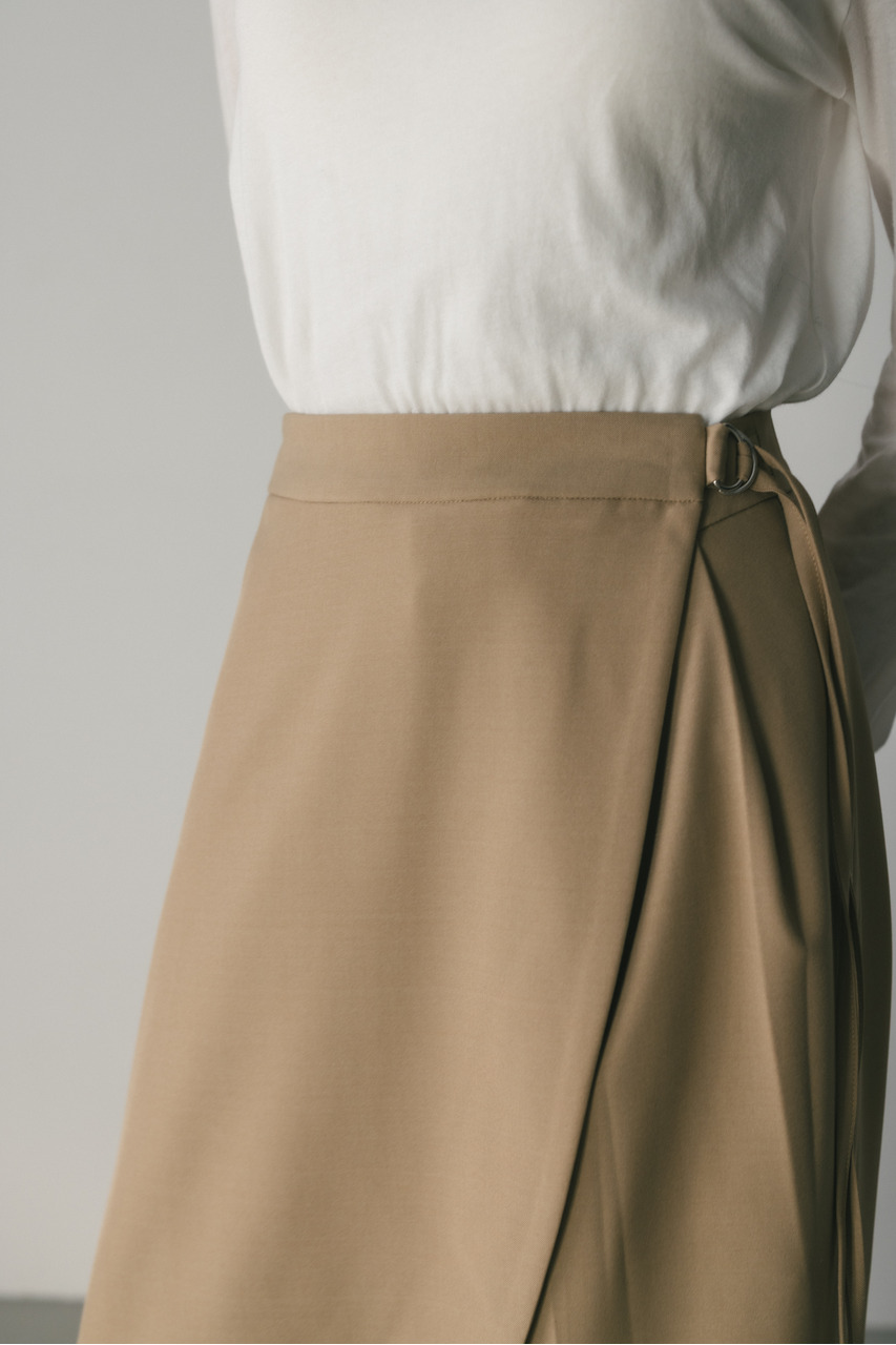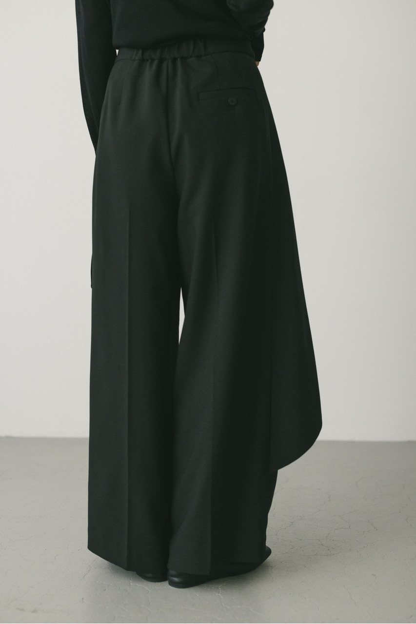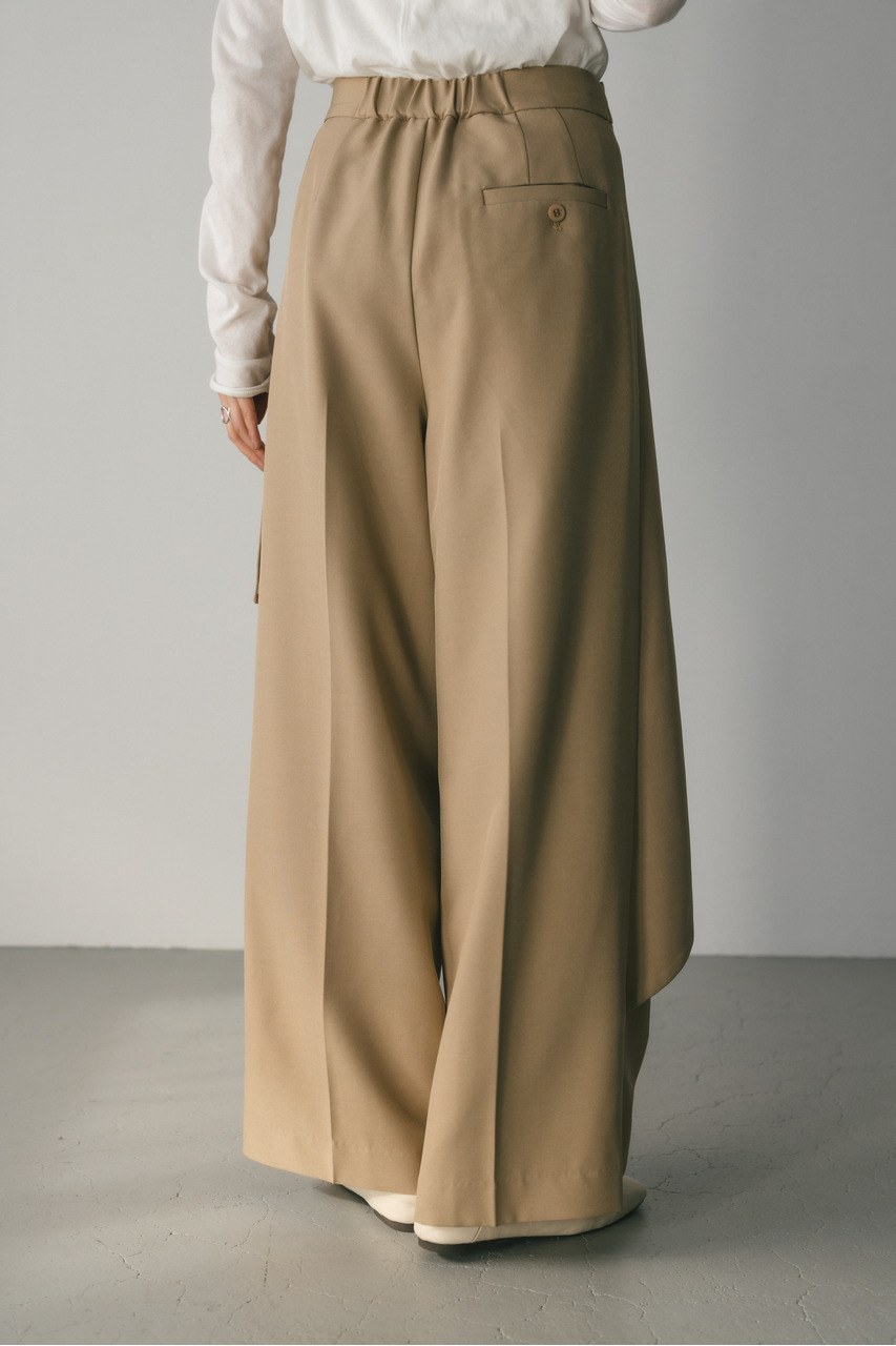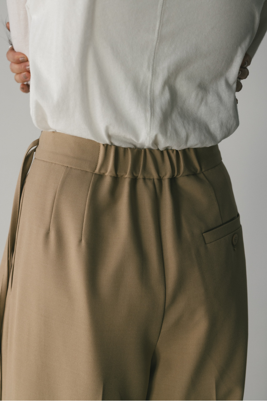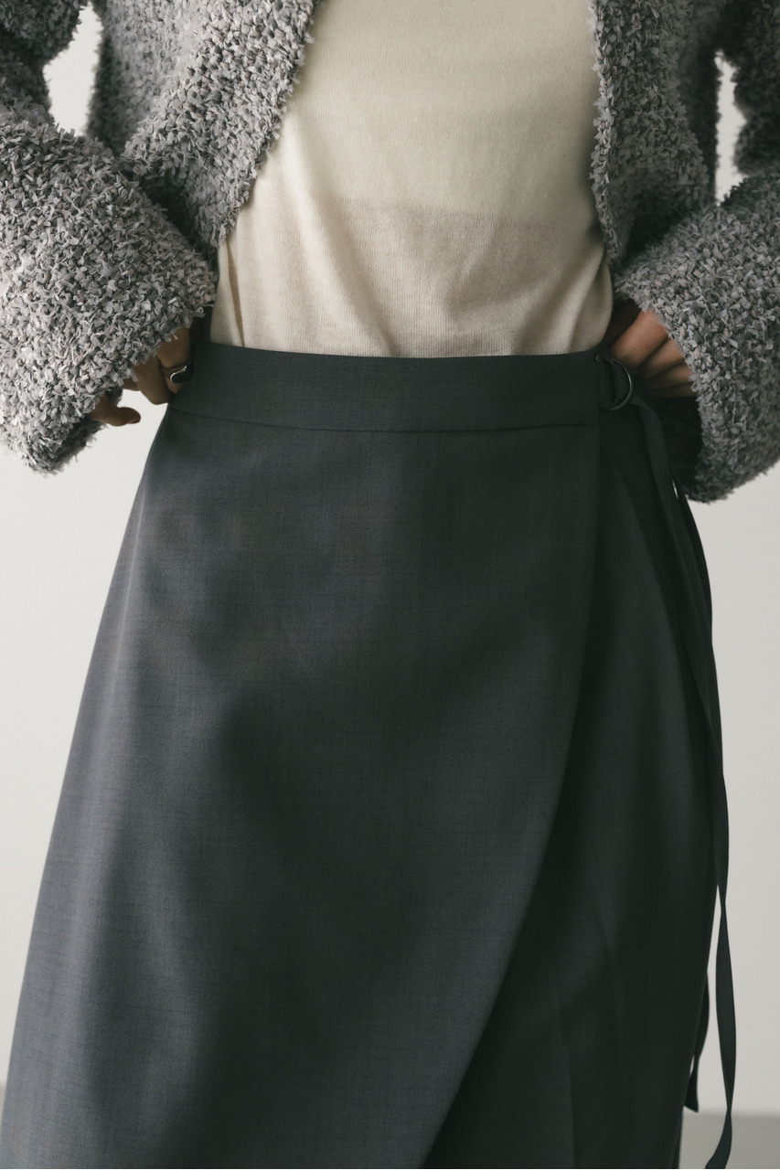 さらっとしたモードな表情感の素材を使用したサイドラップワイドパンツ。深いアシメデザインのラップとワイドシルエットのパンツはヒップ周りを自然にすっきりとカバーできるスタイルアップ効果の高いパンツです。左脇ベルト部分は細い2本の紐ベルトになっており、他にはないスタミキらしいデザインに仕上げました。ストレッチなし、透け感なし。