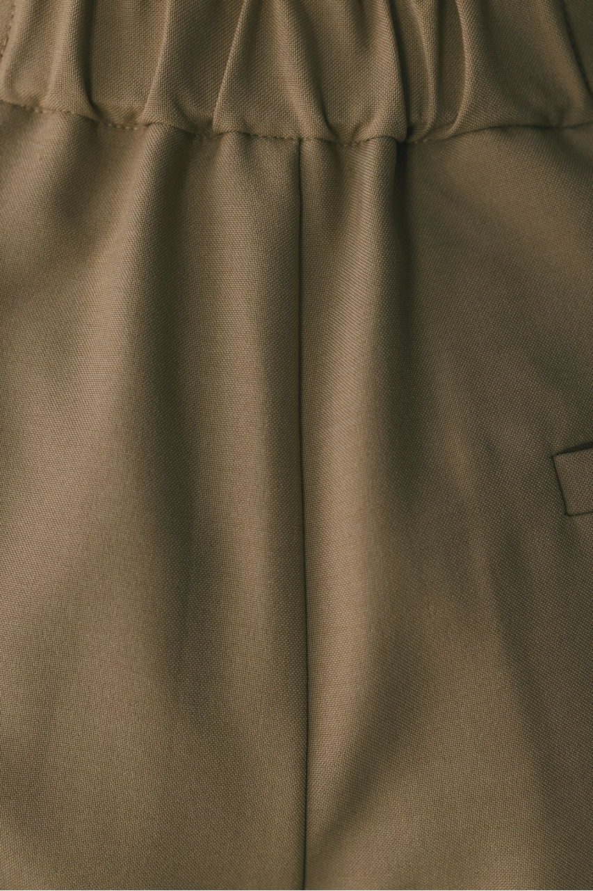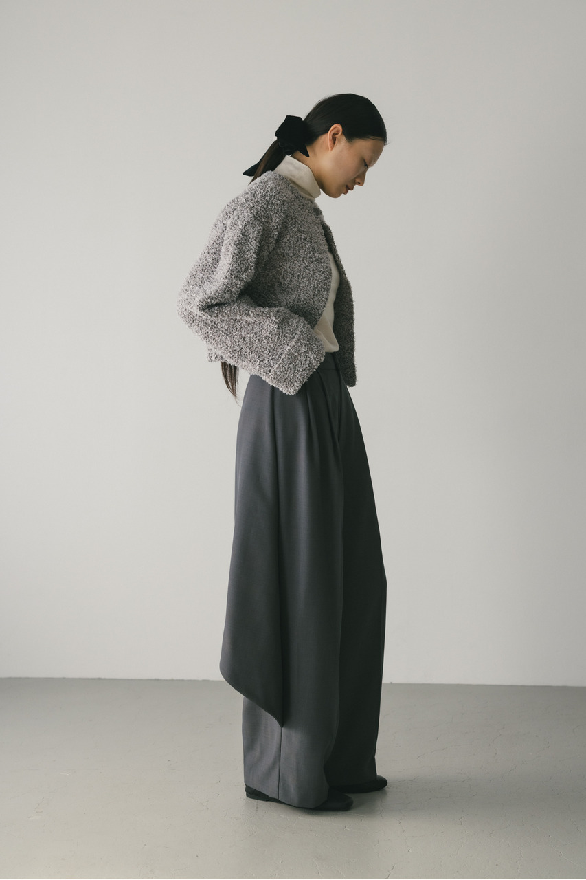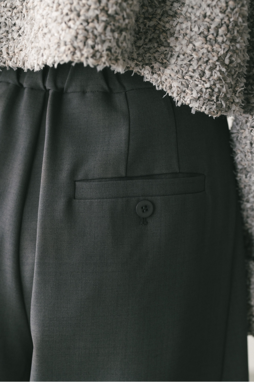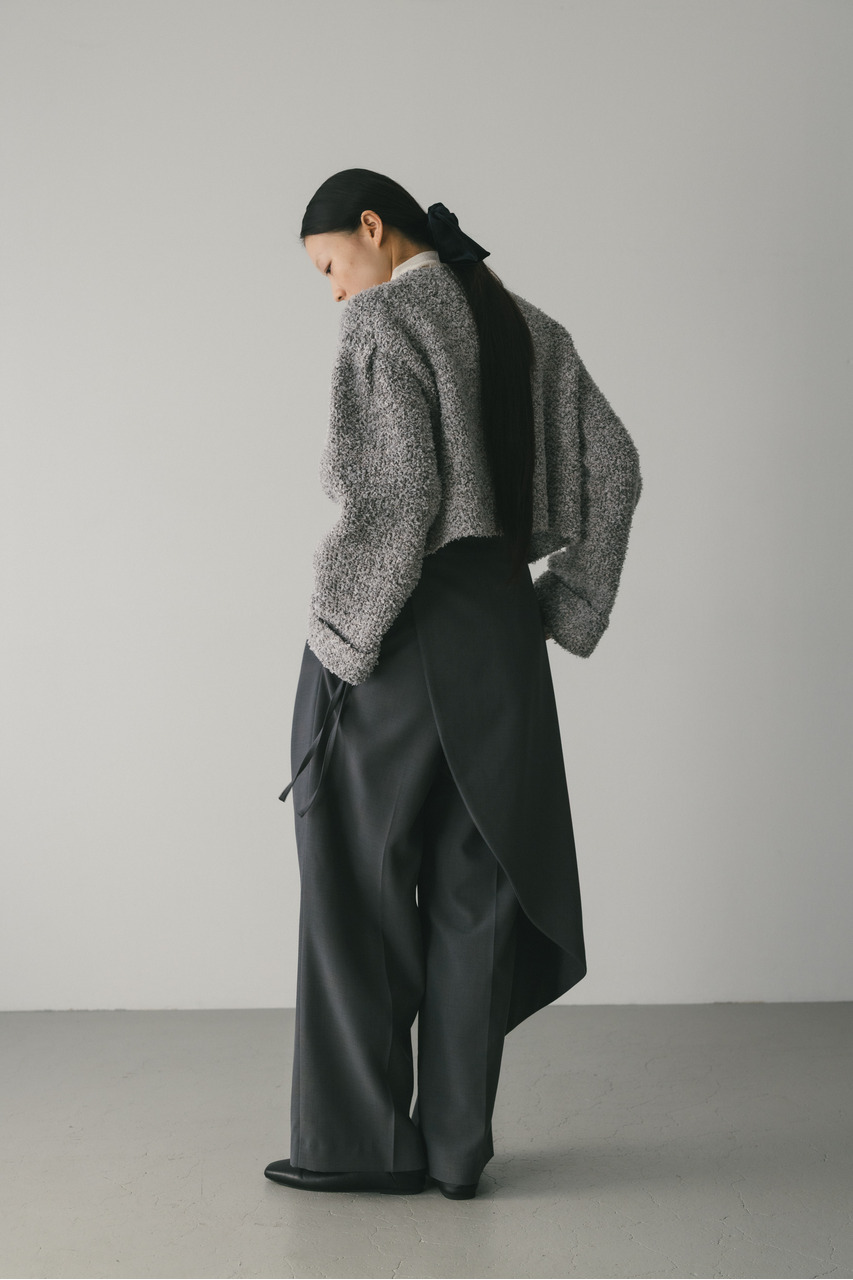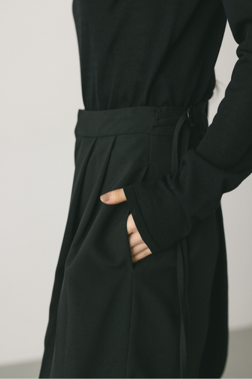 さらっとしたモードな表情感の素材を使用したサイドラップワイドパンツ。深いアシメデザインのラップとワイドシルエットのパンツはヒップ周りを自然にすっきりとカバーできるスタイルアップ効果の高いパンツです。左脇ベルト部分は細い2本の紐ベルトになっており、他にはないスタミキらしいデザインに仕上げました。ストレッチなし、透け感なし。