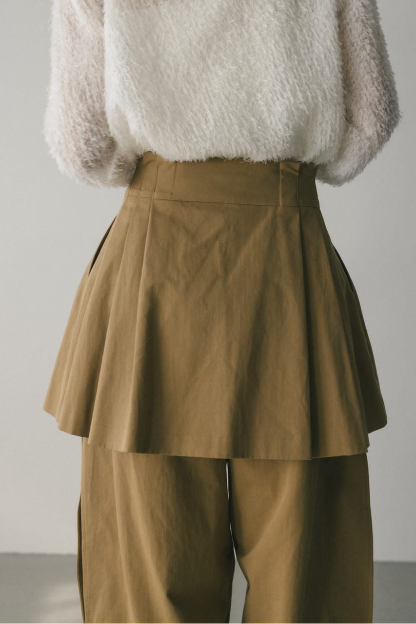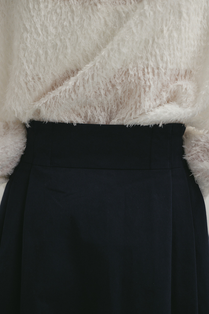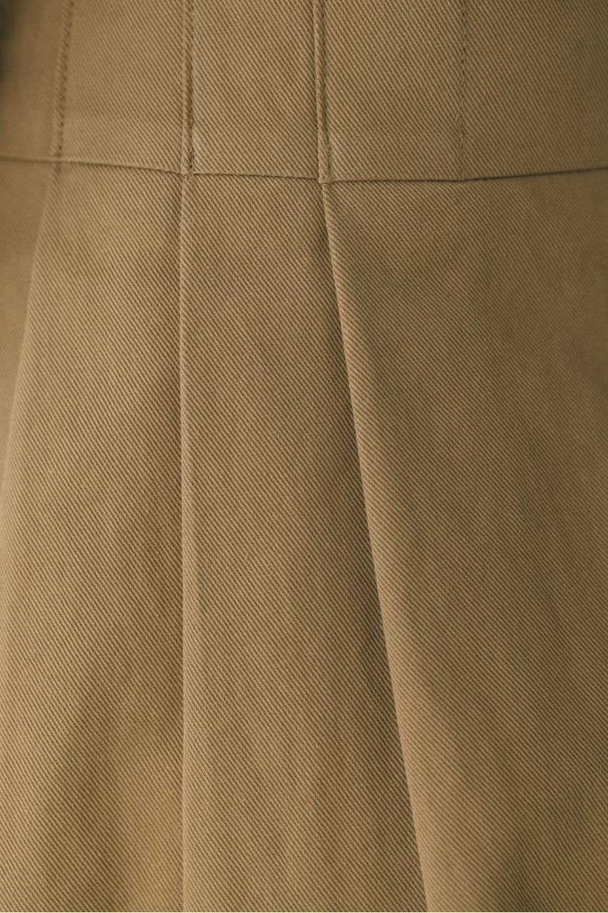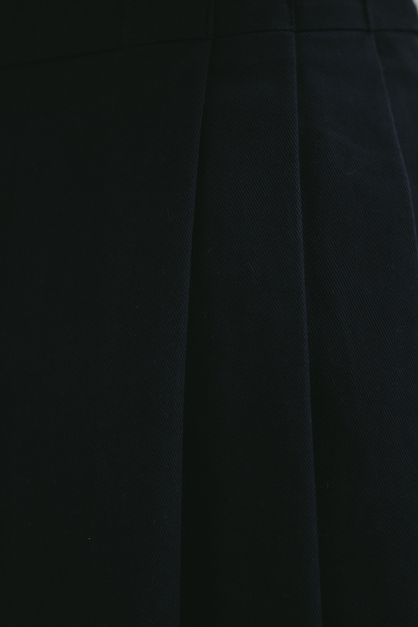 タックをたっぷりと入れたミニスカート。カジュアルなコットンチノ素材を使用することで甘すぎず大人モードな雰囲気で着ていただけます。短めな丈感とAラインのシルエットで足長効果抜群な一枚です。500JSA31-1351(サイドタックフォルムパンツ)とのレイヤードスタイリングもおすすめです。透け感なし、ストレッチなし。