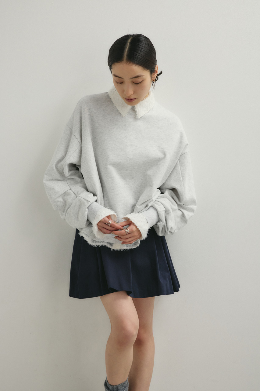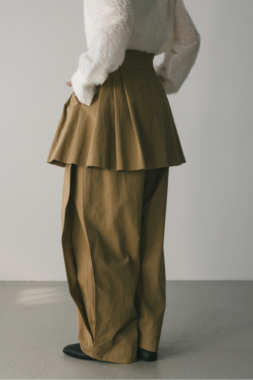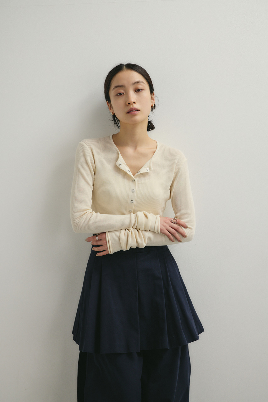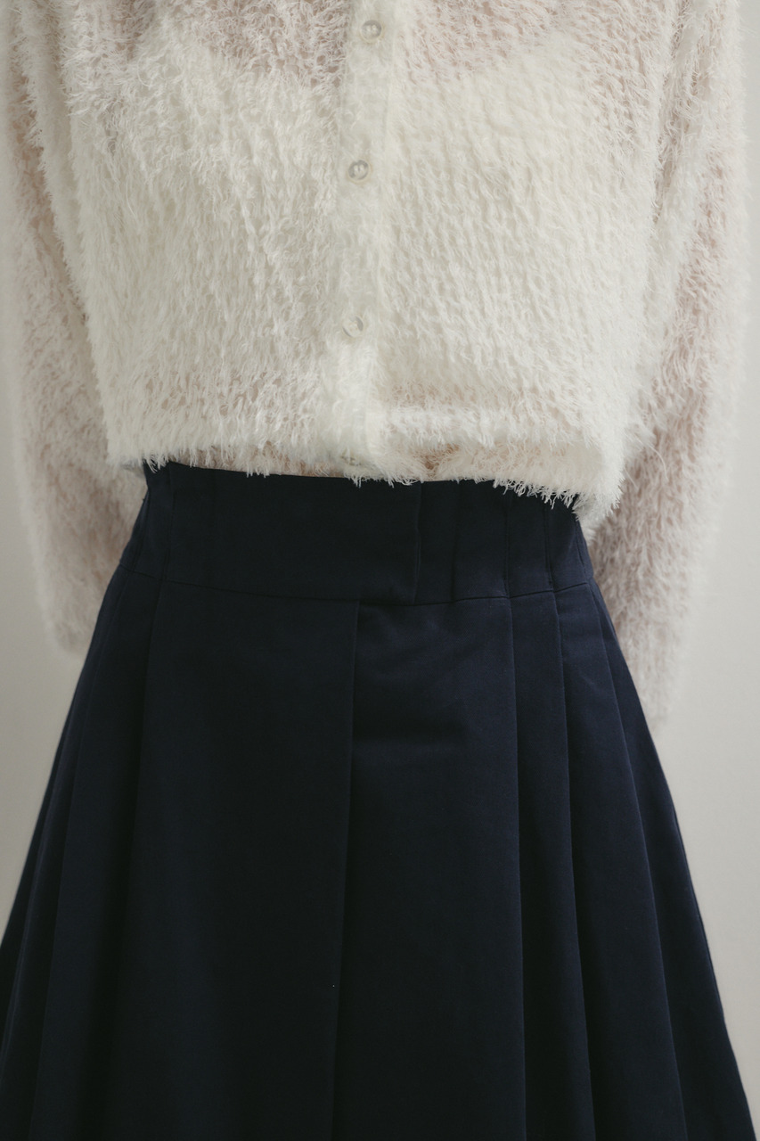 タックをたっぷりと入れたミニスカート。カジュアルなコットンチノ素材を使用することで甘すぎず大人モードな雰囲気で着ていただけます。短めな丈感とAラインのシルエットで足長効果抜群な一枚です。500JSA31-1351(サイドタックフォルムパンツ)とのレイヤードスタイリングもおすすめです。透け感なし、ストレッチなし。
