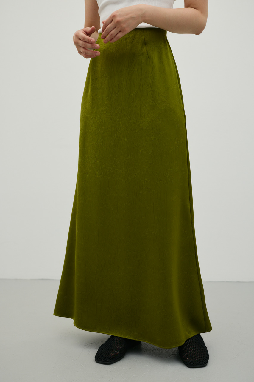 表面感のあるクラッシュサテン素材を使用した上品な光沢が魅力のマーメードスカート。動くたびに揺れるシルエットが、女性らしさを引き立てます。ウエスト内側ゴム入りで快適な着心地実現。裏地付きで安心感もあり、デイリーからきれいめスタイルまで幅広く活躍する一枚です。透け感なし、ストレッチなし。
