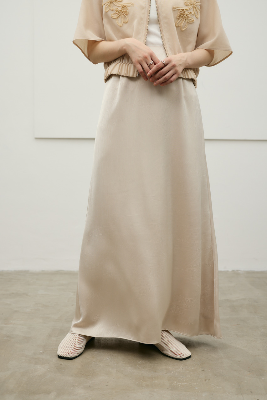 表面感のあるクラッシュサテン素材を使用した上品な光沢が魅力のマーメードスカート。動くたびに揺れるシルエットが、女性らしさを引き立てます。ウエスト内側ゴム入りで快適な着心地実現。裏地付きで安心感もあり、デイリーからきれいめスタイルまで幅広く活躍する一枚です。透け感なし、ストレッチなし。