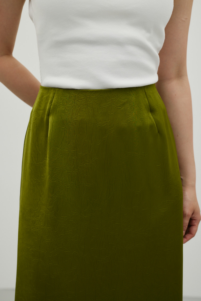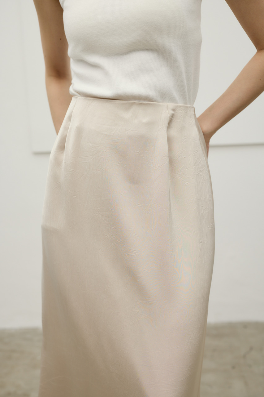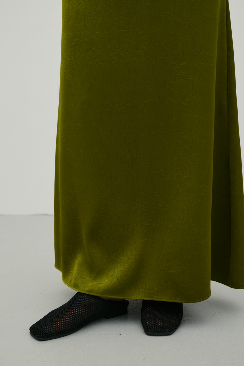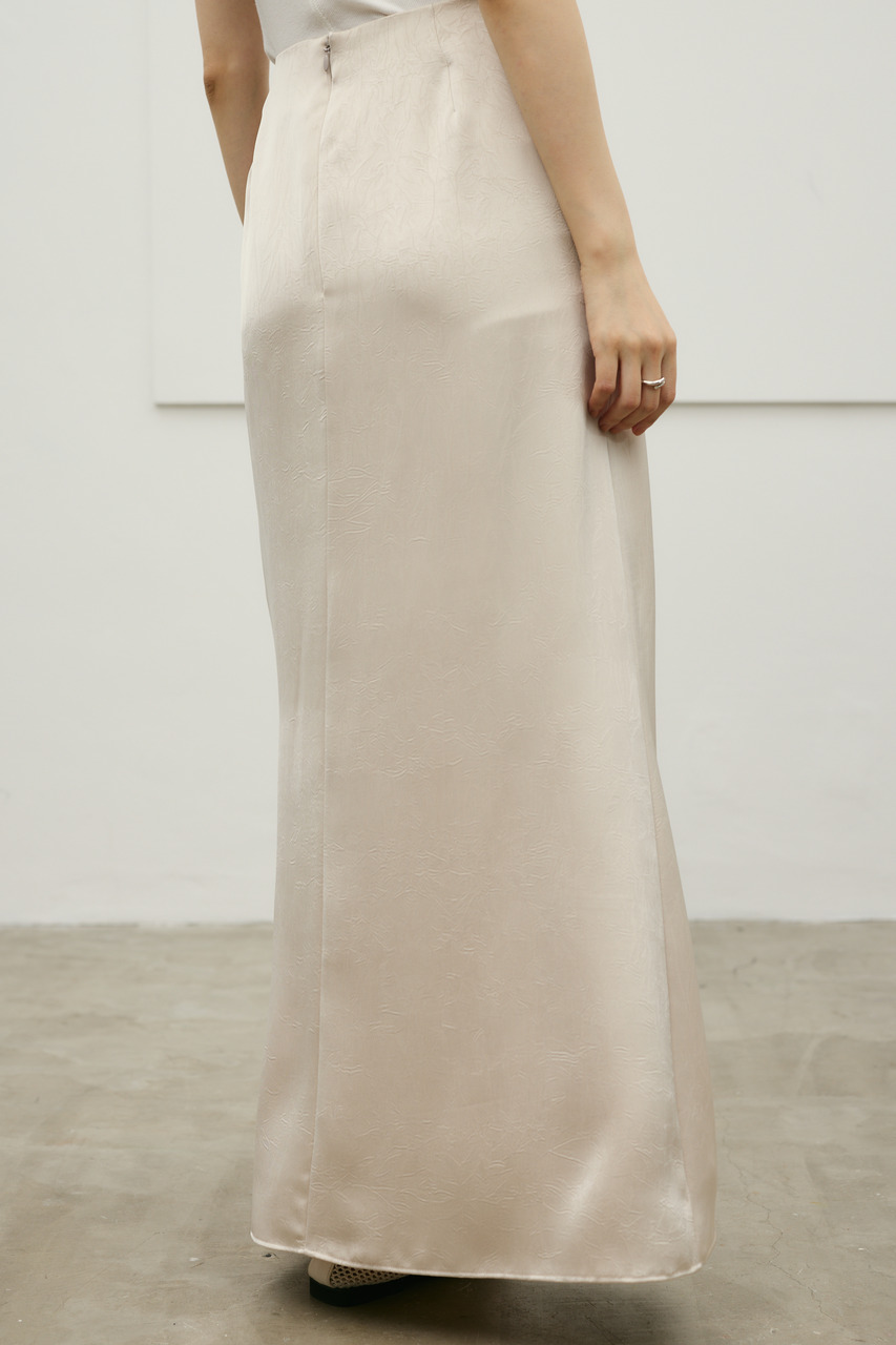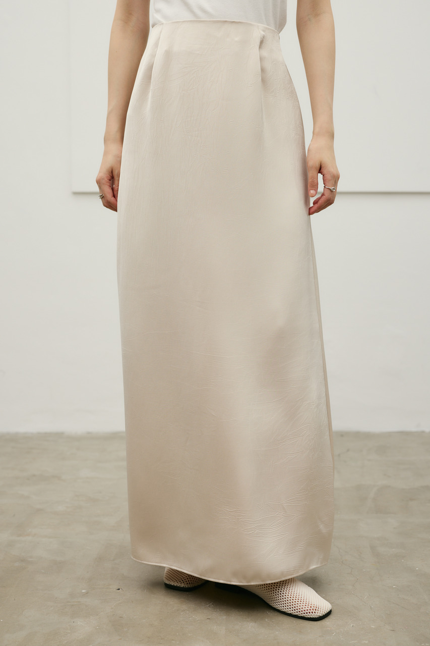 表面感のあるクラッシュサテン素材を使用した上品な光沢が魅力のマーメードスカート。動くたびに揺れるシルエットが、女性らしさを引き立てます。ウエスト内側ゴム入りで快適な着心地実現。裏地付きで安心感もあり、デイリーからきれいめスタイルまで幅広く活躍する一枚です。透け感なし、ストレッチなし。