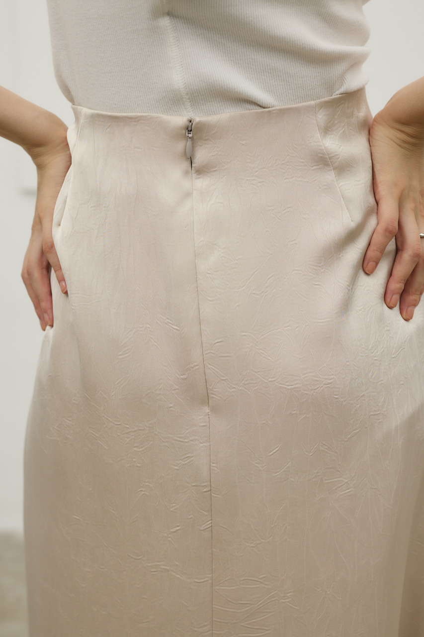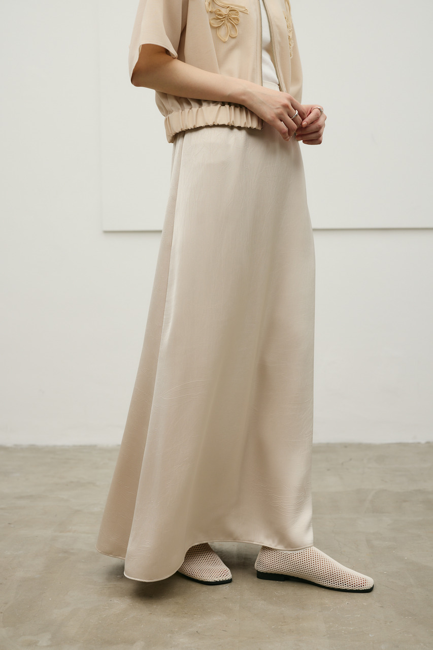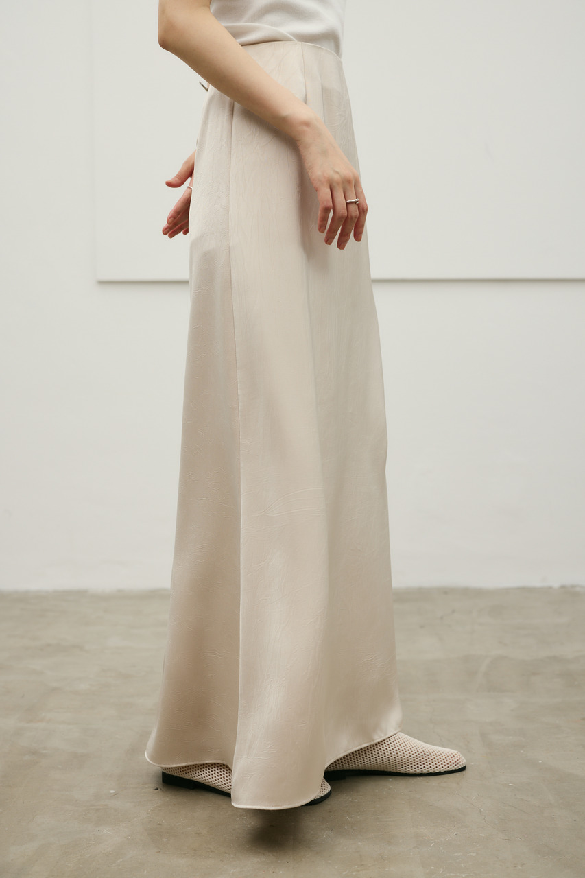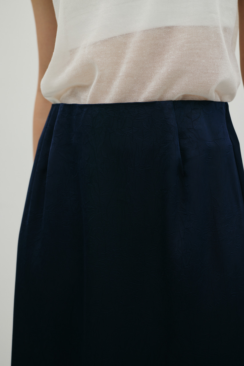 表面感のあるクラッシュサテン素材を使用した上品な光沢が魅力のマーメードスカート。動くたびに揺れるシルエットが、女性らしさを引き立てます。ウエスト内側ゴム入りで快適な着心地実現。裏地付きで安心感もあり、デイリーからきれいめスタイルまで幅広く活躍する一枚です。透け感なし、ストレッチなし。