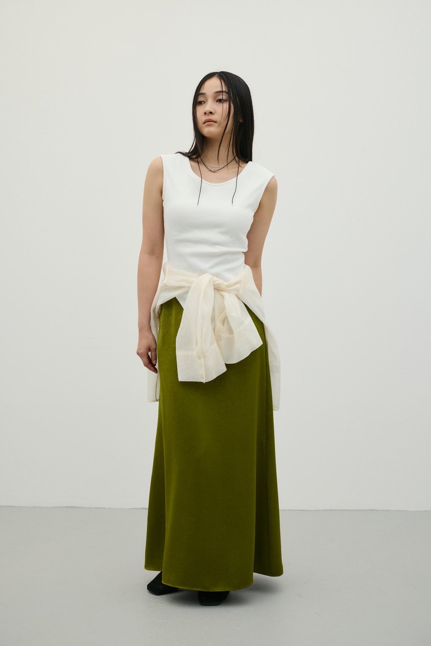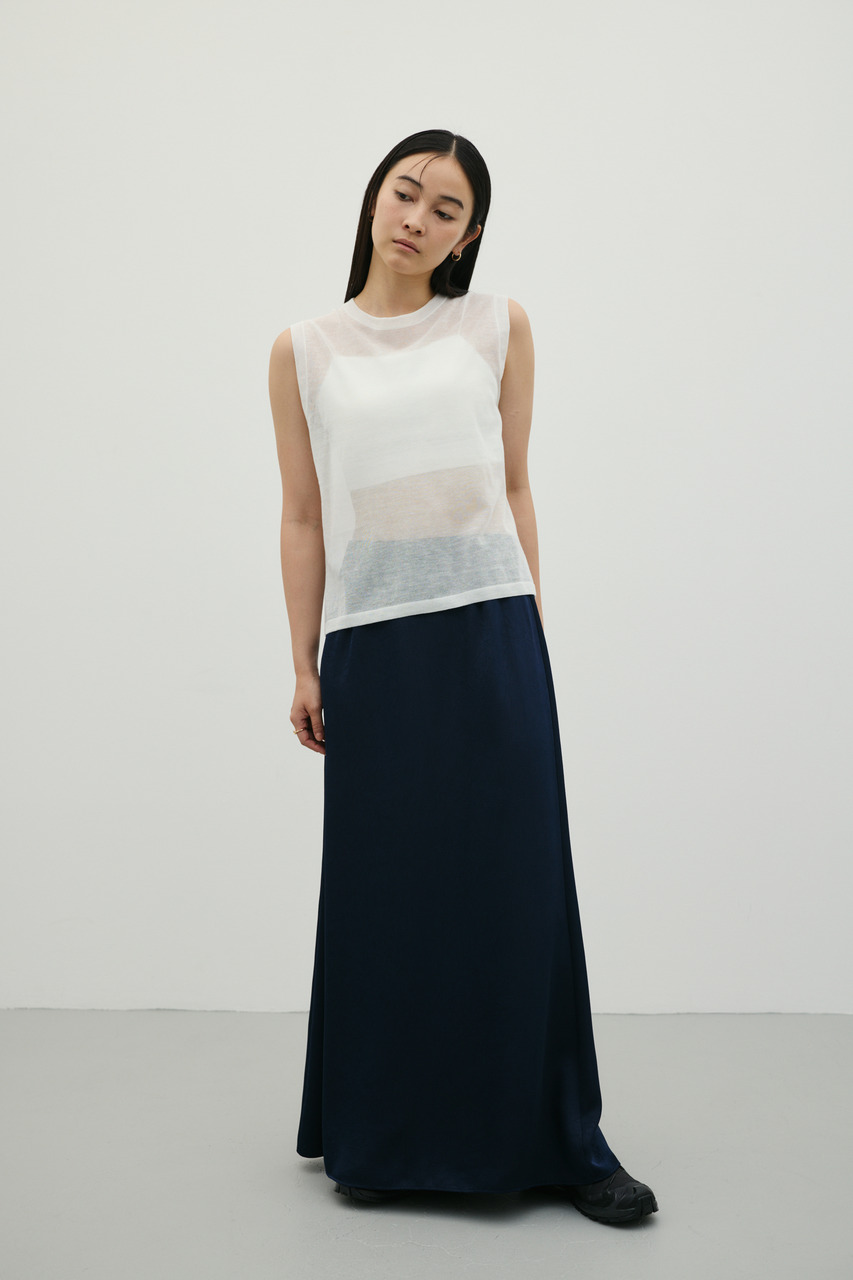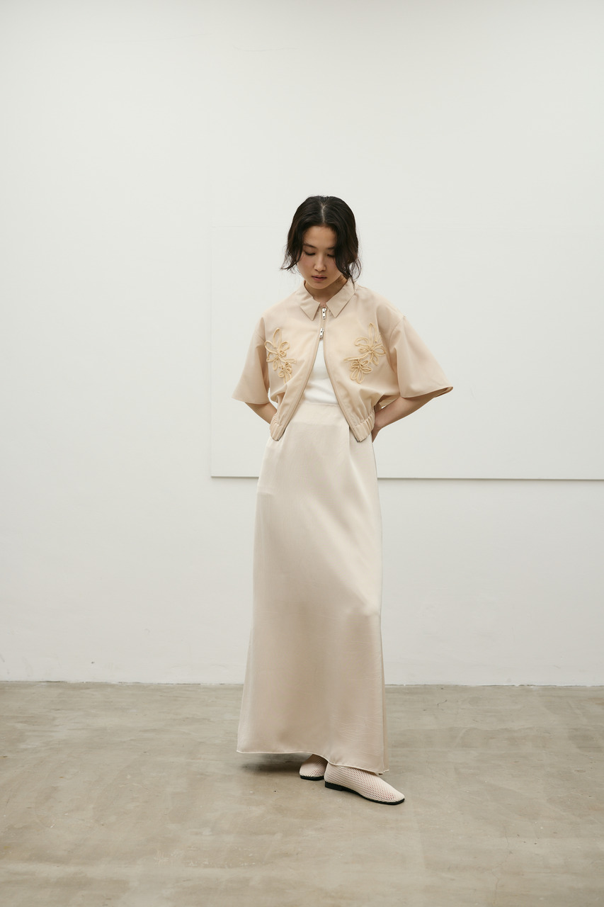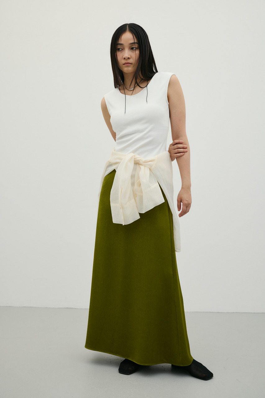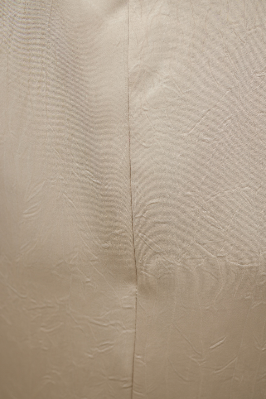 表面感のあるクラッシュサテン素材を使用した上品な光沢が魅力のマーメードスカート。動くたびに揺れるシルエットが、女性らしさを引き立てます。ウエスト内側ゴム入りで快適な着心地実現。裏地付きで安心感もあり、デイリーからきれいめスタイルまで幅広く活躍する一枚です。透け感なし、ストレッチなし。