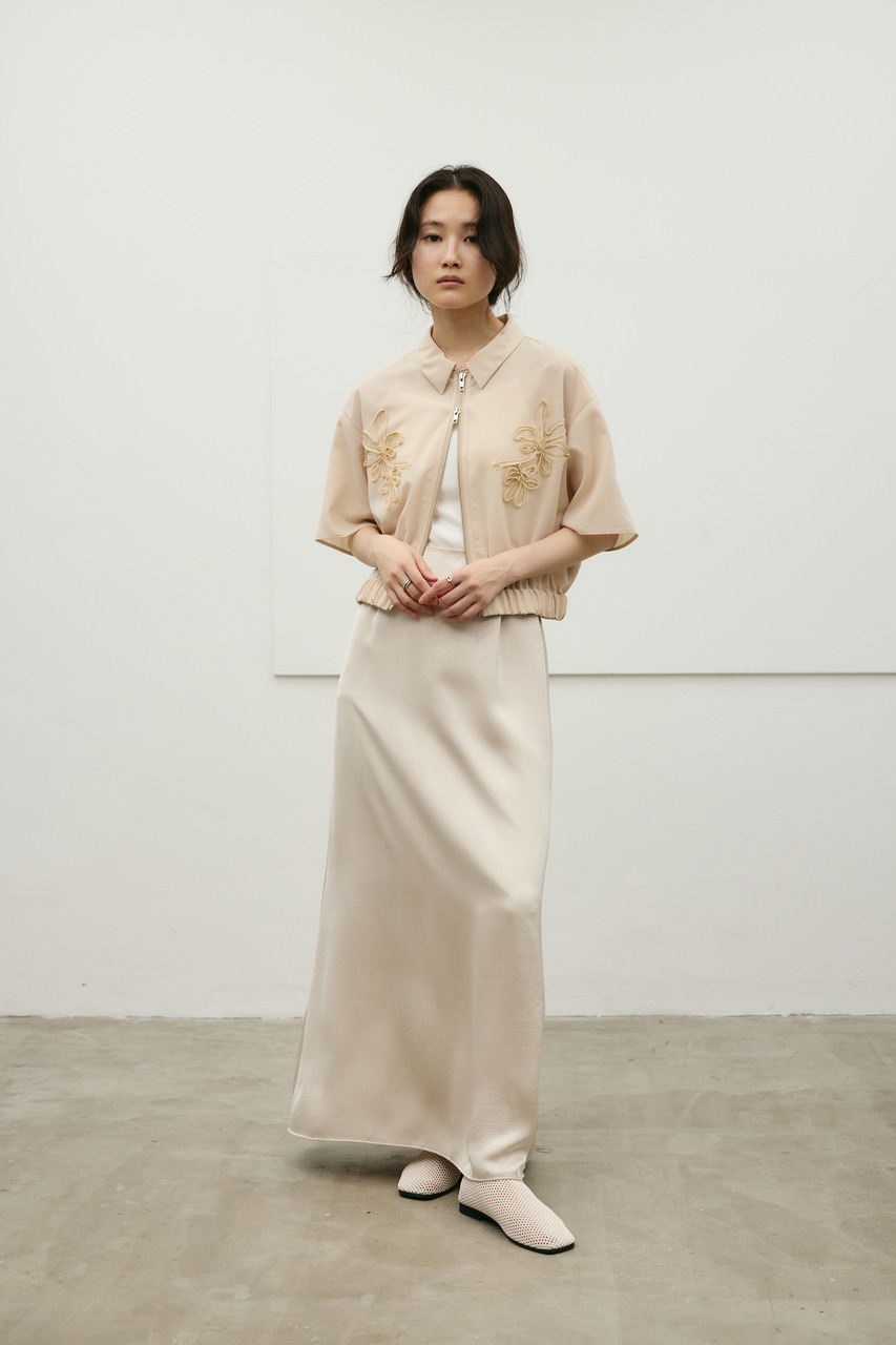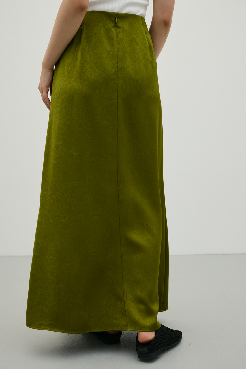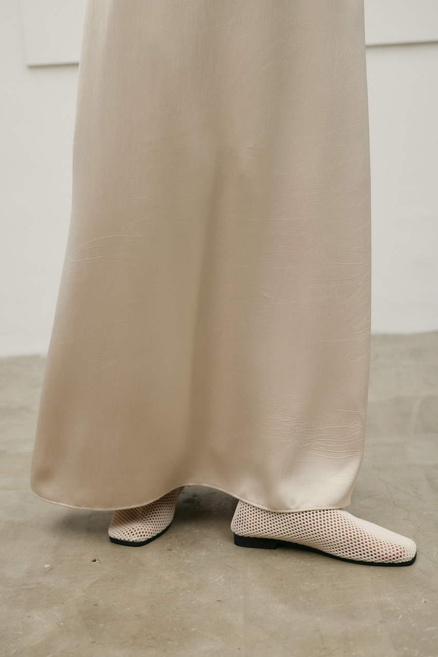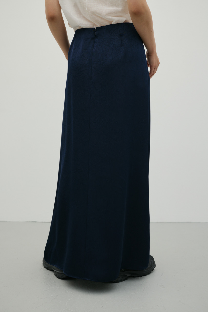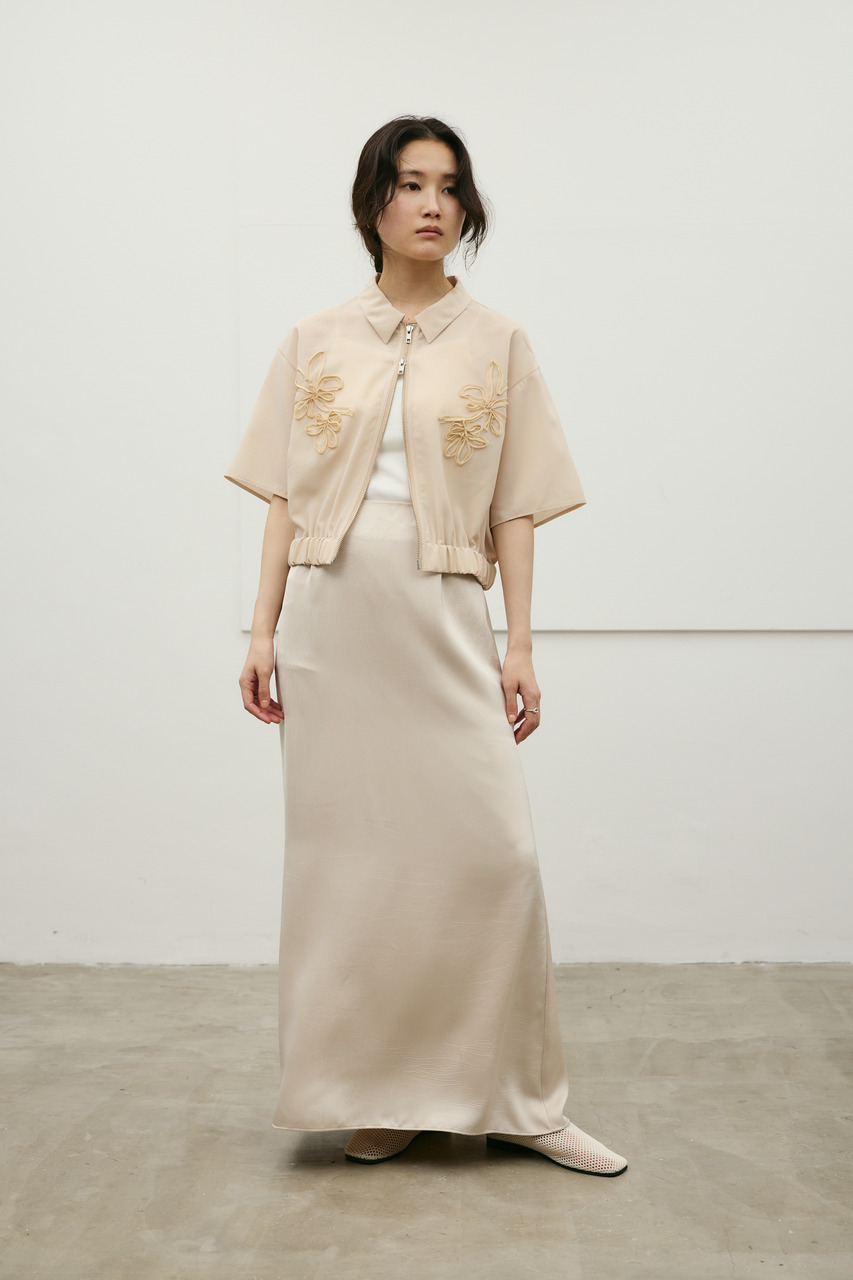 表面感のあるクラッシュサテン素材を使用した上品な光沢が魅力のマーメードスカート。動くたびに揺れるシルエットが、女性らしさを引き立てます。ウエスト内側ゴム入りで快適な着心地実現。裏地付きで安心感もあり、デイリーからきれいめスタイルまで幅広く活躍する一枚です。透け感なし、ストレッチなし。