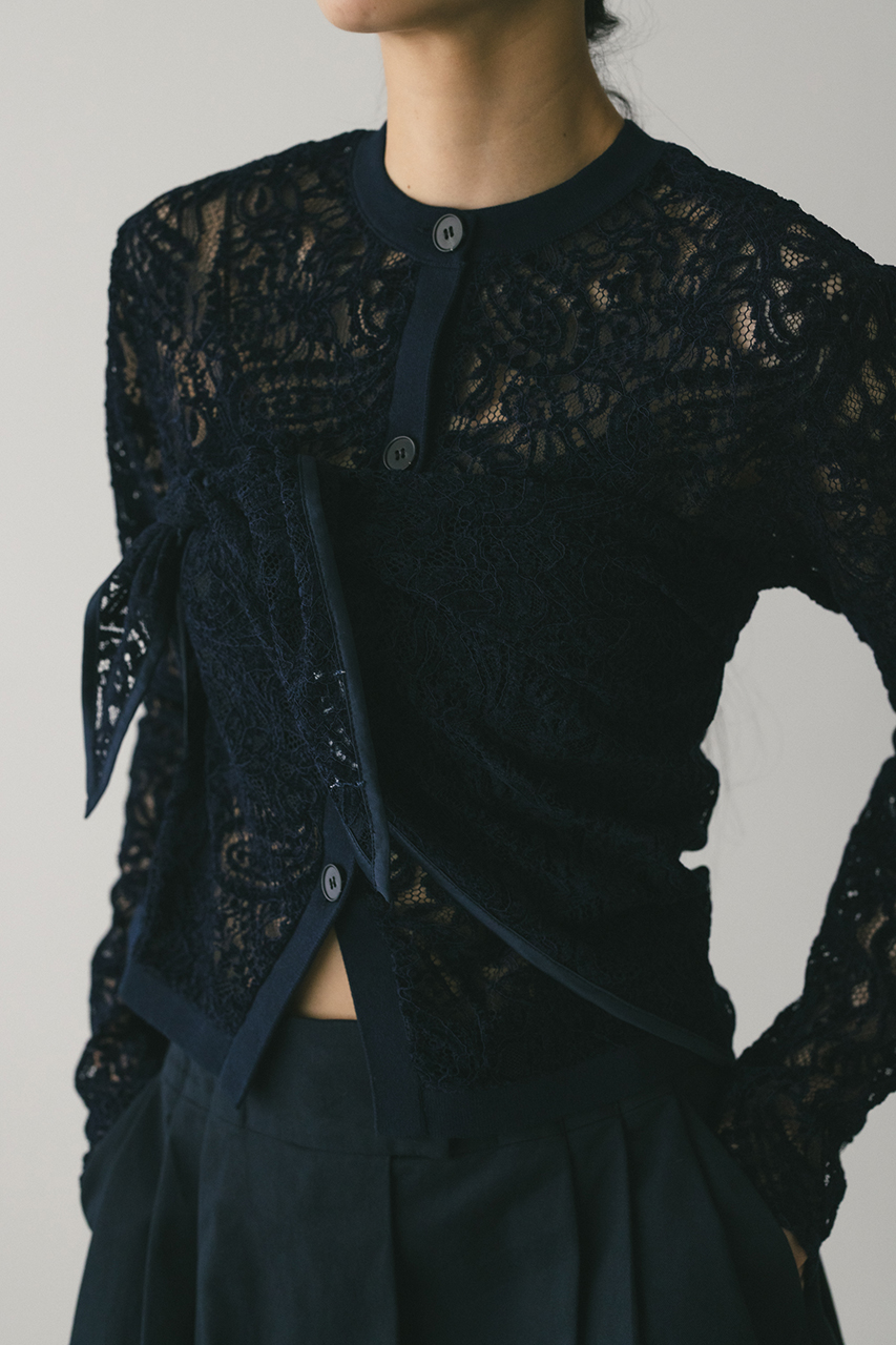 起毛レースを使用したトレンドのレーススカーフ。サテン素材でトリミングし上品な印象に仕上げました。頭に巻くのはもちろん、腰や首に巻くだけでぐっとこなれた印象に。500JSA70-0251(ニュアンスレースニットカーデ)とセットアップ着用可能。ストレッチなし、透け感あり