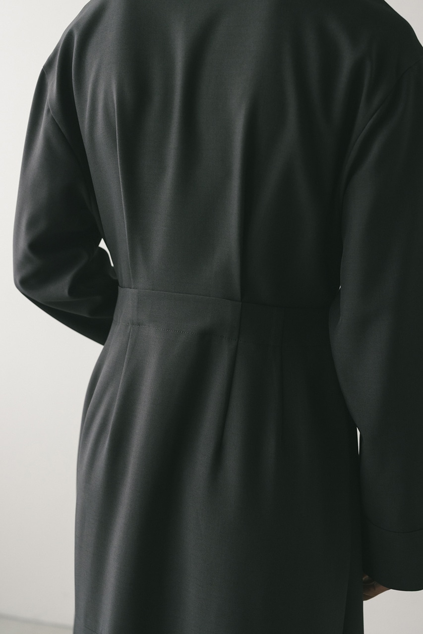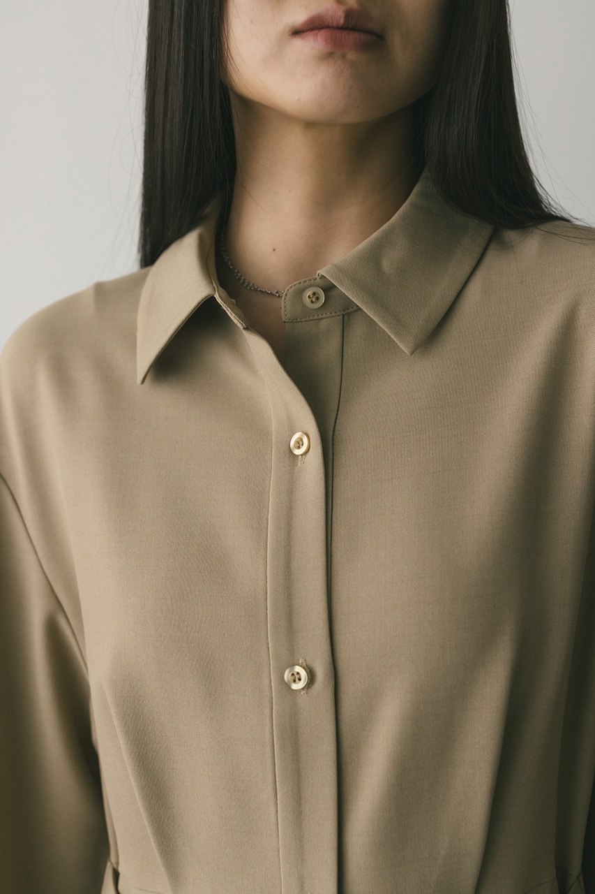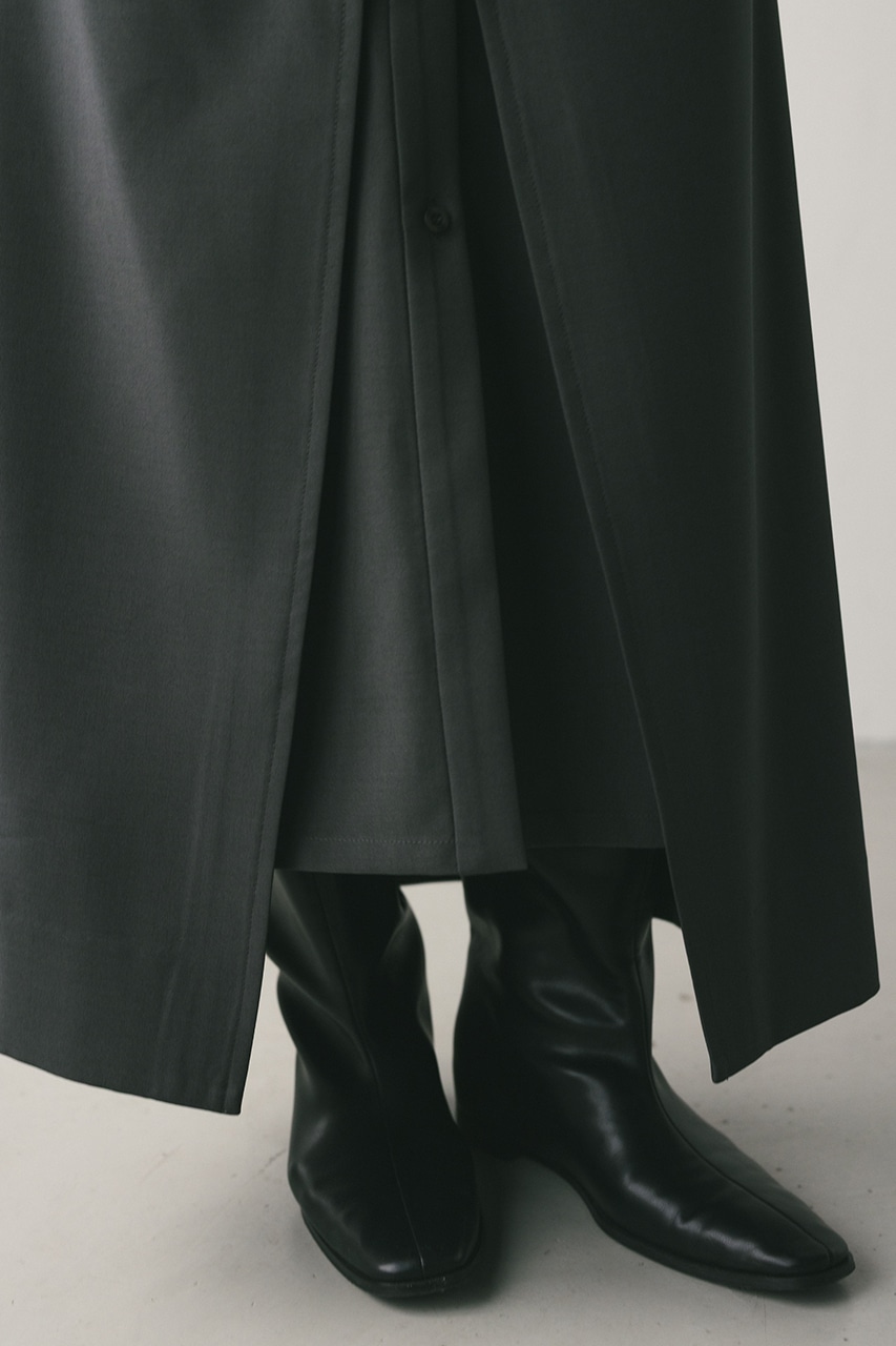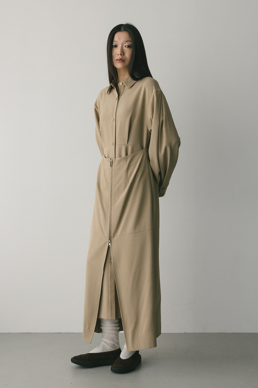 トレンドのスカートレイヤードスタイルが一枚で叶うシャツワンピース。ナローシルエットのボタンあきシャツワンピースにフロントファスナーあきのスカートがドッキングされており、モード感あふれるコーディネートを楽しめます。逆開ファスナー仕様で、好きな位置で開閉可能。上見頃ウエストや袖にはタックが施され、Iラインシルエットの中にもしっかりと立体感がプラスされたスタミキらしいフォルムにこだわったワンピースです。ストレッチややあり、透け感なし。