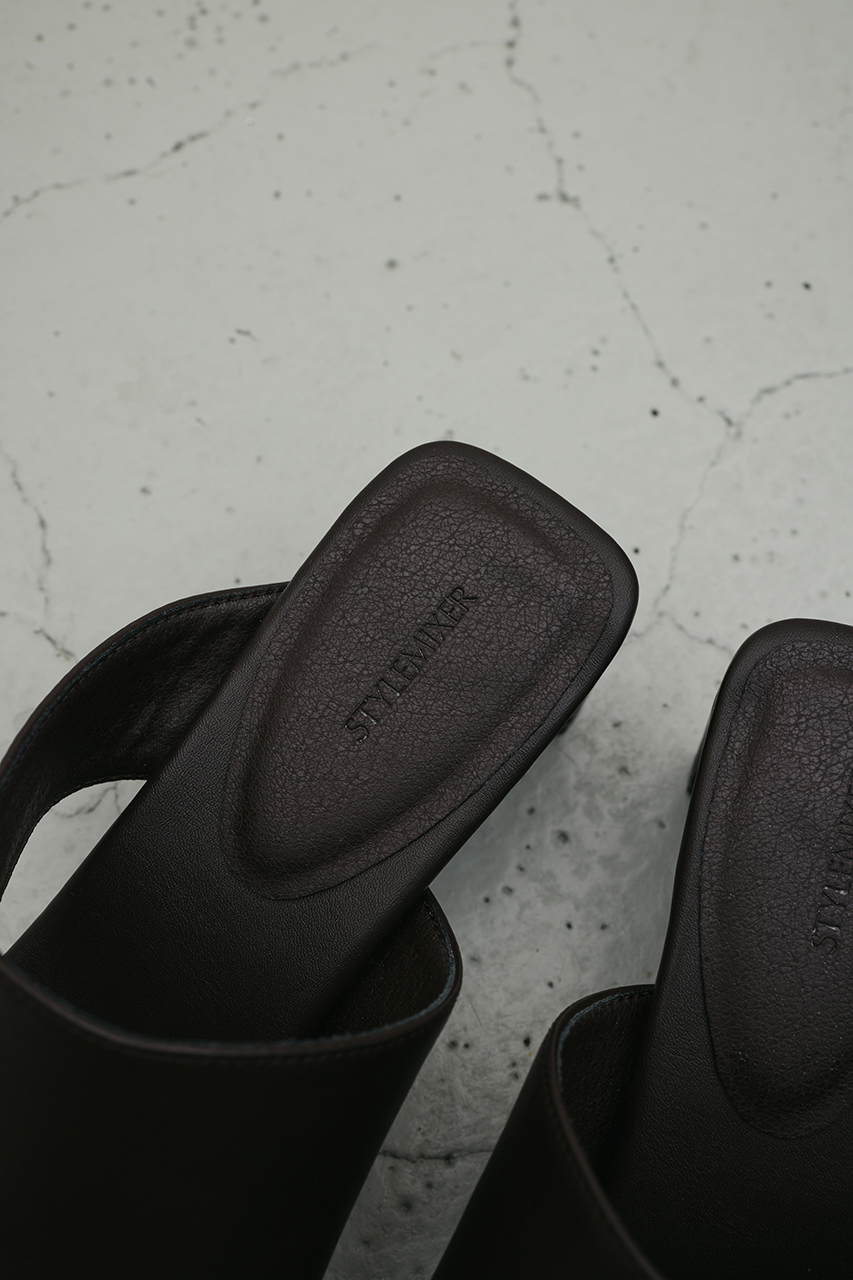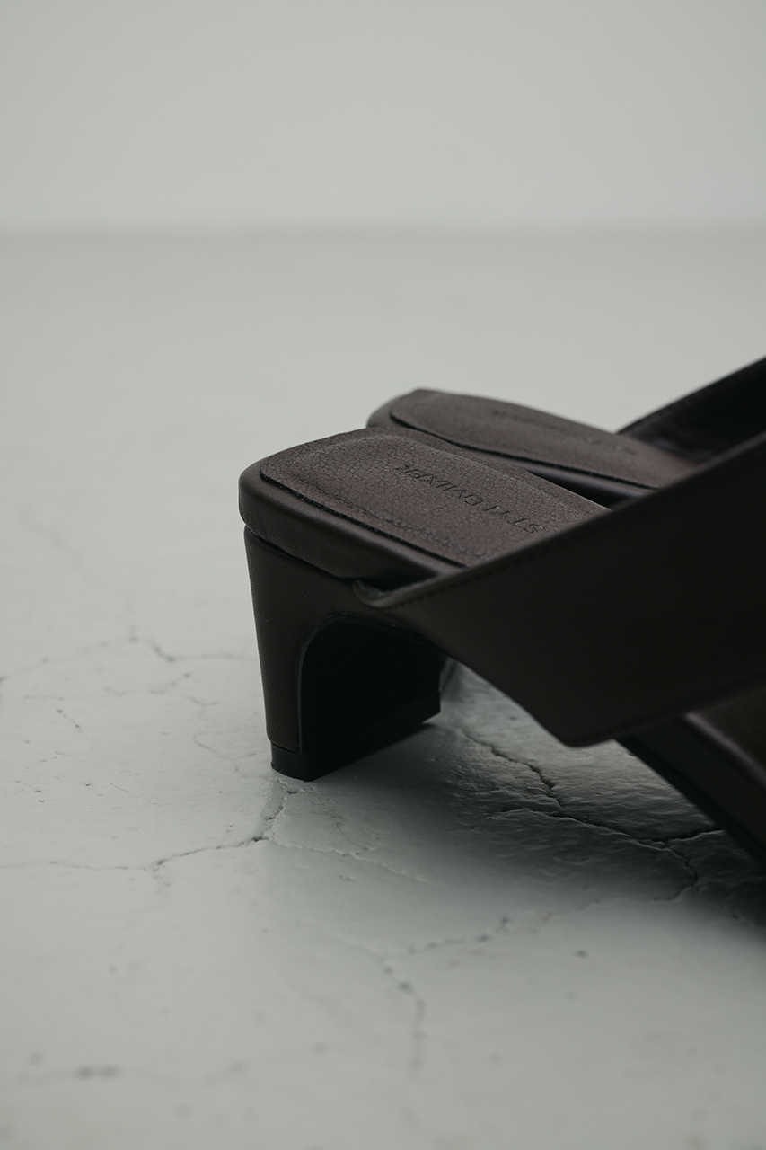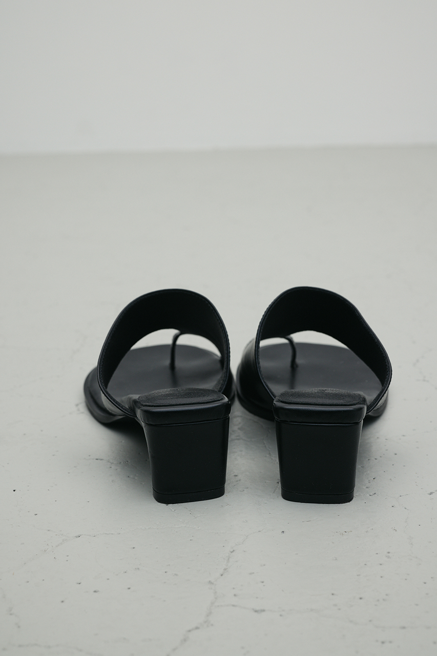親指から甲にかけてしっかりとホールドするこだわりの太さのトングサンダル。安定感があり歩きやすく、足長見えする程よい高さの横長スクエアヒールがポイント。シンプルながらも存在感ある一足です。