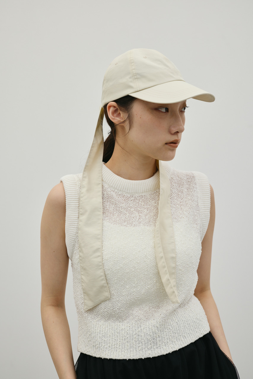 モードなナイロンポリエステル素材に大きめなリボンで女性らしさをプラスしたキャップ。後ろ空き部分はゴム仕様なので被るとフィット感があり、程よく深さのあるシルエットが小顔見せも叶えます。撥水加工が施されているので日常使いはもちろん、レジャーシーンにもおすすめです。カジュアルからフェミニンまで幅広いコーディネートにプラスしやすい、ベーシックなアイボリー・ブラックの2色展開。