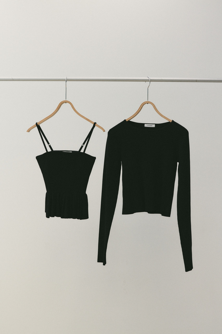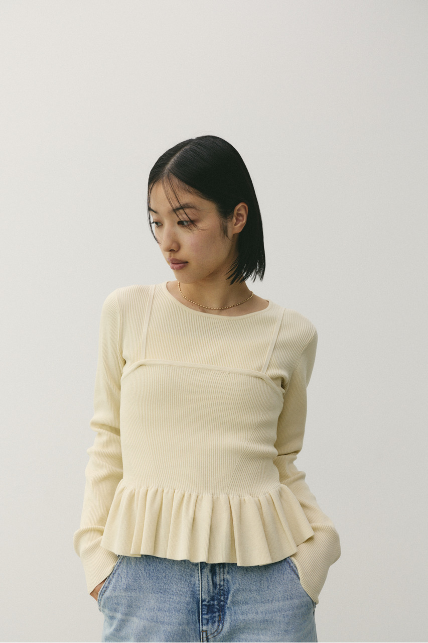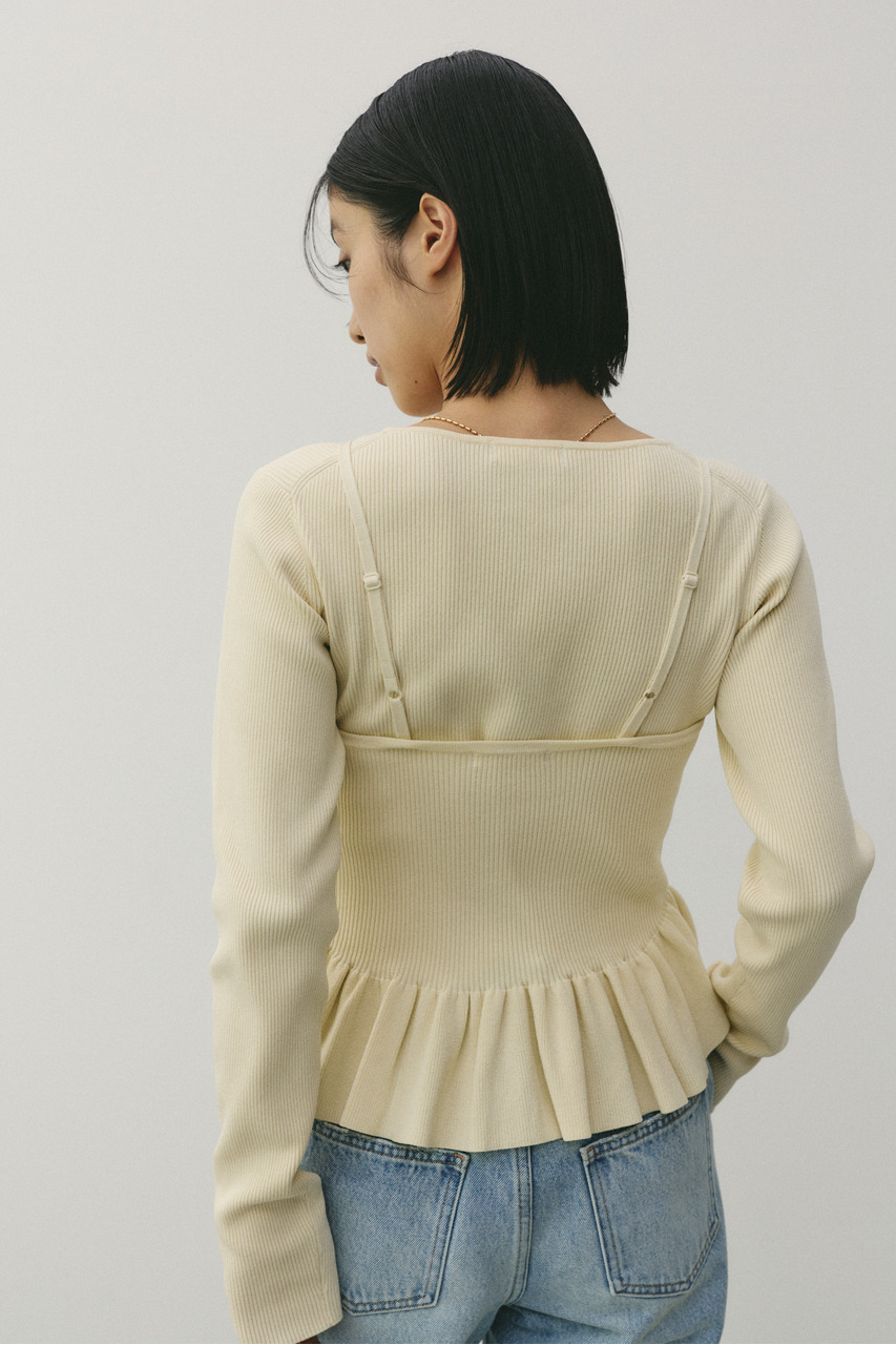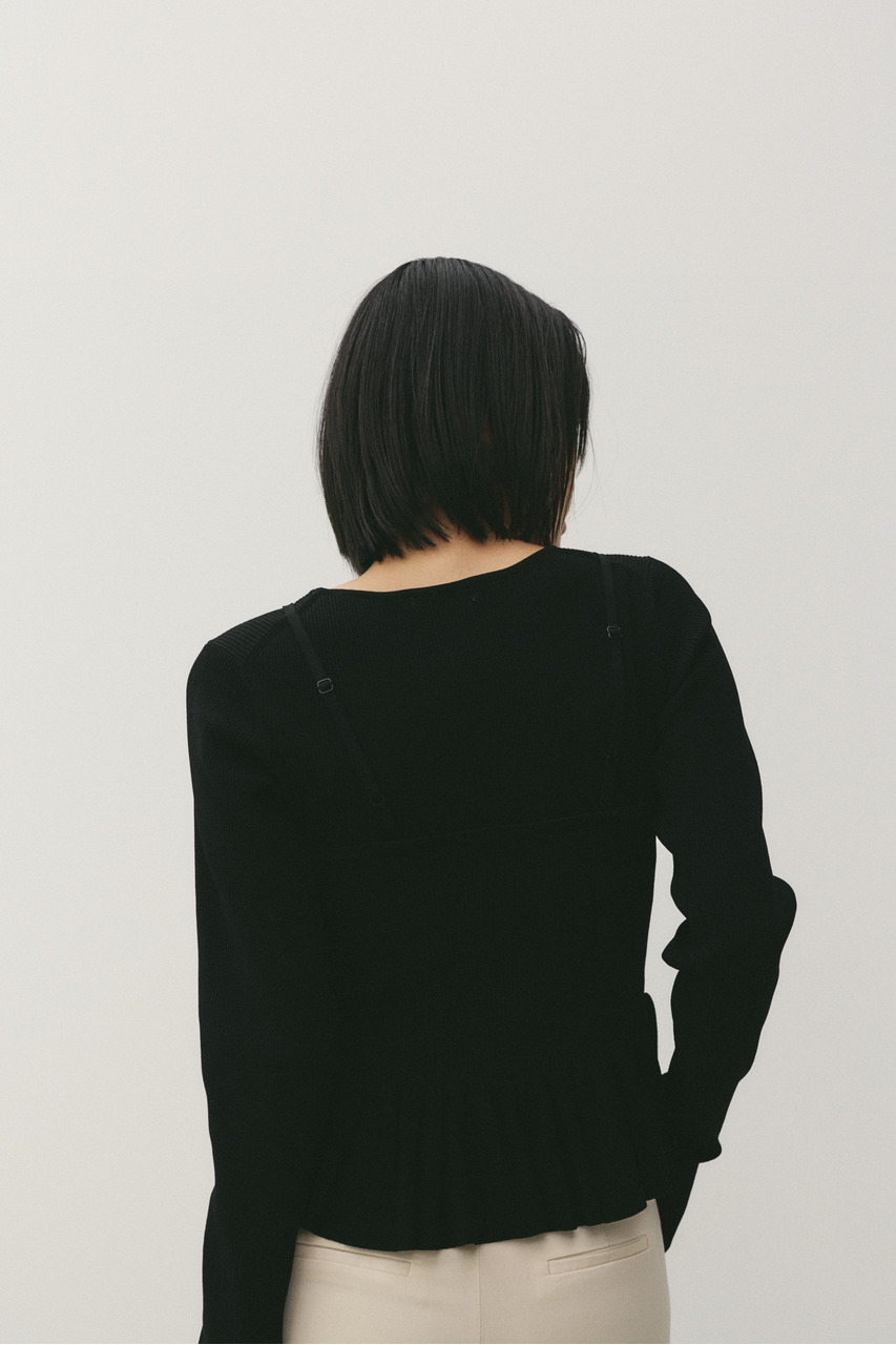 ペプラムキャミソールとコンパクトなリブトップスがセットになった、着回し力の高いセットアイテム。立体感のあるペプラムシルエットが女性らしさを演出しつつ、シンプルなリブトップスとの組み合わせで甘さを程よく抑えたデザイン。それぞれ単品使いも可能なため、スタイリングの幅が広がるのも嬉しいポイント。キャミソールには肩紐の長さを調整できるアジャスター付きで、バランスよく着用いただけます。ストレッチあり、透け感なし