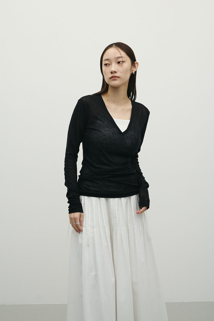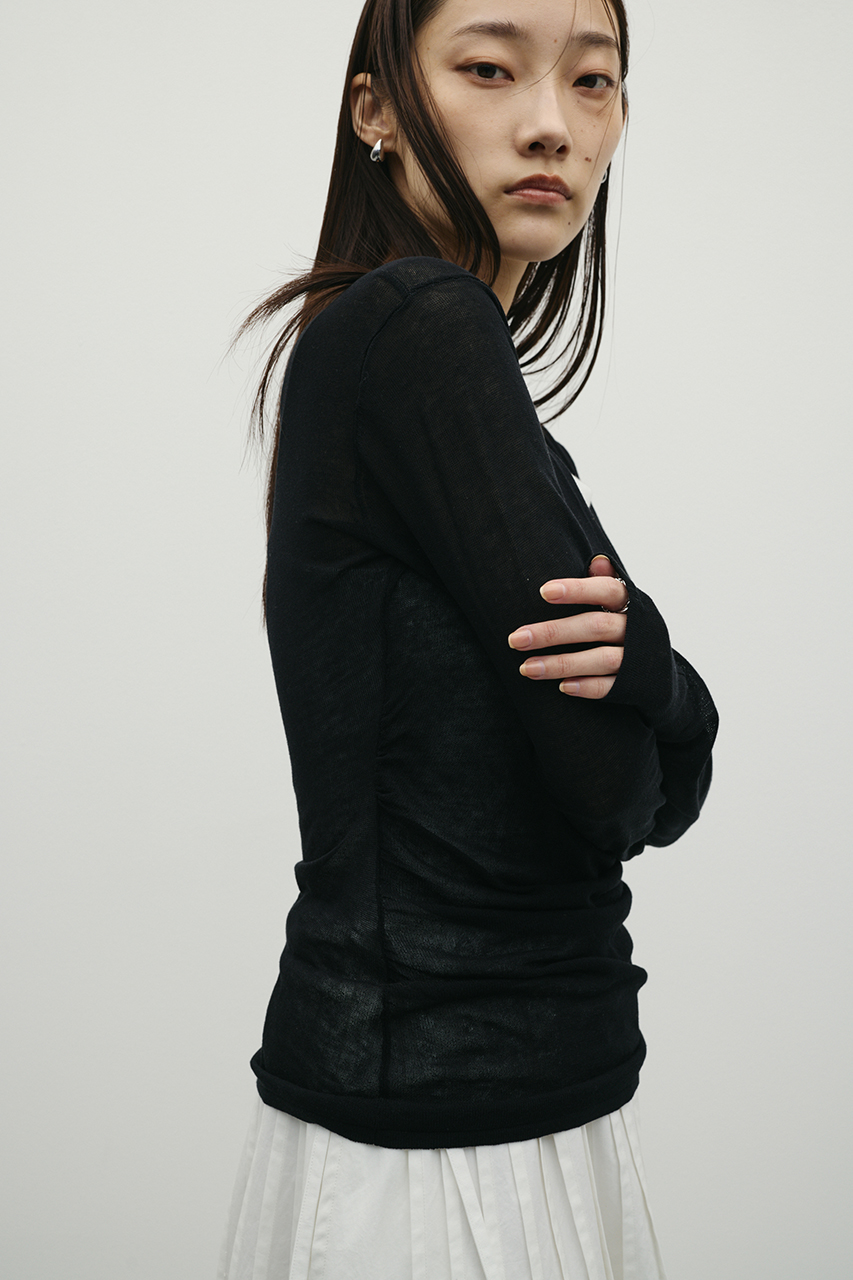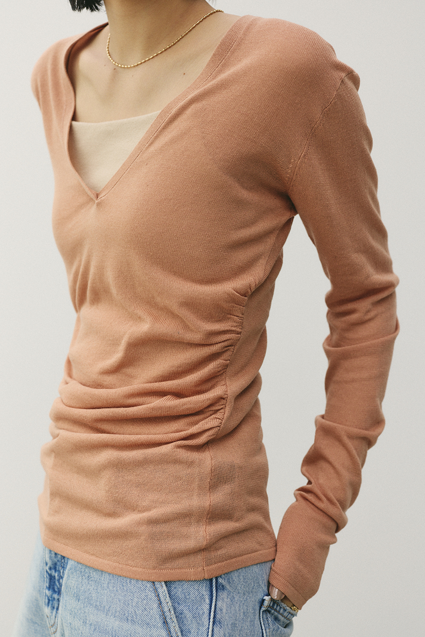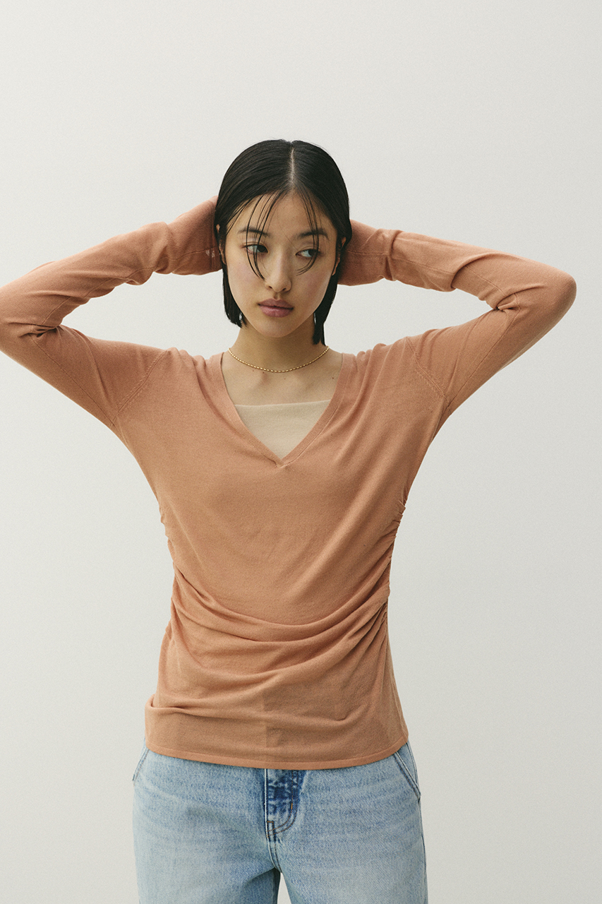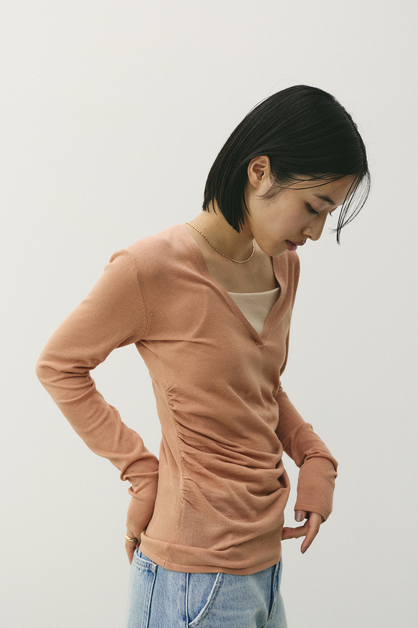 ウエストに施したドレープがポイントのVネックニット。深めに開けたVネックがスタイリングに抜け感をプラスし、お好みのインナーとレイヤードを楽しめる一枚。コンパクトなサイズ感なので、ジャケットのインナーとしても着用いただけます。リネン混糸を使用したさらりとした肌触りと、軽やかなシアー感が快適な着心地を叶えます。透け感あり、ストレッチあり。