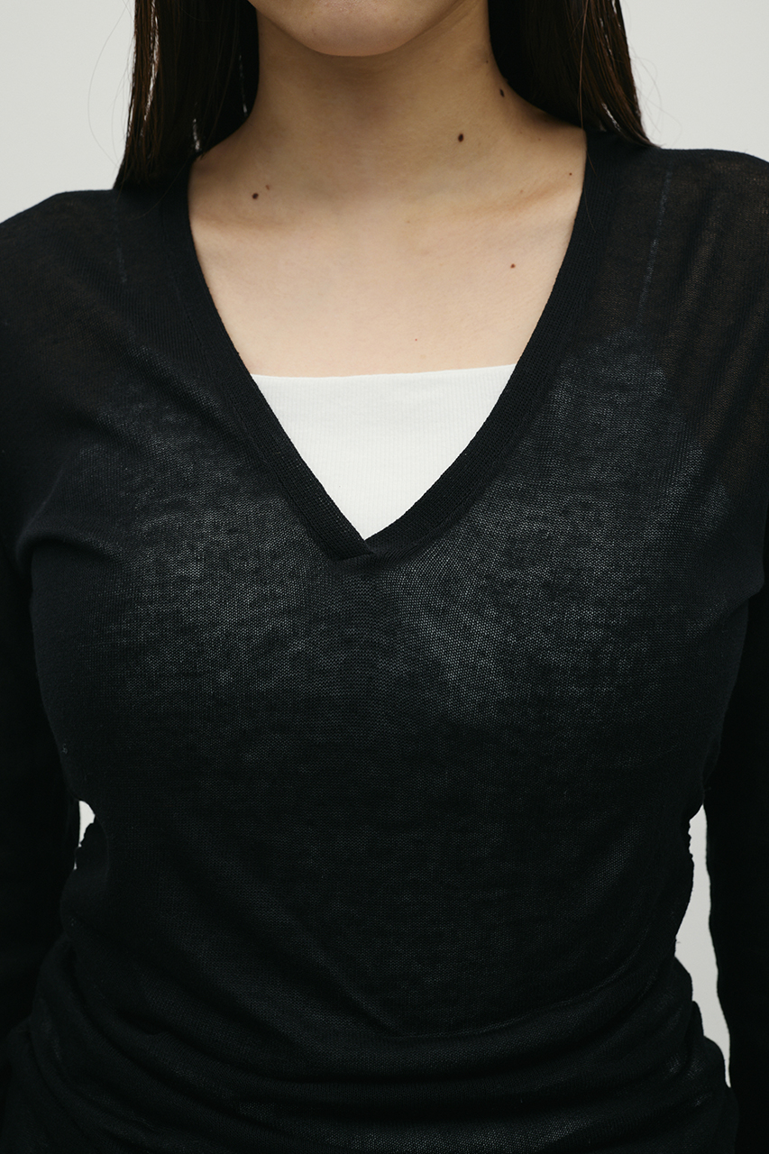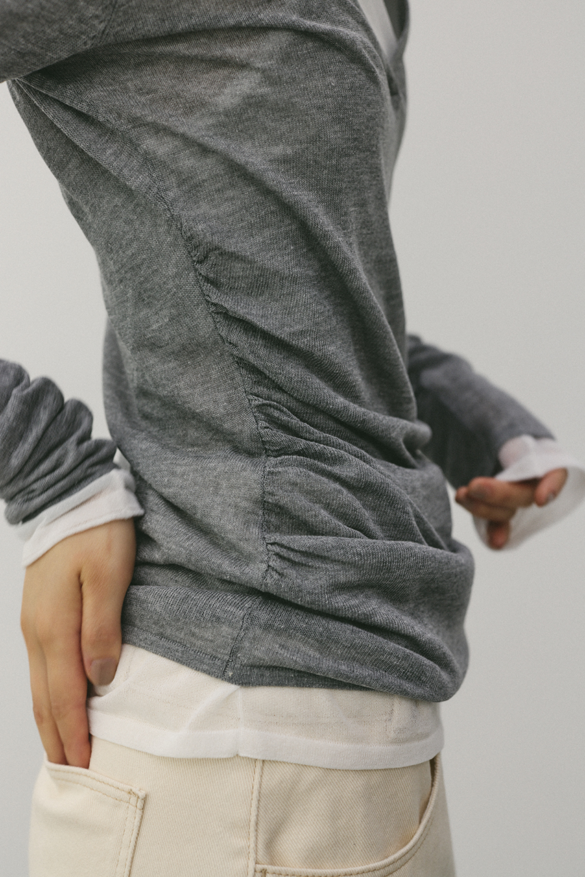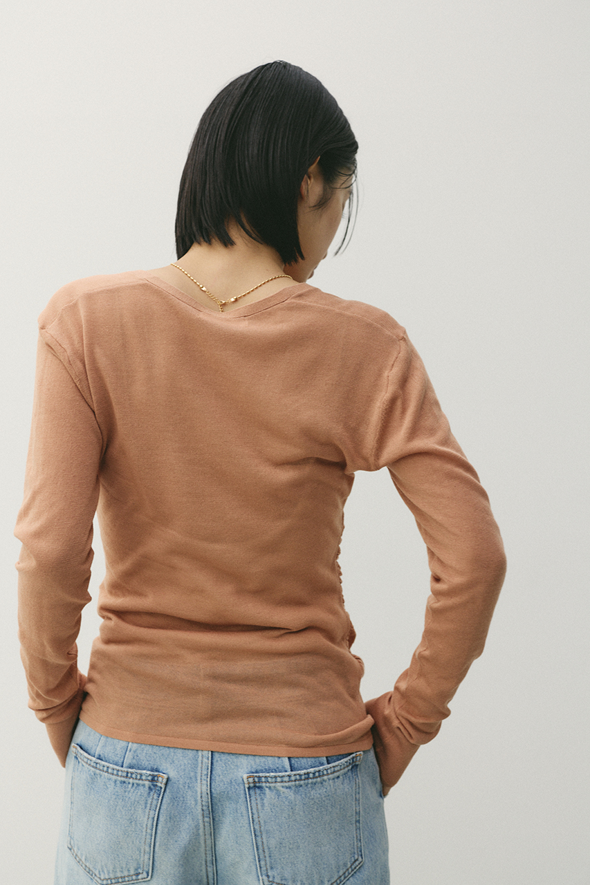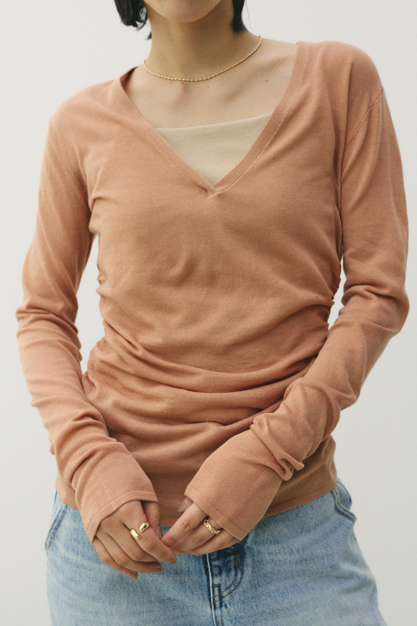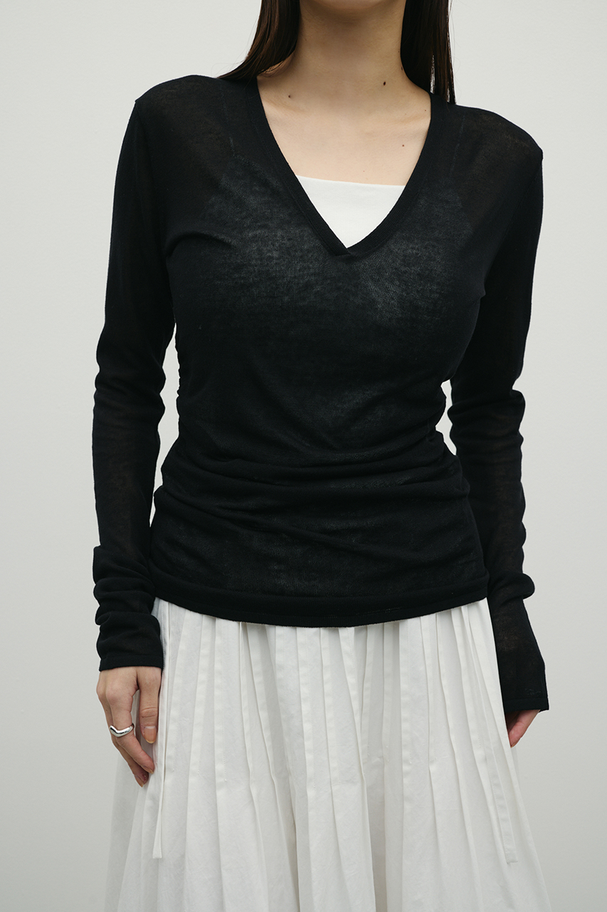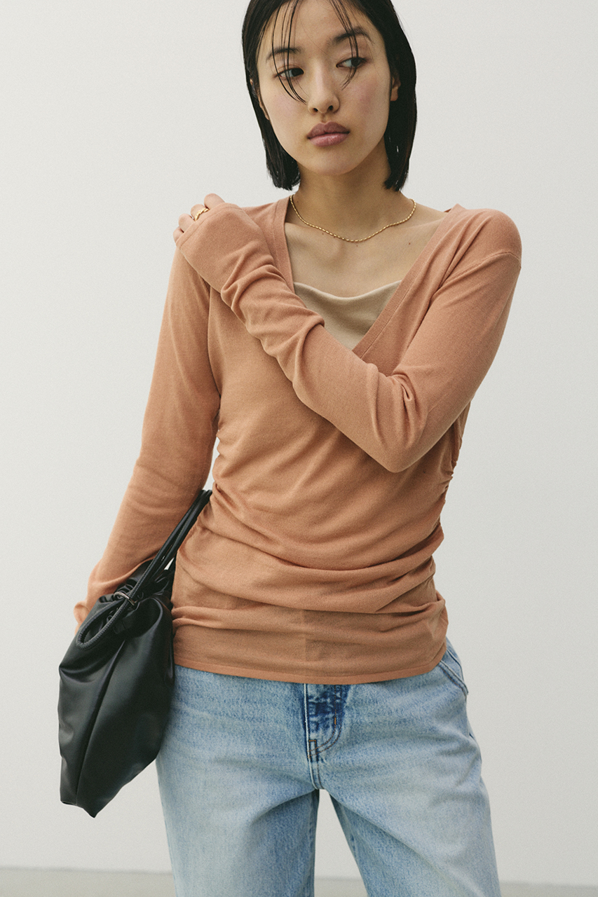 ウエストに施したドレープがポイントのVネックニット。深めに開けたVネックがスタイリングに抜け感をプラスし、お好みのインナーとレイヤードを楽しめる一枚。コンパクトなサイズ感なので、ジャケットのインナーとしても着用いただけます。リネン混糸を使用したさらりとした肌触りと、軽やかなシアー感が快適な着心地を叶えます。透け感あり、ストレッチあり。