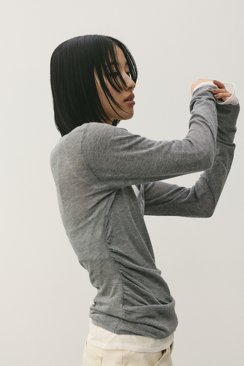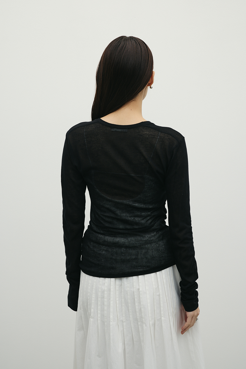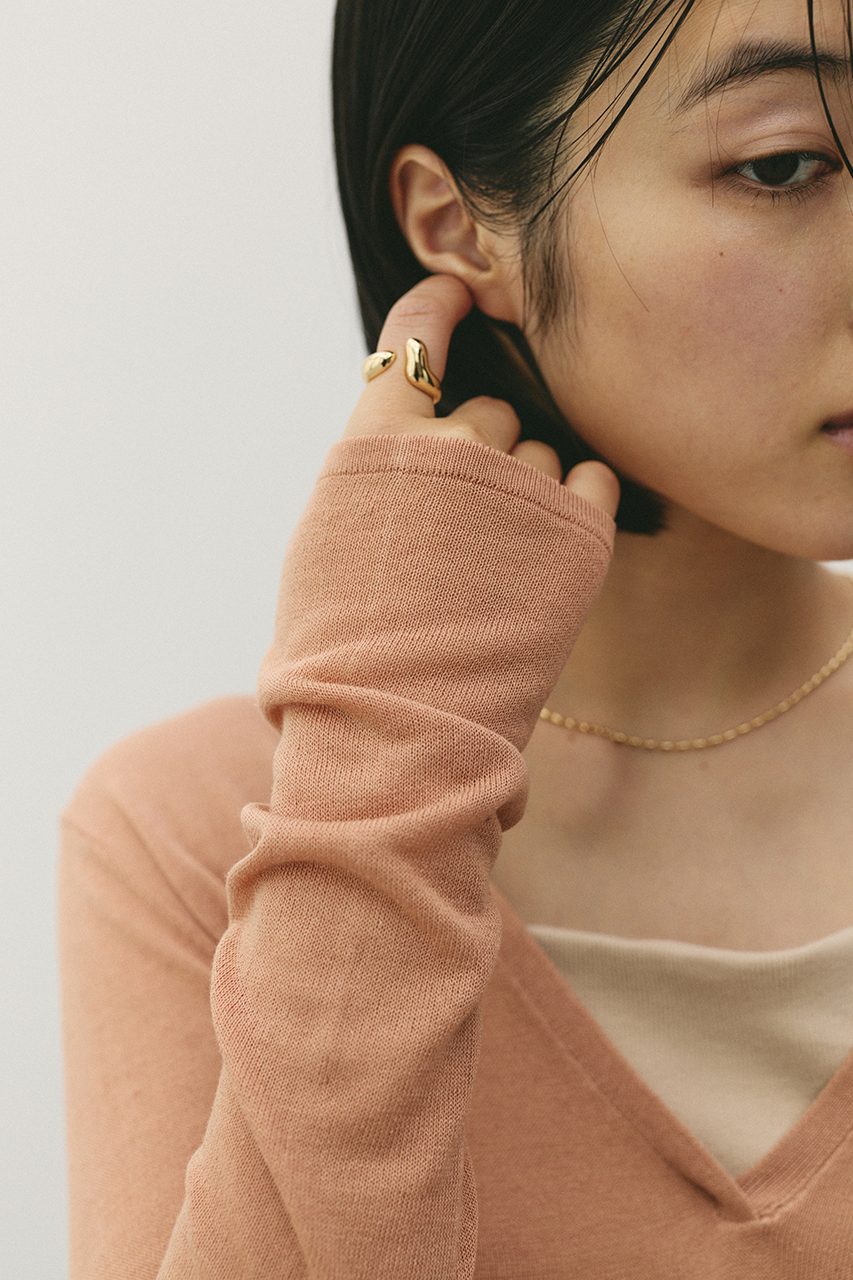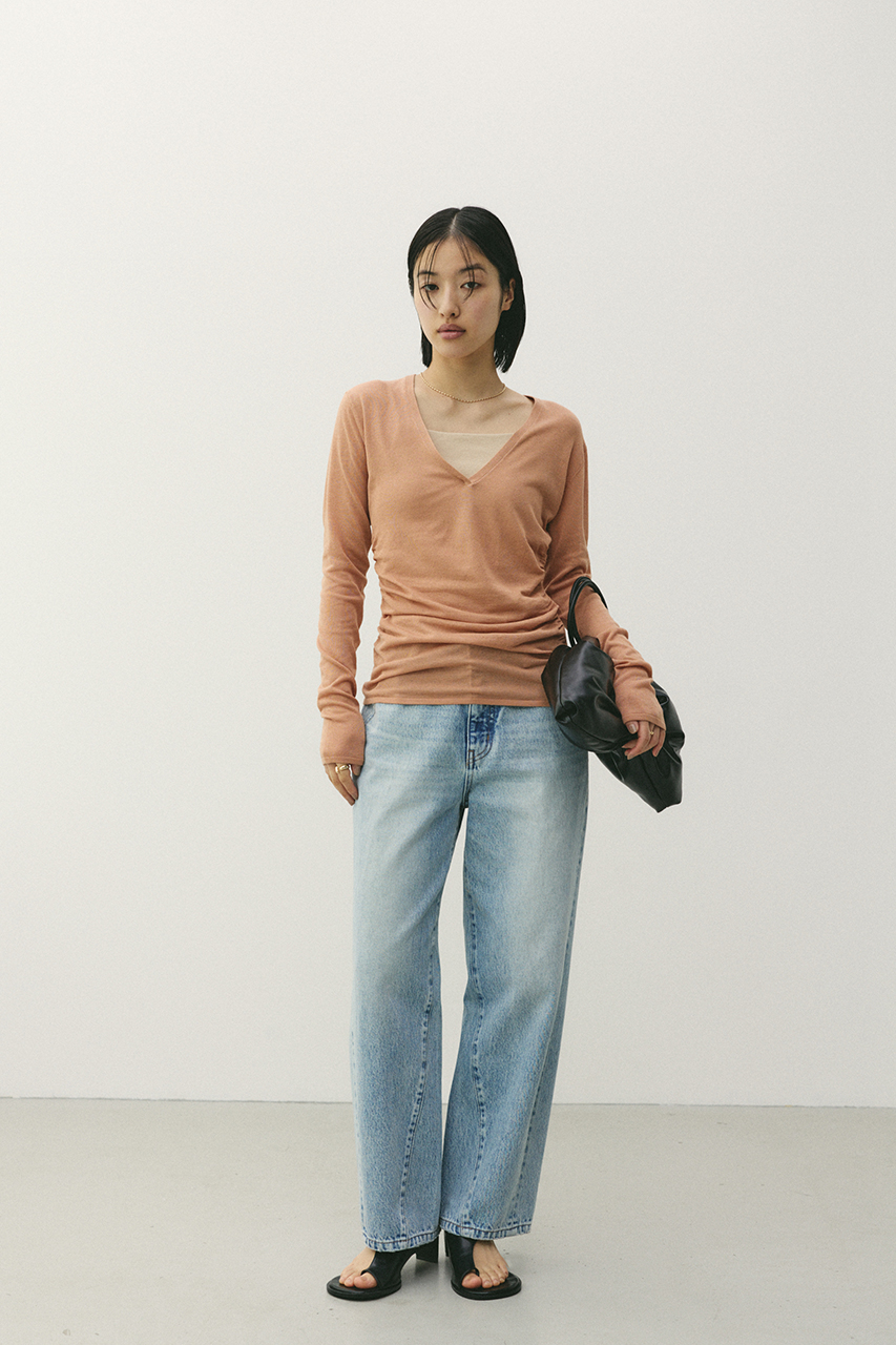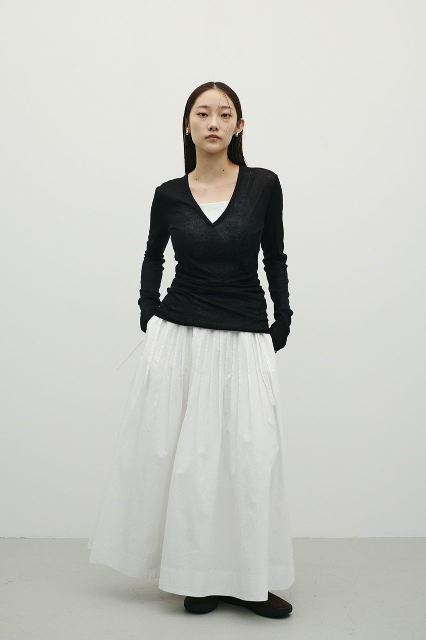 ウエストに施したドレープがポイントのVネックニット。深めに開けたVネックがスタイリングに抜け感をプラスし、お好みのインナーとレイヤードを楽しめる一枚。コンパクトなサイズ感なので、ジャケットのインナーとしても着用いただけます。リネン混糸を使用したさらりとした肌触りと、軽やかなシアー感が快適な着心地を叶えます。透け感あり、ストレッチあり。