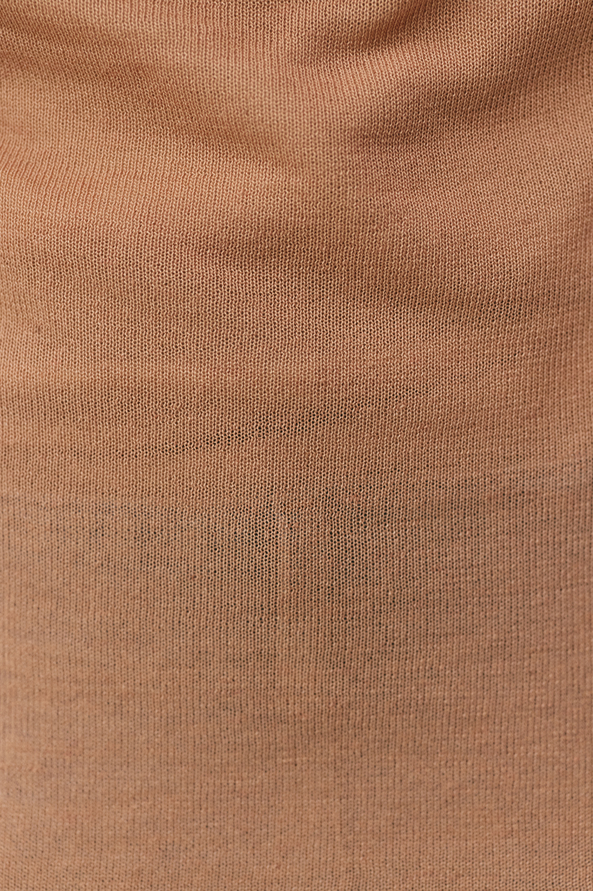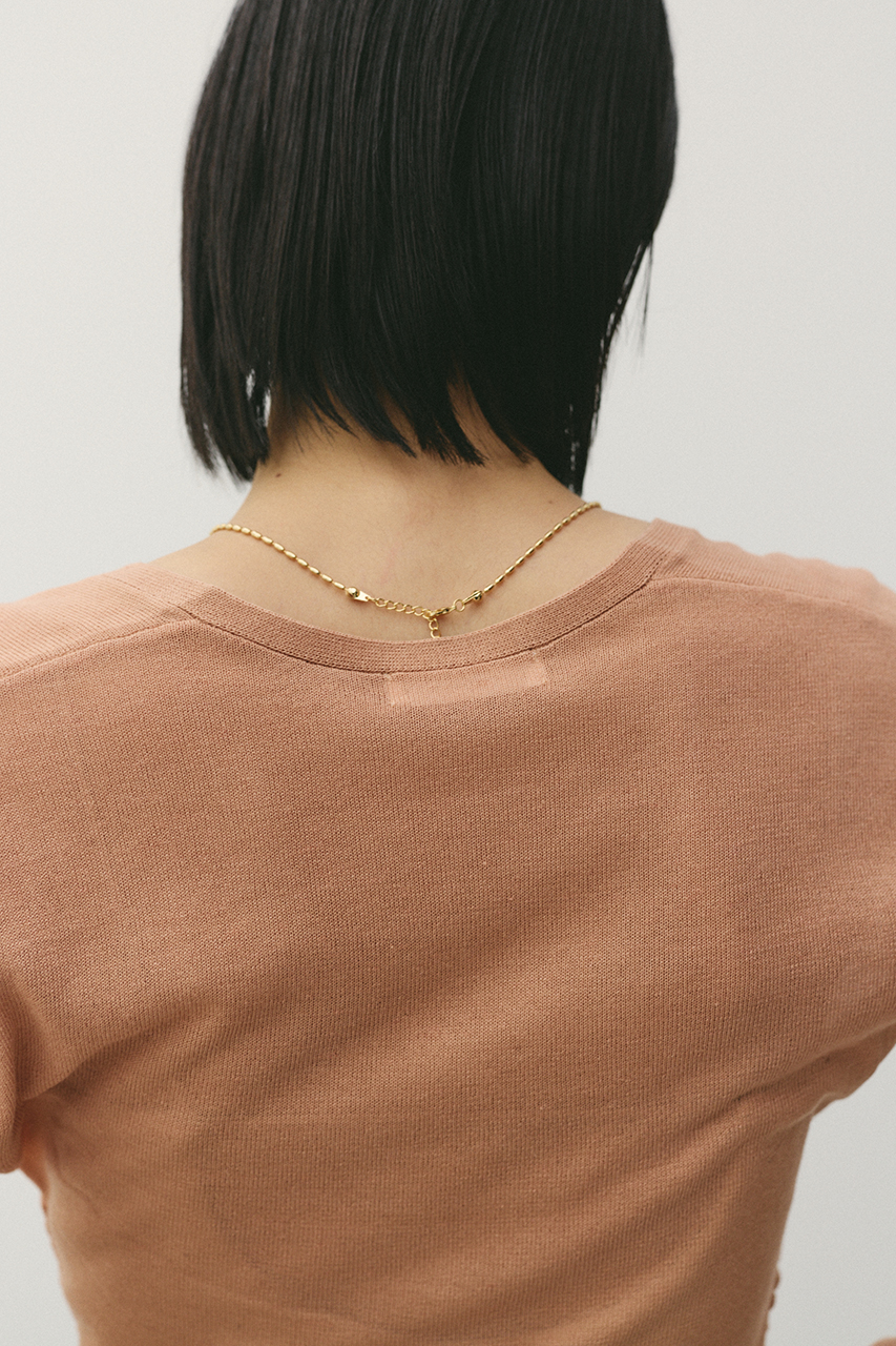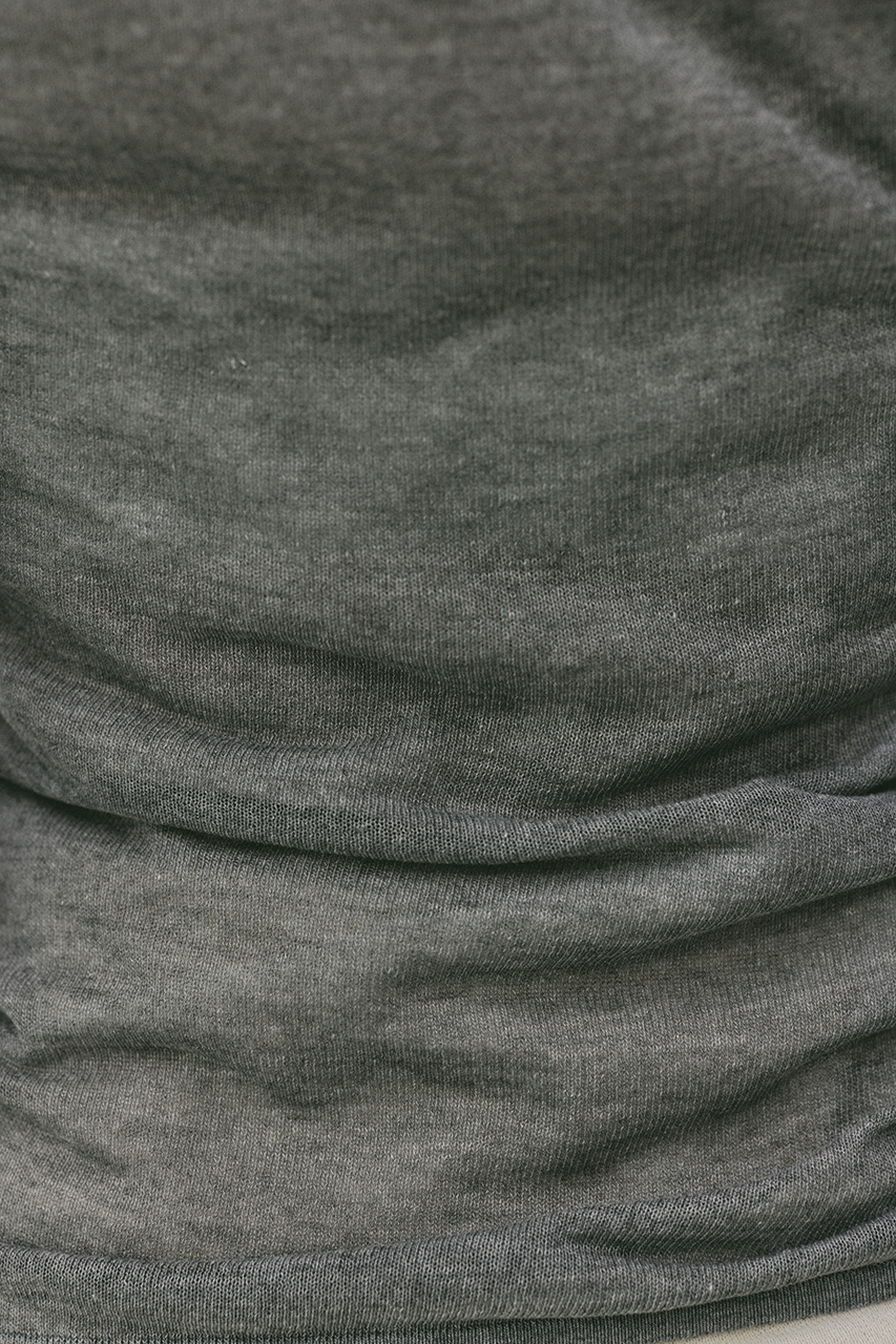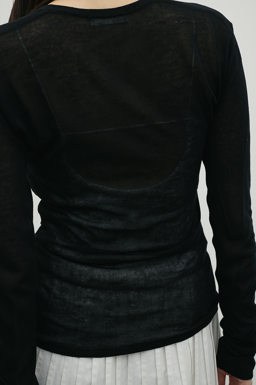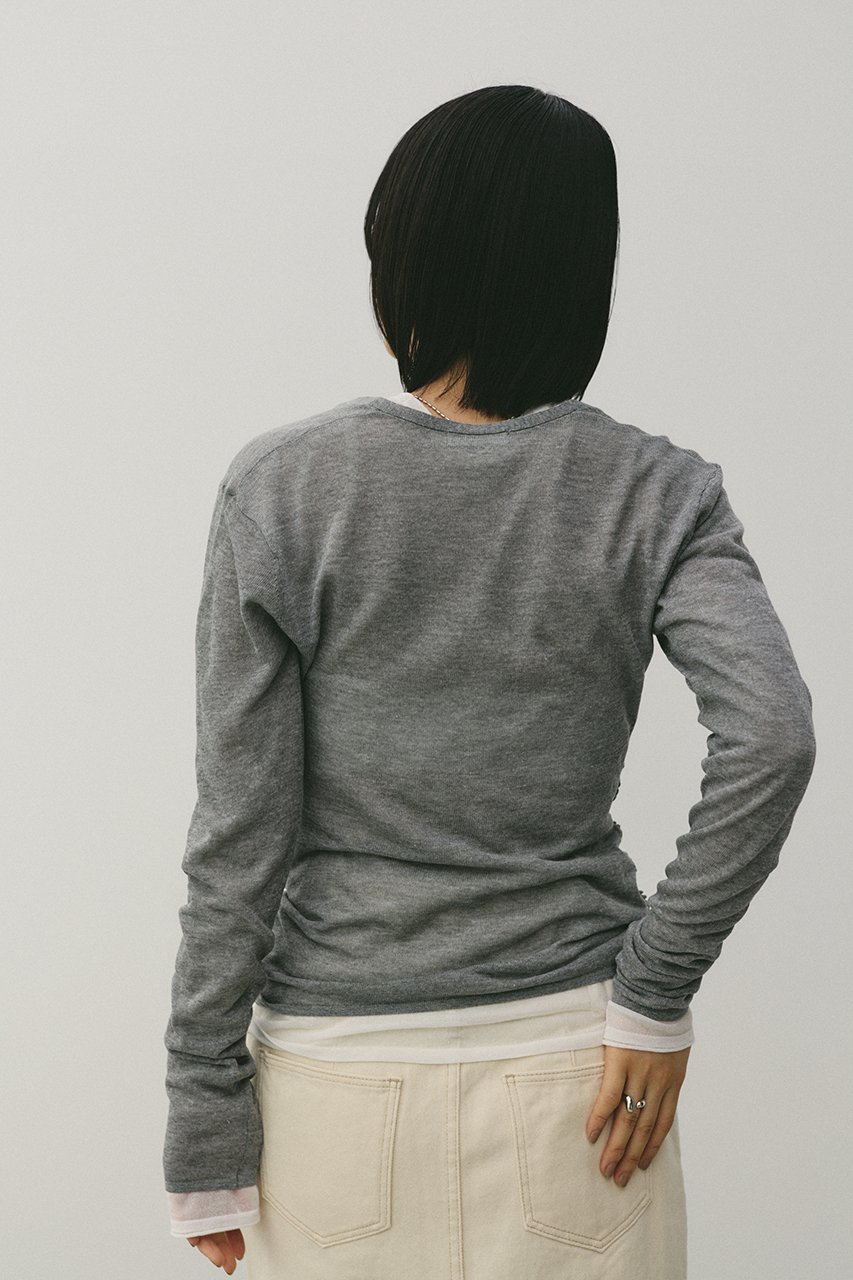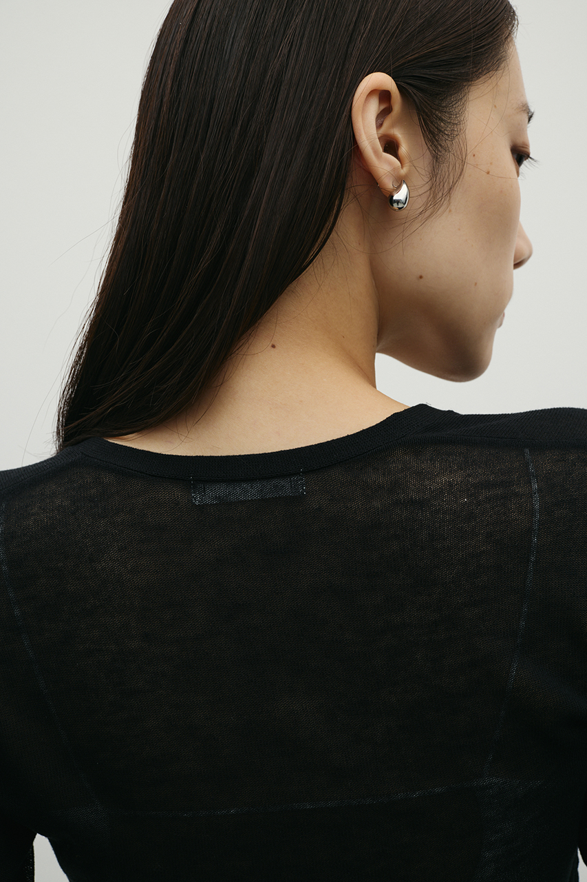 ウエストに施したドレープがポイントのVネックニット。深めに開けたVネックがスタイリングに抜け感をプラスし、お好みのインナーとレイヤードを楽しめる一枚。コンパクトなサイズ感なので、ジャケットのインナーとしても着用いただけます。リネン混糸を使用したさらりとした肌触りと、軽やかなシアー感が快適な着心地を叶えます。透け感あり、ストレッチあり。