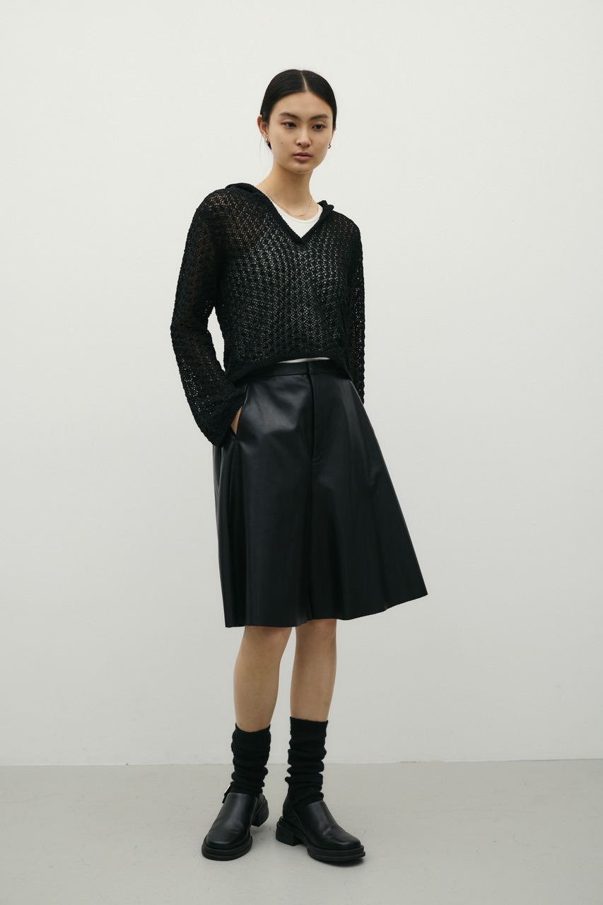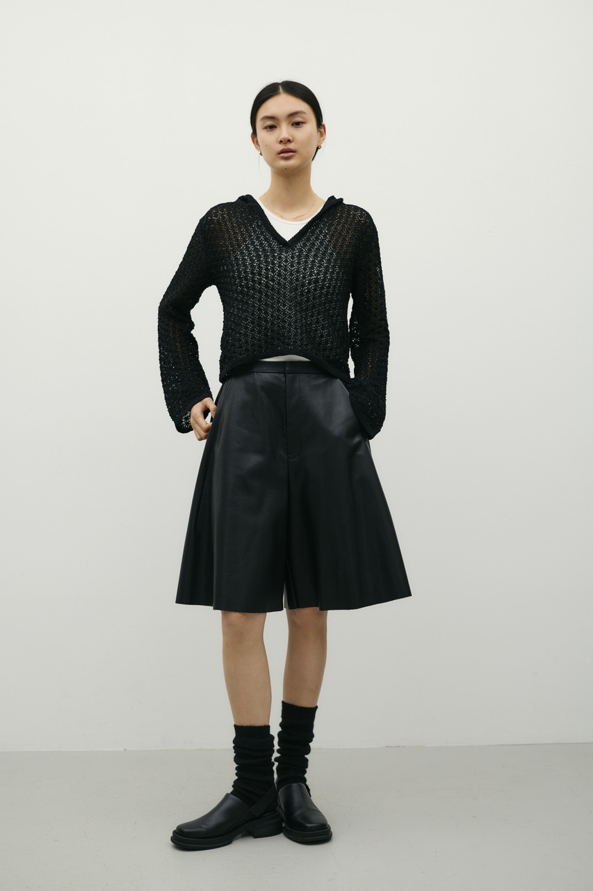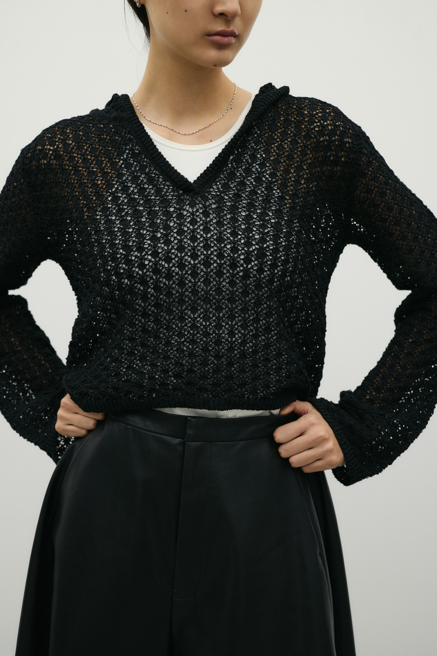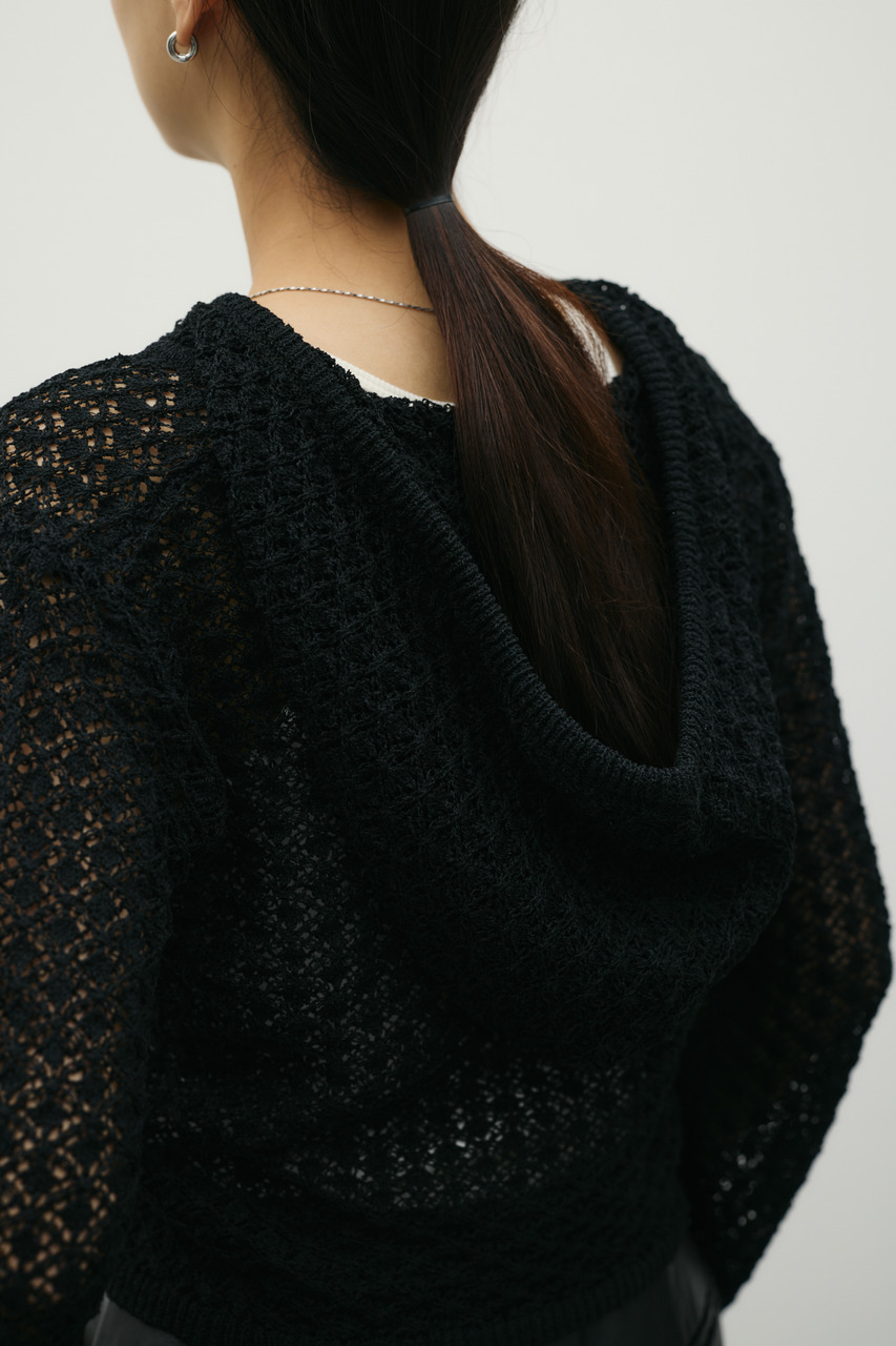 カジュアルなフーディーデザインとアイレット柄がキャッチーなニット。袖口に向かって広がる控えめなフレアスリーブが手元にニュアンス感をプラス。一枚ではもちろん、ジャケットの中にレイヤードするとよりこなれた印象に導きます。透け感あり、ストレッチあり。