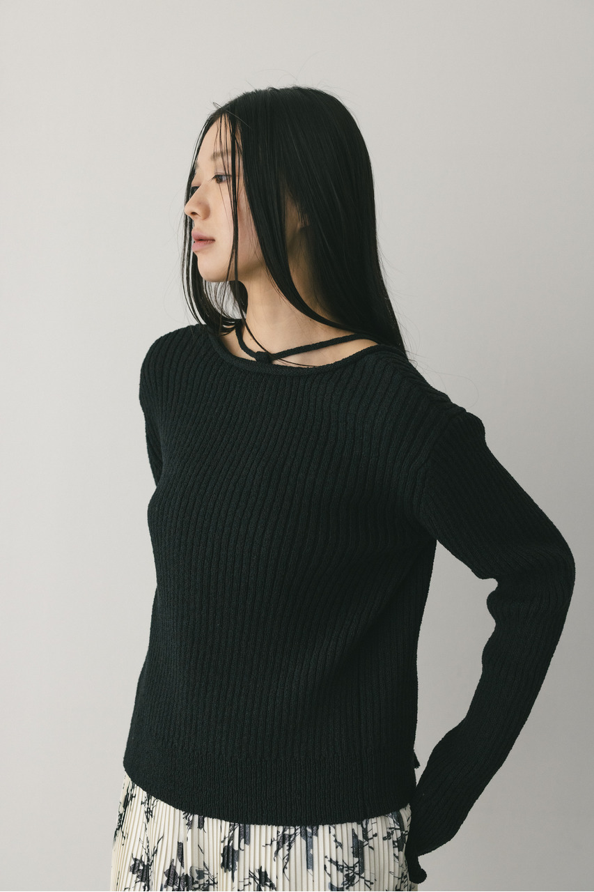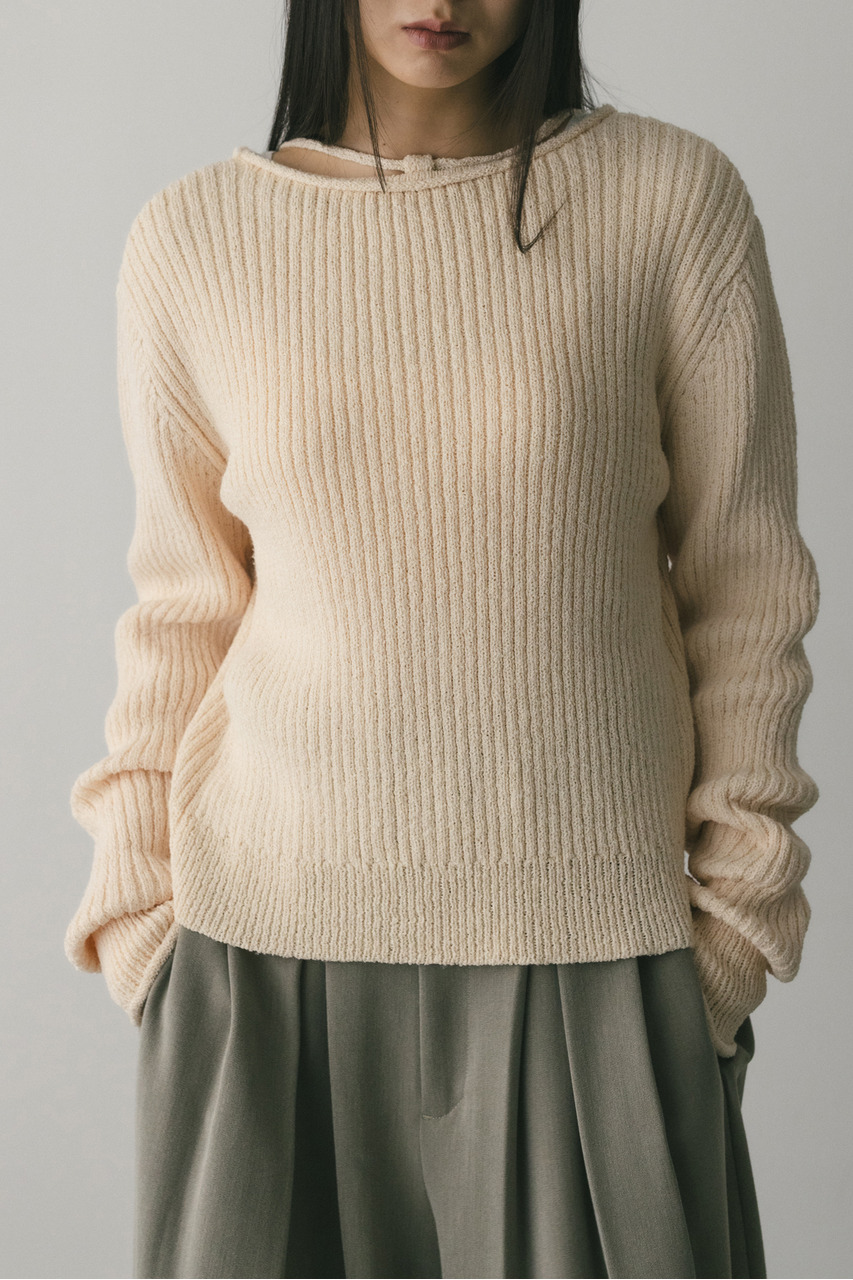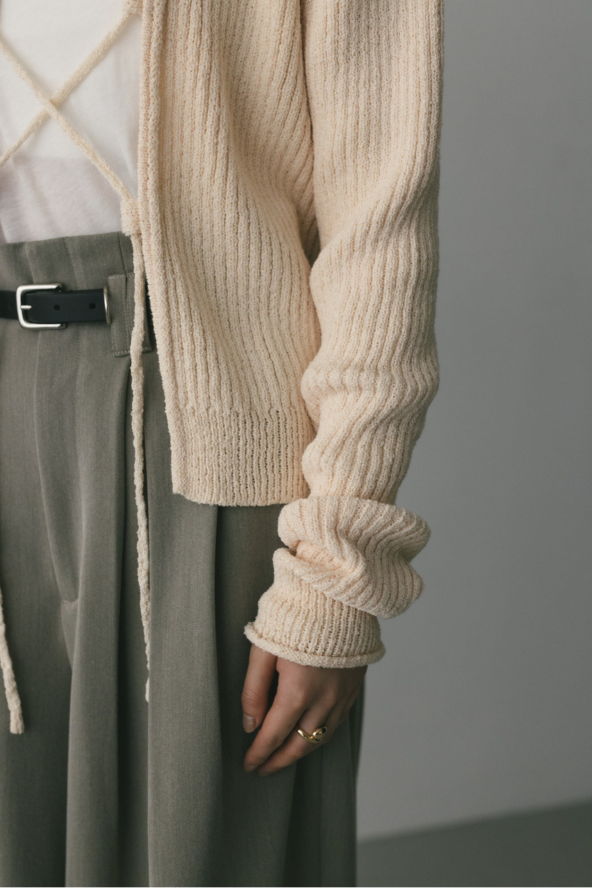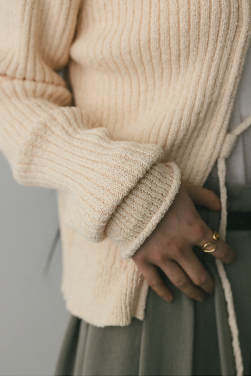 フロントに施されたレースアップがコーディネートに抜け感と女性らしさをプラスしてくれるニット。ブークレー糸を使用してリブで編み立てることで表面感のあるトップスに仕上げました。紐を通すループは高めの位置までにしているので、リボン結びをしたり、あえてルーズに紐をたらしたままにするのもおすすめ。襟ぐりと袖口はくるんとカール仕様になっており、細部までおしゃれさを追求したニットです。ストレッチあり、透け感なし。