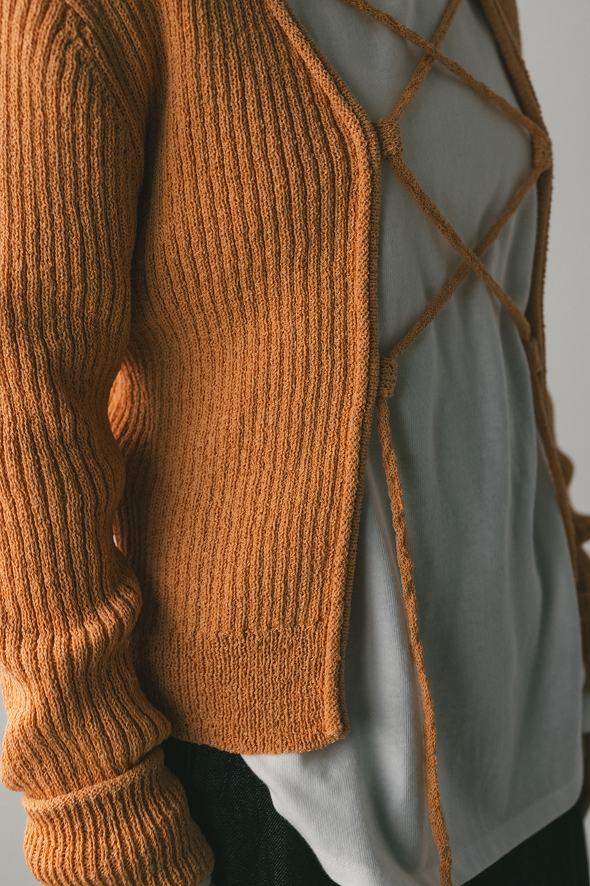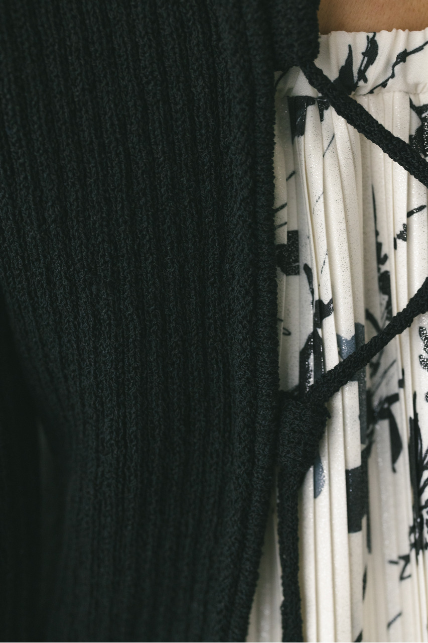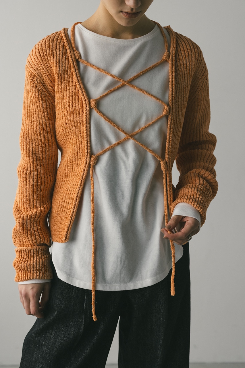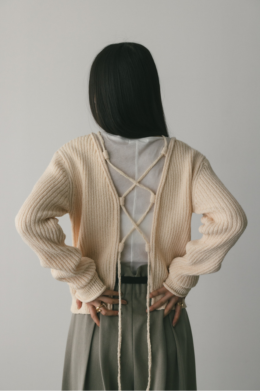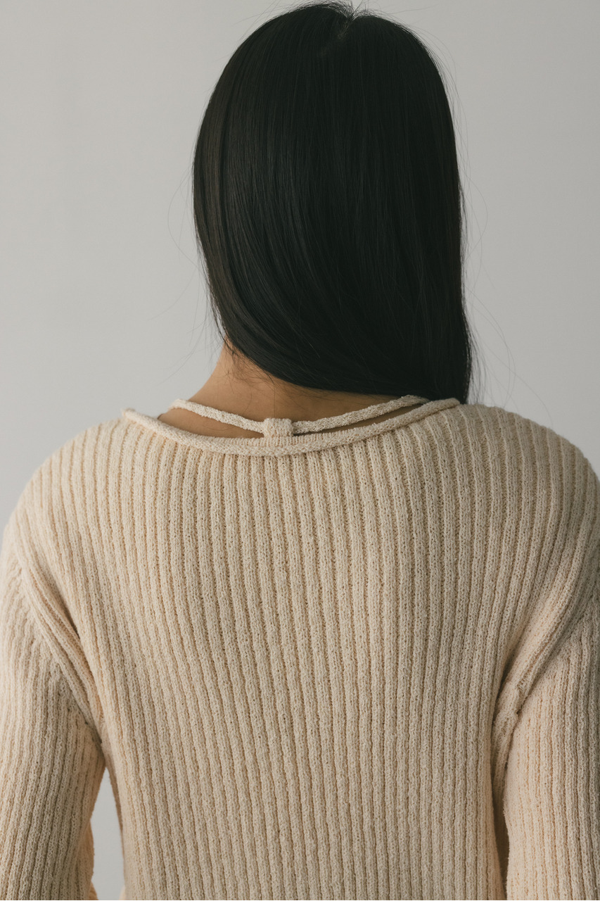 フロントに施されたレースアップがコーディネートに抜け感と女性らしさをプラスしてくれるニット。ブークレー糸を使用してリブで編み立てることで表面感のあるトップスに仕上げました。紐を通すループは高めの位置までにしているので、リボン結びをしたり、あえてルーズに紐をたらしたままにするのもおすすめ。襟ぐりと袖口はくるんとカール仕様になっており、細部までおしゃれさを追求したニットです。ストレッチあり、透け感なし。