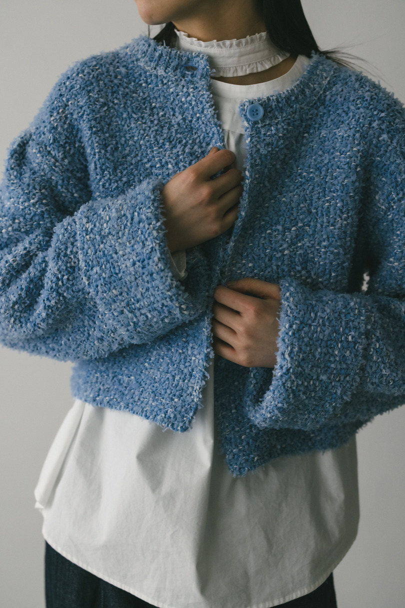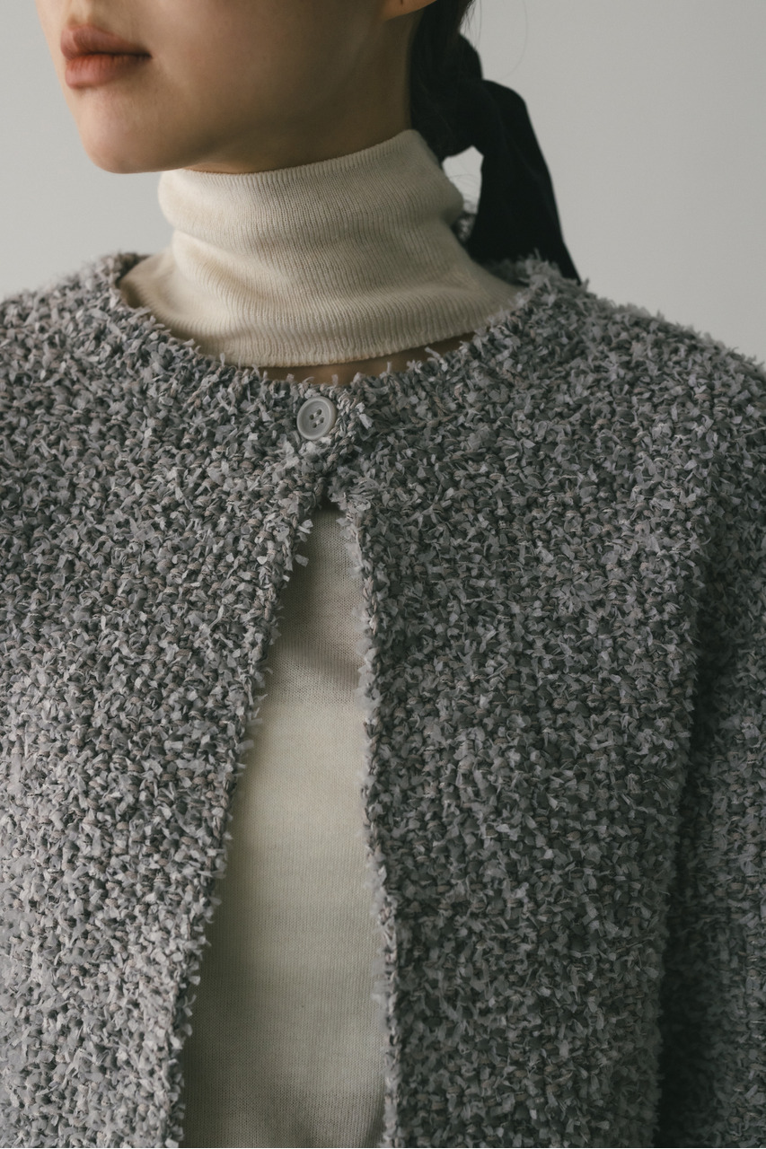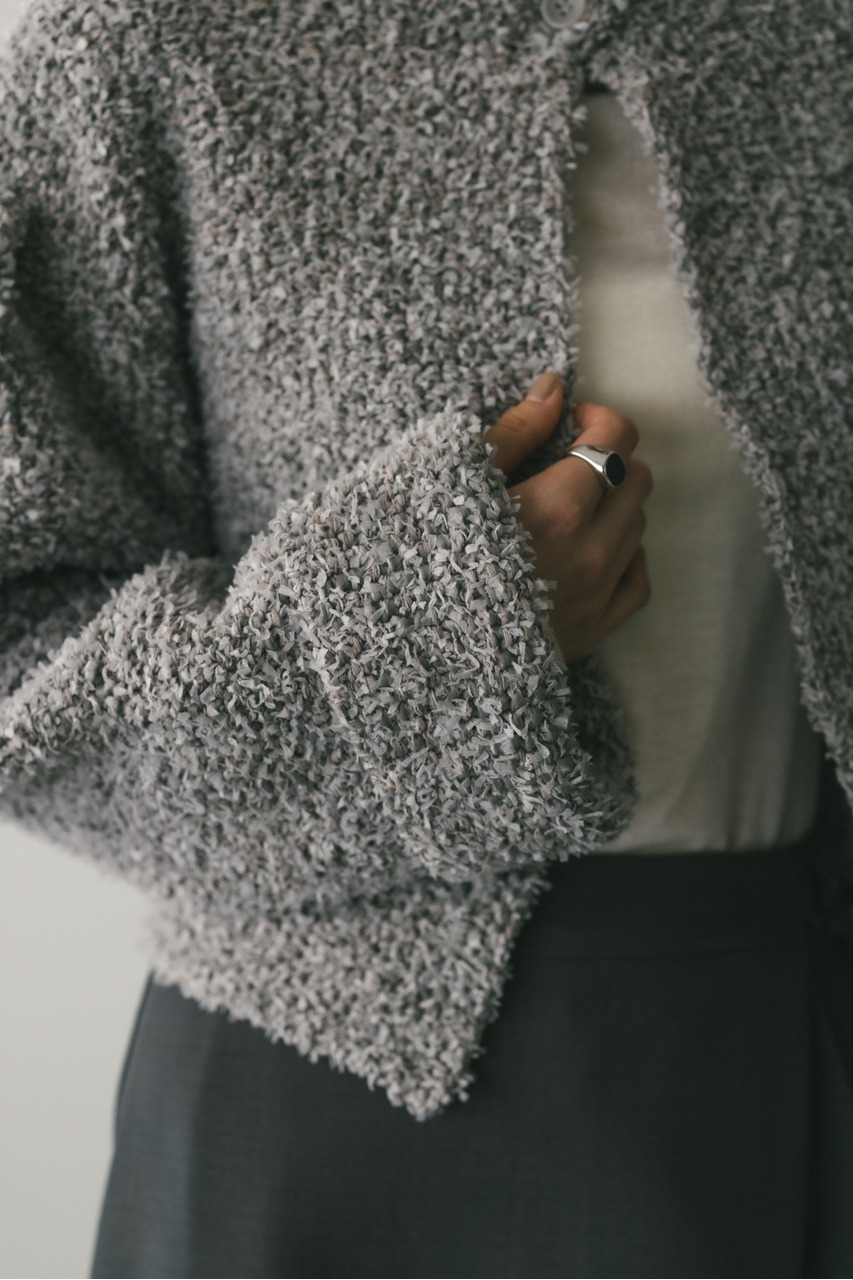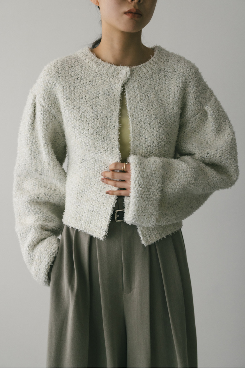 異なる3種類の糸を引き揃えて編んだ膨らみと表面感のあるテープヤーンカーディガン。袖山にタックが施されており、シンプルなデザインながらもスタイリングの主役になる一枚です。ストレッチあり、透け感なし。