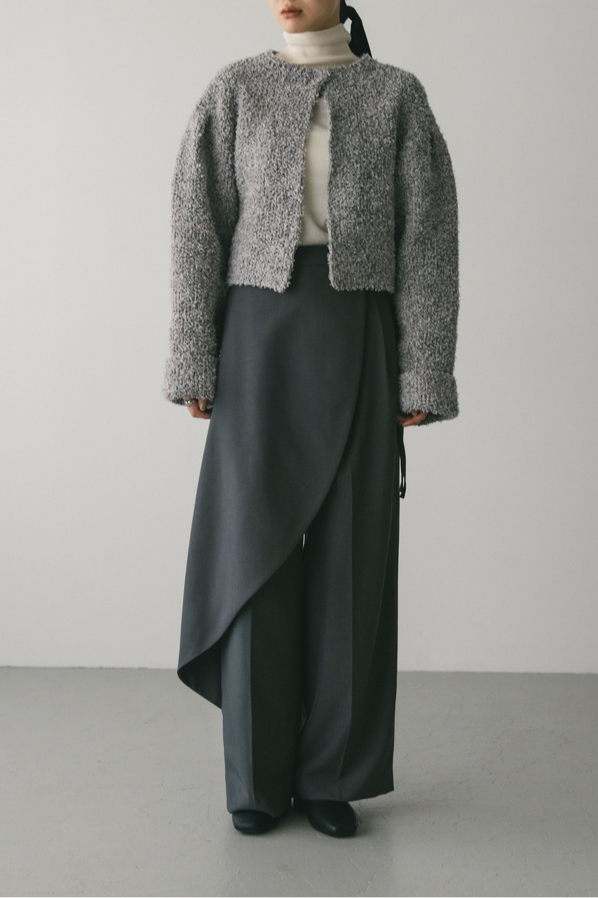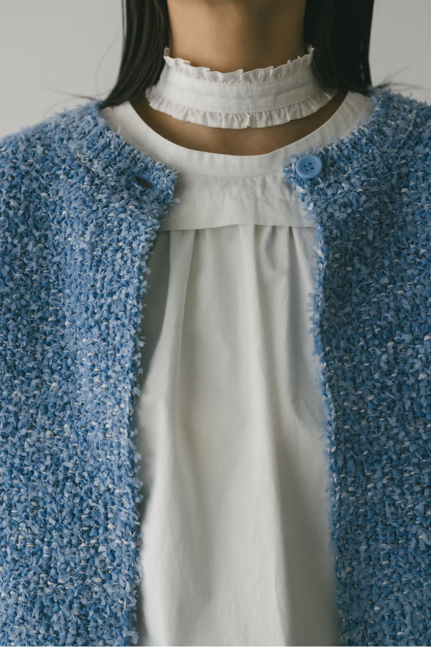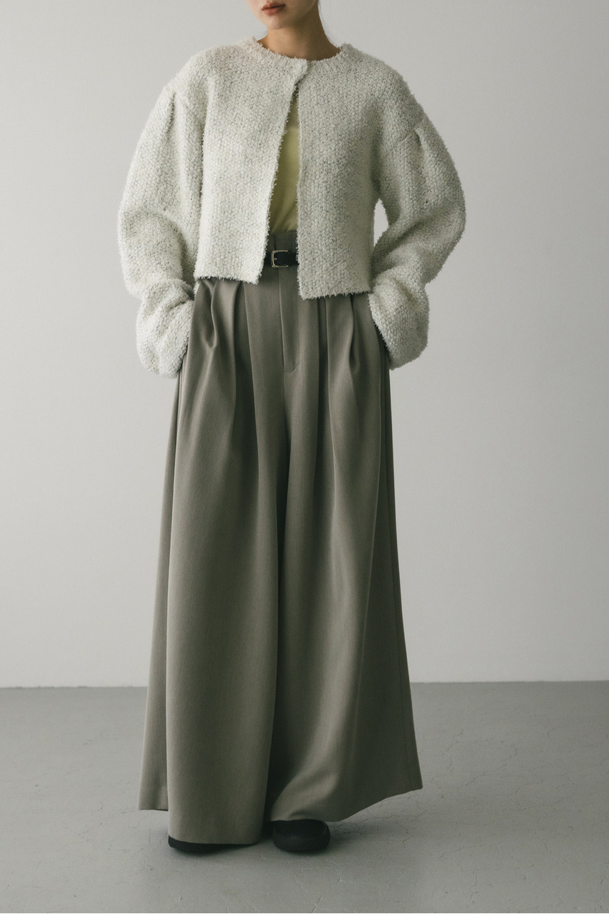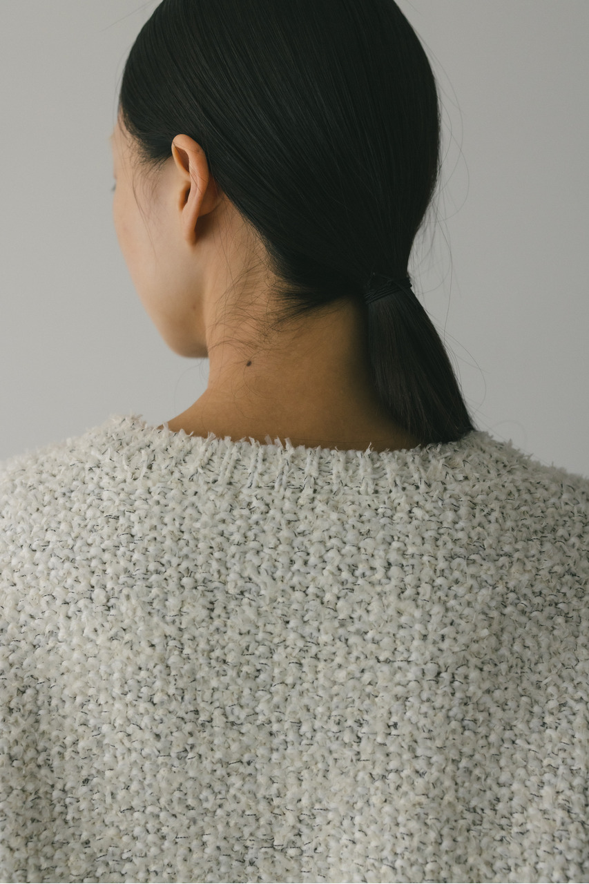 異なる3種類の糸を引き揃えて編んだ膨らみと表面感のあるテープヤーンカーディガン。袖山にタックが施されており、シンプルなデザインながらもスタイリングの主役になる一枚です。ストレッチあり、透け感なし。