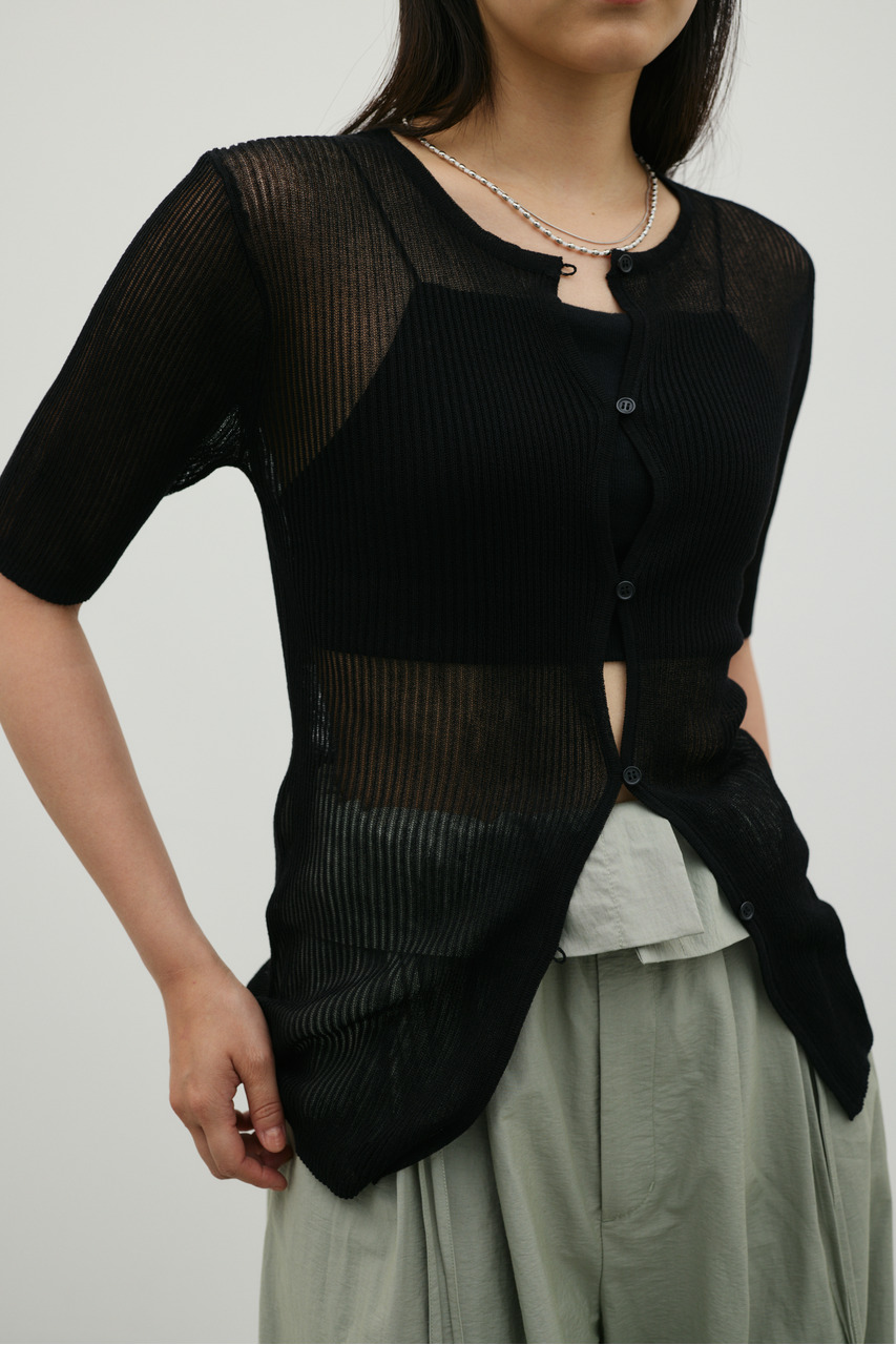 14ゲージのハイゲージリブ組織で編み立てたシアー感のあるコンパクトニット。ドライタッチの糸を使用し、春夏シーズンも快適に着用いただけます。フロントはホール見えする開きデザインに仕上げ、さりげない抜け感をプラス。ウエストシェイプされたシルエットと縦ラインを強調するリブ組織で、すっきりとした細見え効果も叶えます。透け感あり、ストレッチあり。