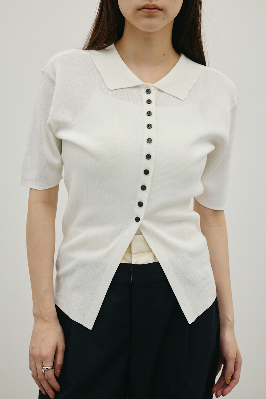 前後2WAYで着用可能なニットポロ。なめらかでさらりとした糸を使用。ビスコース混の微光沢が上品な印象に見せてくれます。総針に編み立てにしているのでボディーラインもひびきにくい一枚です。ストレッチあり、透け感なし。