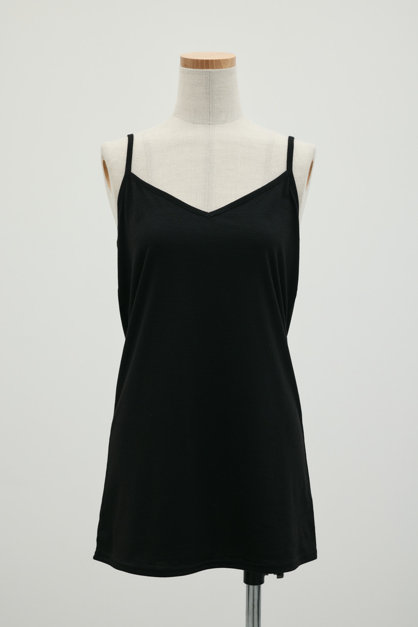 滑らかなカットソー素材を使用したミドル丈のインナーキャミソール。前後下がりを深めに設定しているので、ワンピースやバックオープントップスのインナー使いにおすすめです。透け感WHTあり、ストレッチあり。