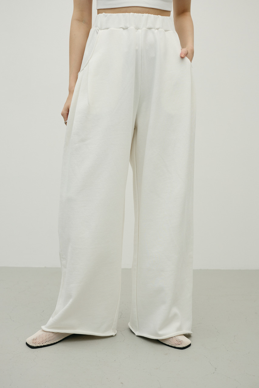 裏毛素材を使用したリラックス感のあるワイドシルエットのスウェットパンツ。カーブポケットにタックを施した、他にはないデザインがポイント。裾は裁ち切り仕様でカジュアルな抜け感をプラスしました。ウエストはゴム仕様に加え、内側紐付きでフィット感の調整が可能です。透け感WHTややあり、ストレッチあり。