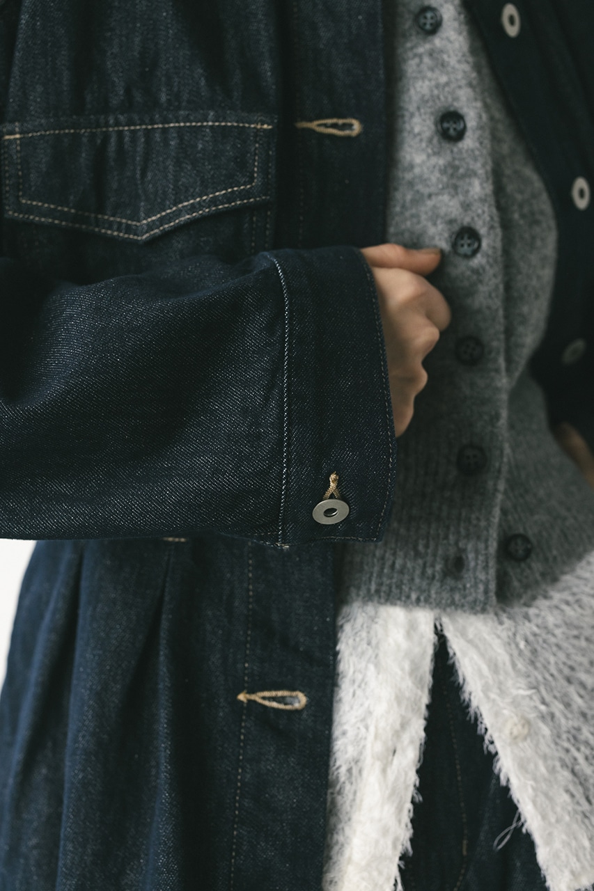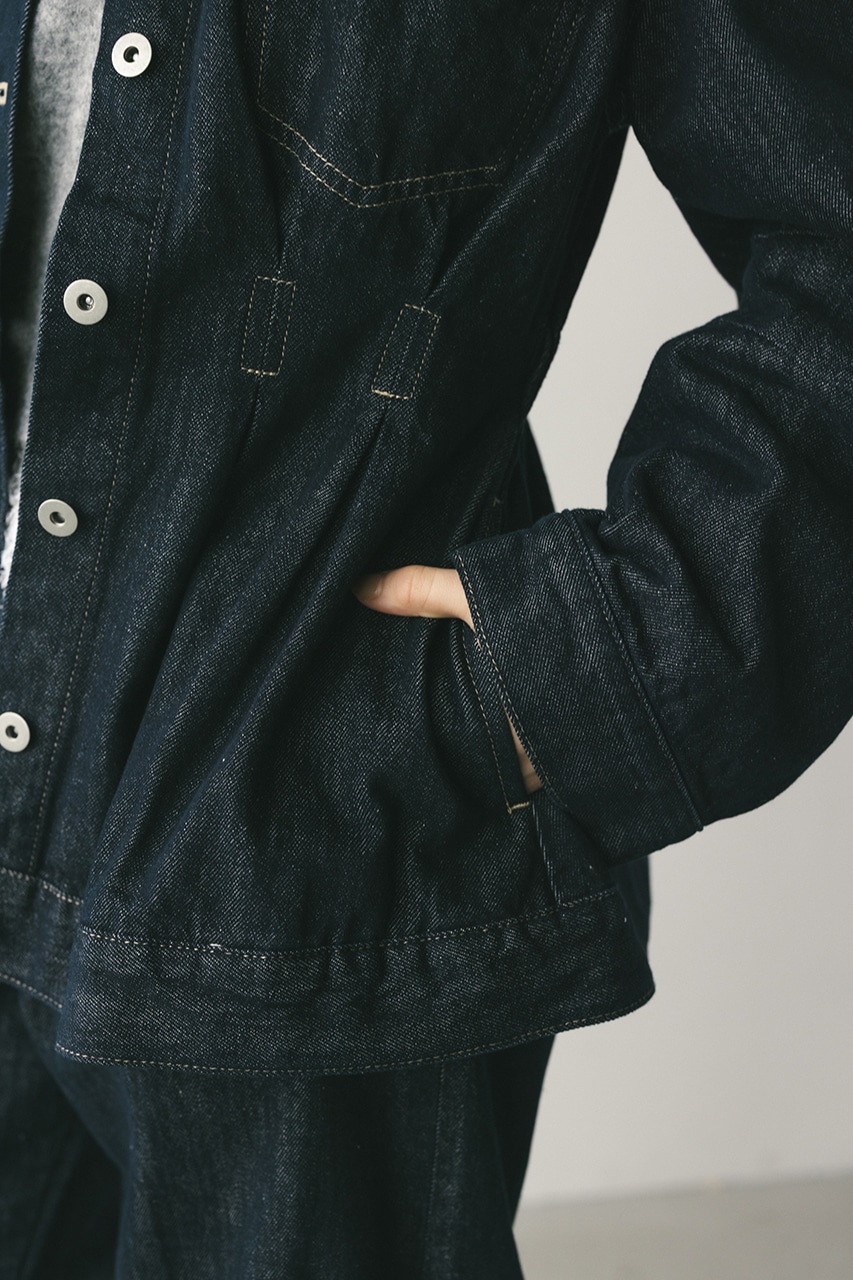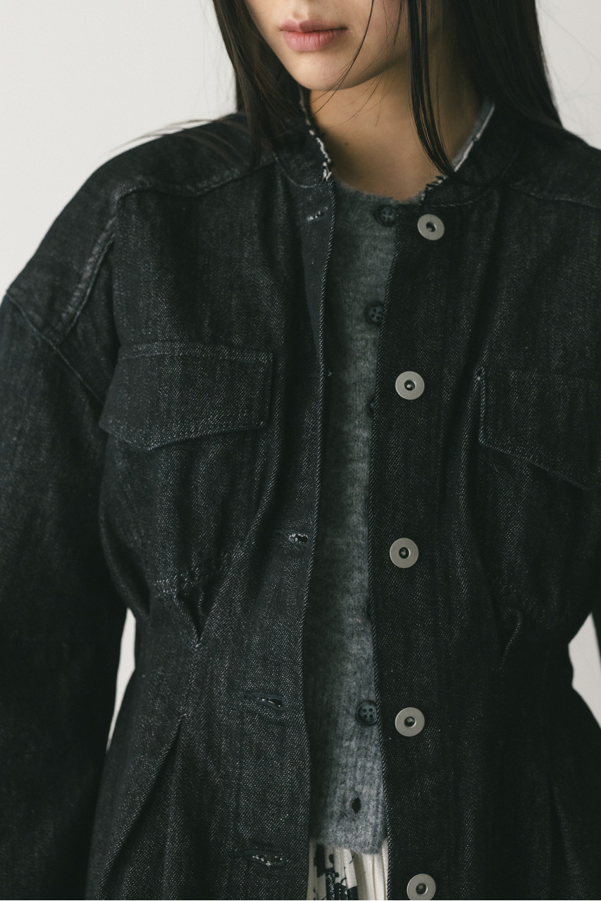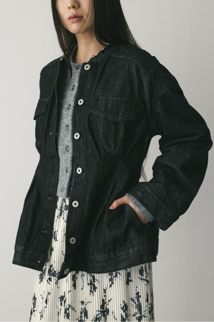 ウエストでタックをとり、女性らしいペプラムシルエットに仕上げたデニムジャケット。首元がすっきり見えるノーカラーデザインと丸みのある袖のデザインにこだわった一枚。リメイク風なカットオフのフリンジ加工が甘くなりすぎないアクセントになります。ストレッチなし、透け感なし。