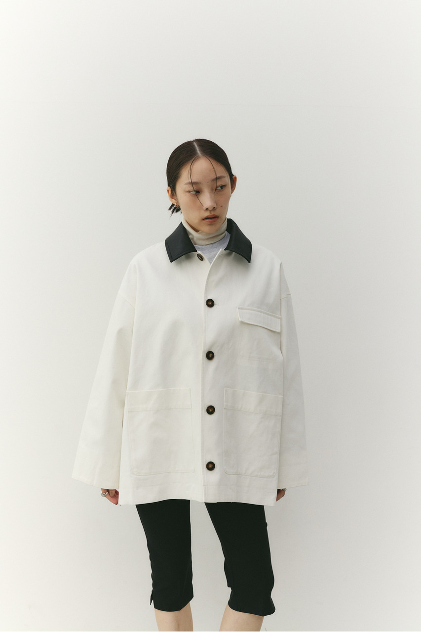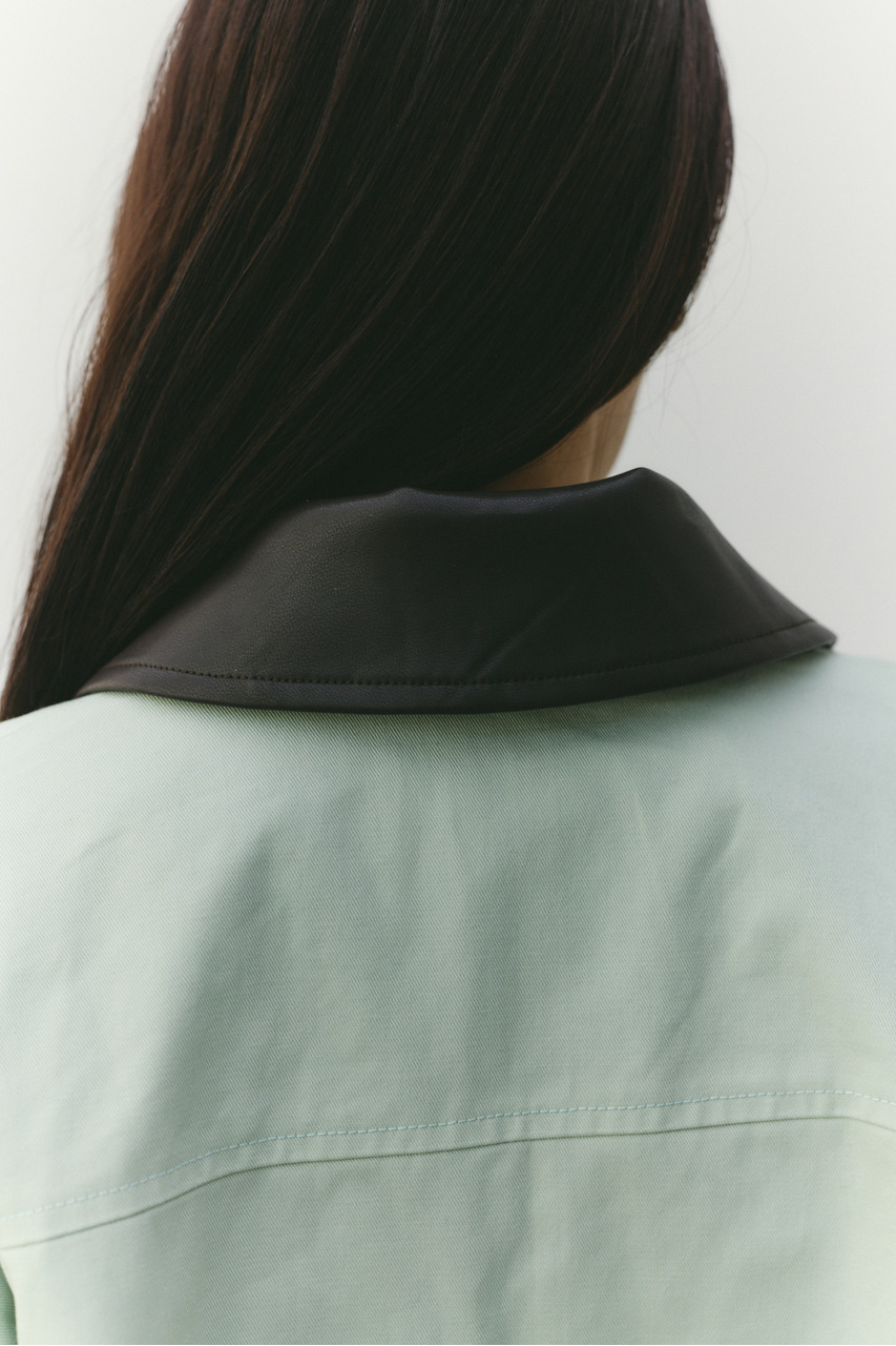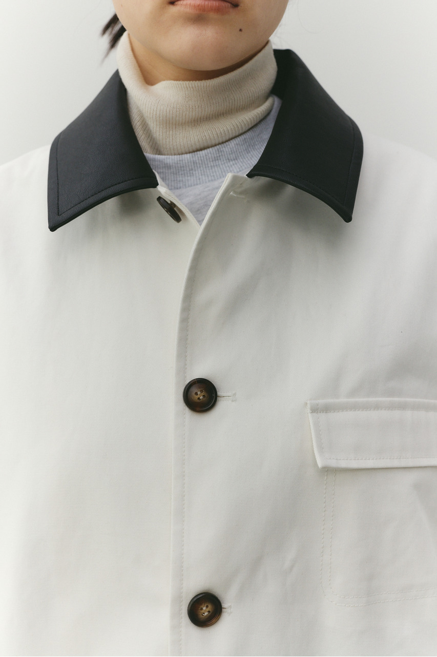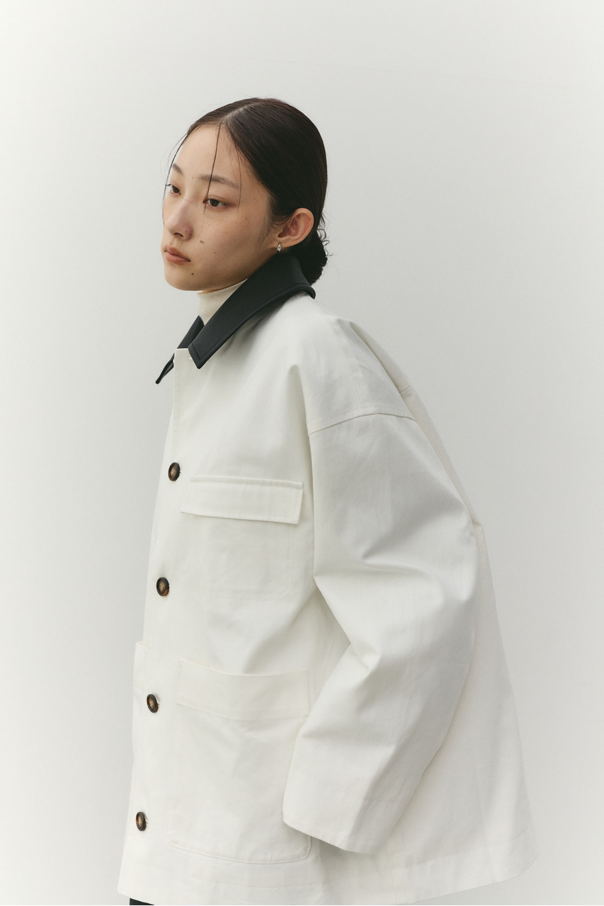 フェイクレザーの襟がアクセントになったカバーオール。ワークテイストなデザインに、異素材のコントラストを加えることで、程よく洗練された印象に仕上げました。さらっと羽織れる軽さで、季節の変わり目にも活躍。デニムやスラックス、スカートまで幅広く合わせやすく、カジュアルにもきれいめにも着こなせる一枚です。透け感なし、ストレッチなし。