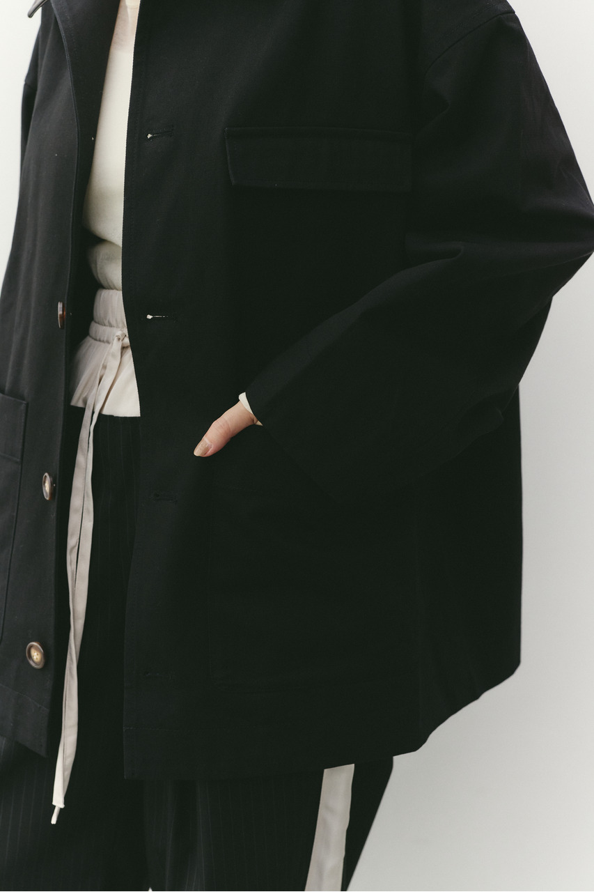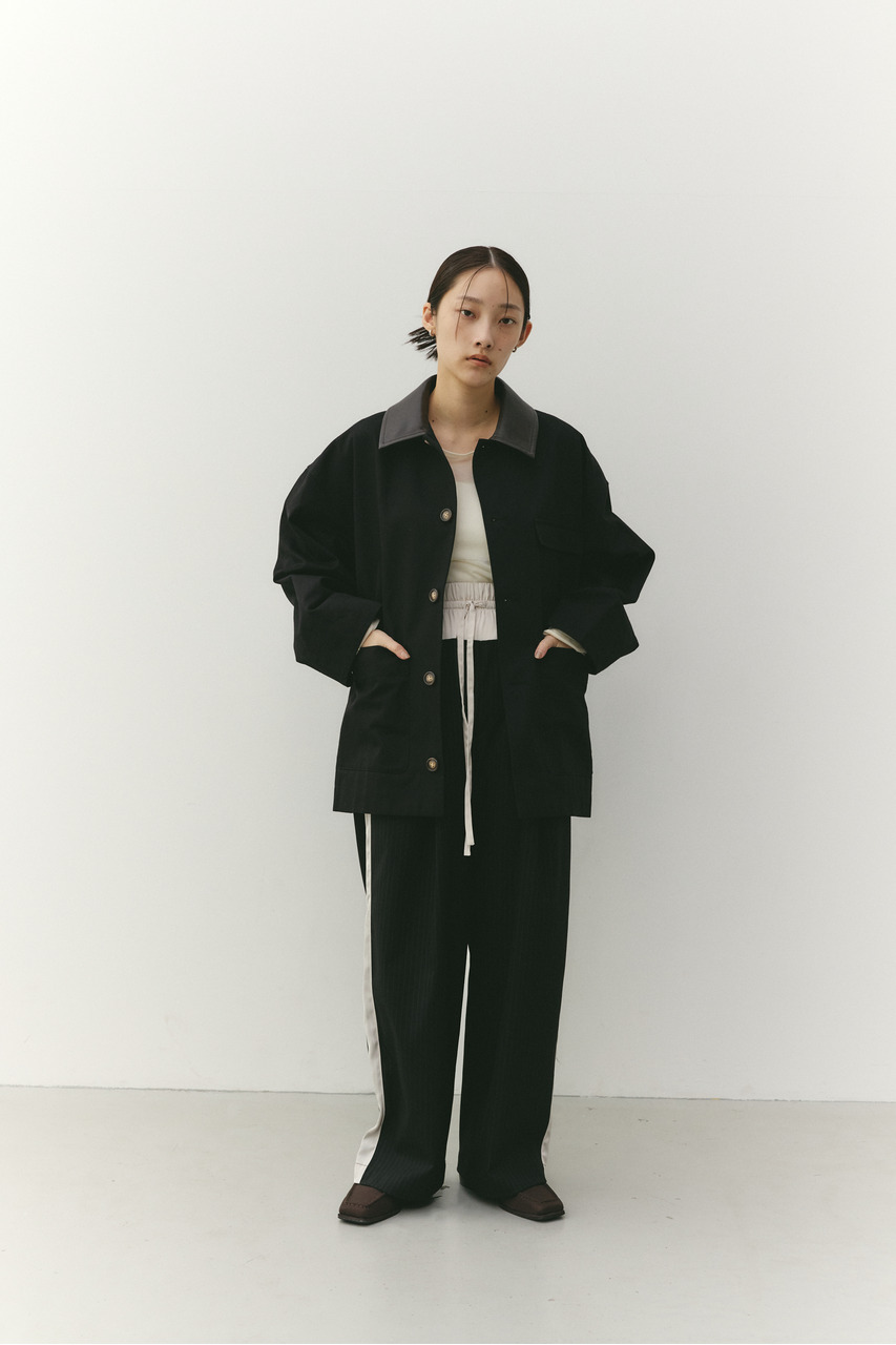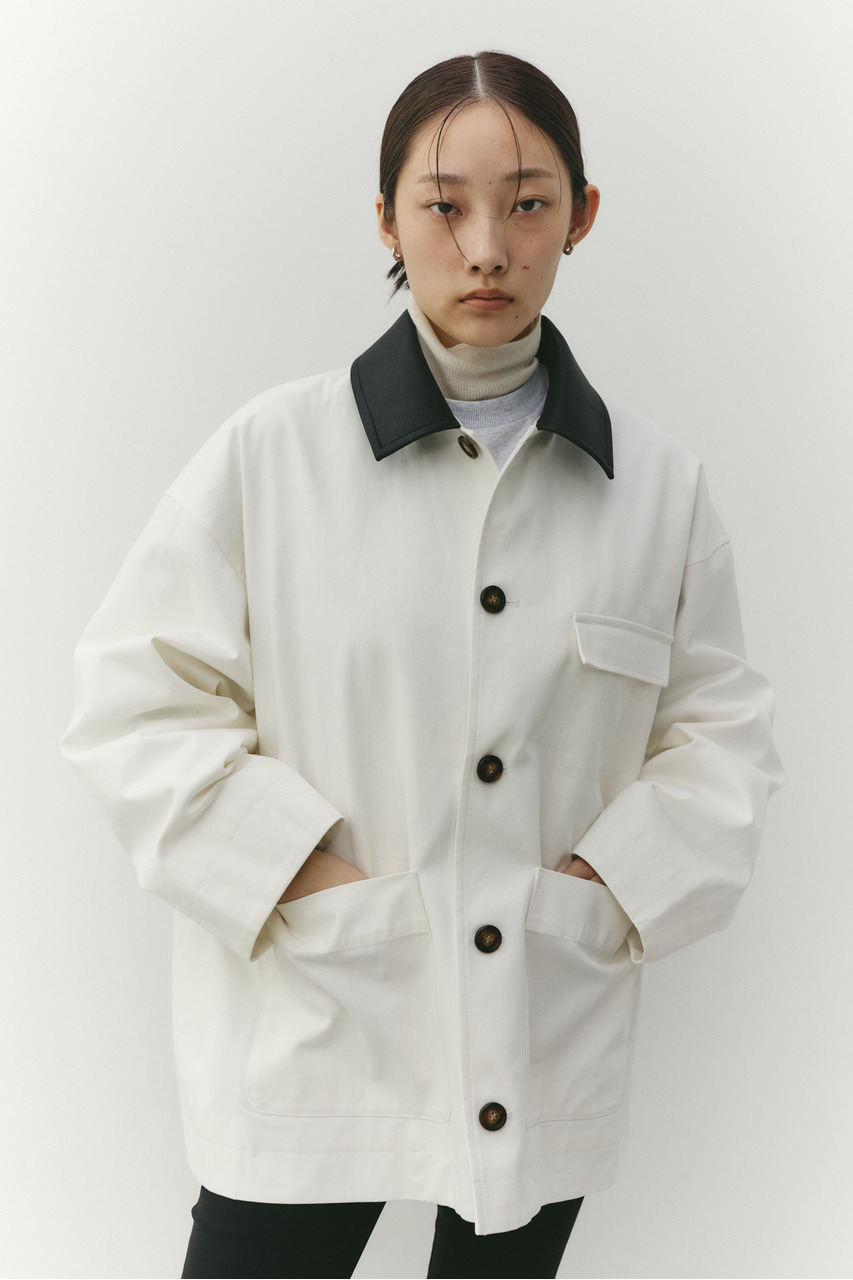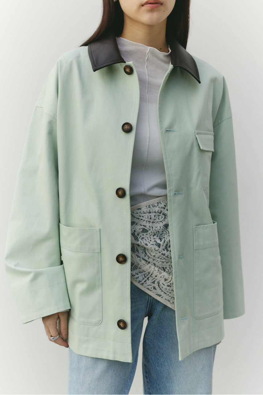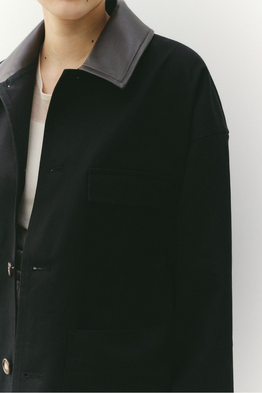 フェイクレザーの襟がアクセントになったカバーオール。ワークテイストなデザインに、異素材のコントラストを加えることで、程よく洗練された印象に仕上げました。さらっと羽織れる軽さで、季節の変わり目にも活躍。デニムやスラックス、スカートまで幅広く合わせやすく、カジュアルにもきれいめにも着こなせる一枚です。透け感なし、ストレッチなし。