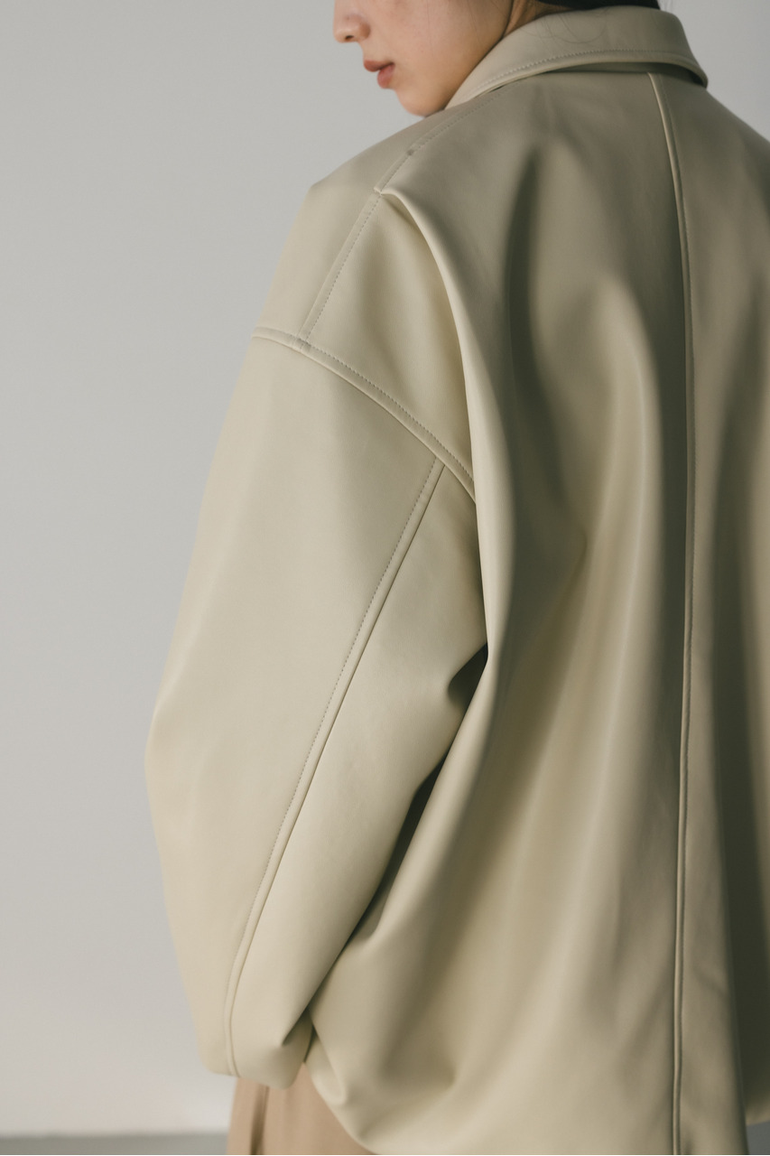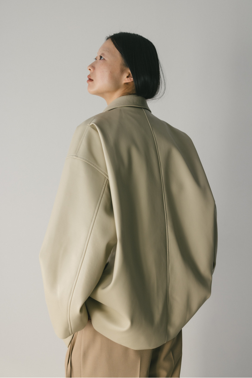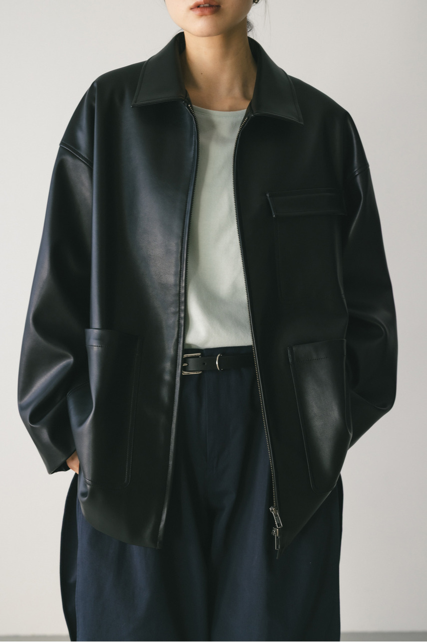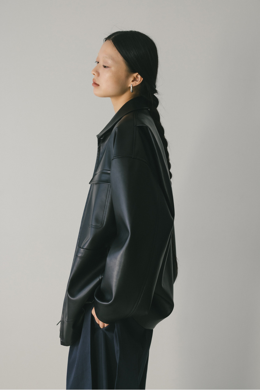 すっきりとした襟とオーバーなサイズ感がポイントのレザージャケット。タックを施した丸みのある背中のシルエットとボリューム感のある袖が可愛いアウター。ビッグポケットがデザインポイント。シンプルながらも存在感のあるシルエットが、洗練された印象を与えます。柔らかなフェイクレザー素材は馴染みやすく、重ねても羽織りやすい一枚。ヒップラインが隠れる長め丈で、気になる腰回りもカバーしてくれます。ストレッチ無し、透け感なし。