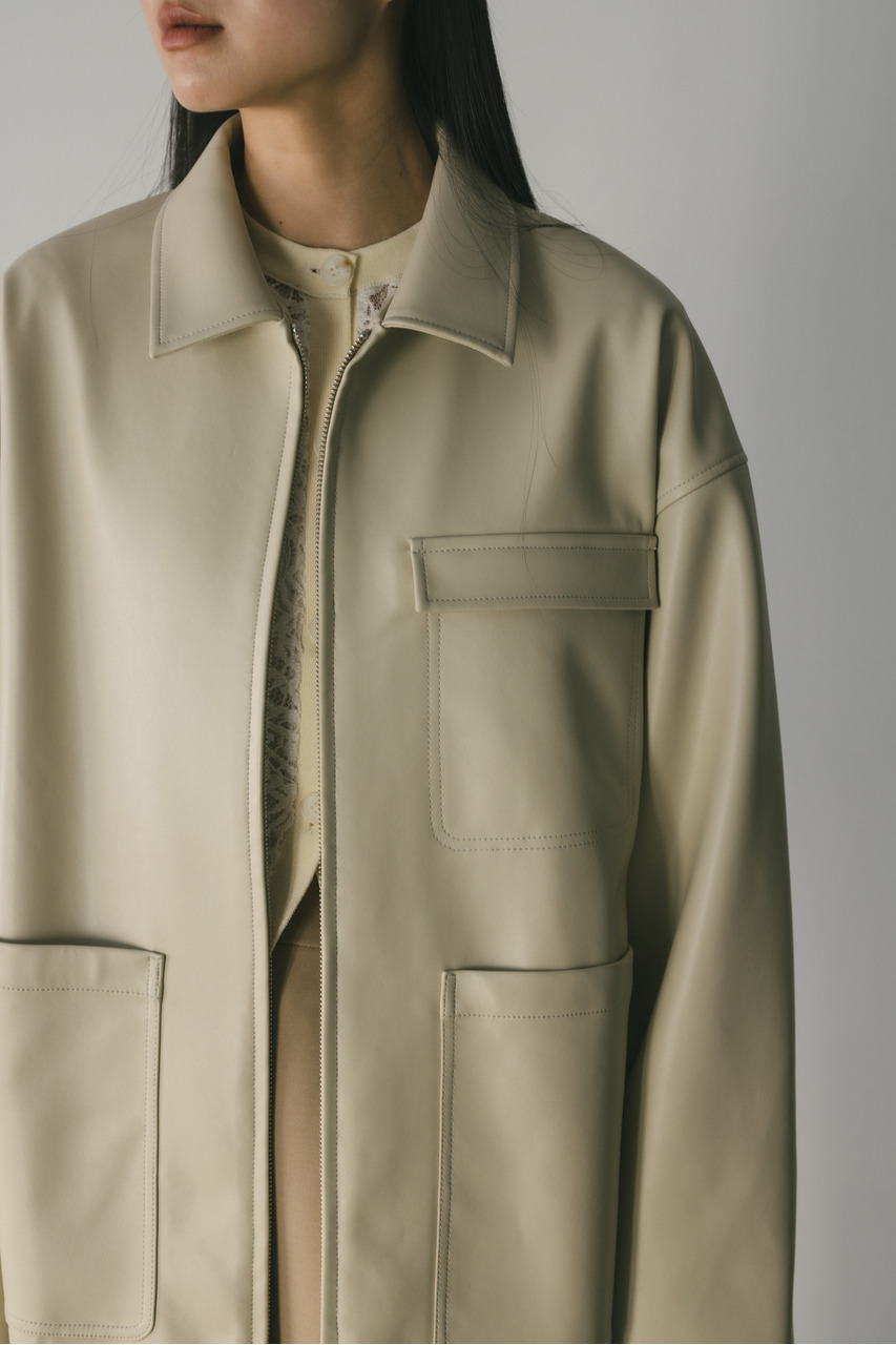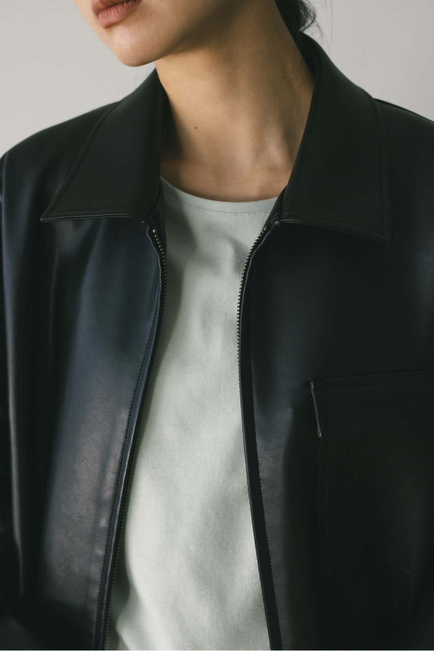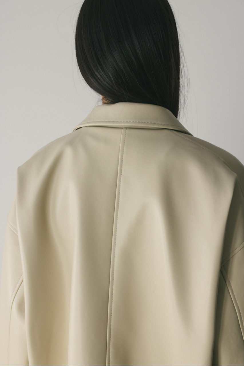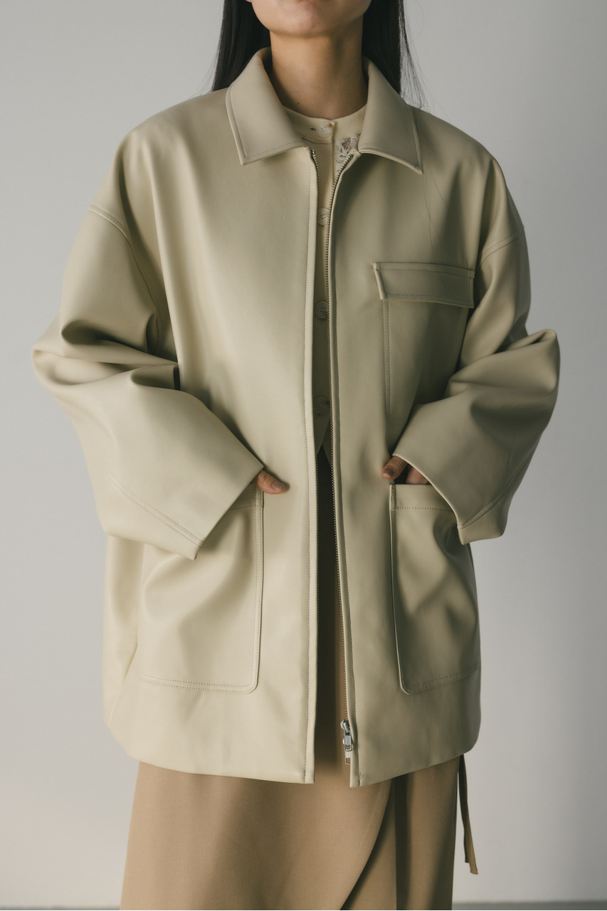 すっきりとした襟とオーバーなサイズ感がポイントのレザージャケット。タックを施した丸みのある背中のシルエットとボリューム感のある袖が可愛いアウター。ビッグポケットがデザインポイント。シンプルながらも存在感のあるシルエットが、洗練された印象を与えます。柔らかなフェイクレザー素材は馴染みやすく、重ねても羽織りやすい一枚。ヒップラインが隠れる長め丈で、気になる腰回りもカバーしてくれます。ストレッチ無し、透け感なし。