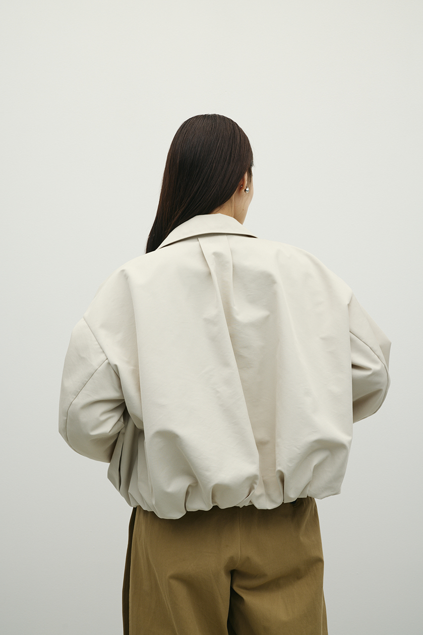 程よくハリ感のある素材にタックを施したバルーンシルエットが特徴のブルゾン。程よいボリューム感で、羽織るだけでコーディネートに立体感をプラス。カジュアルながらも女性らしい丸みのあるフォルムで、パンツにもスカートにも合わせていただきやすい一枚です。透け感なし、ストレッチなし。