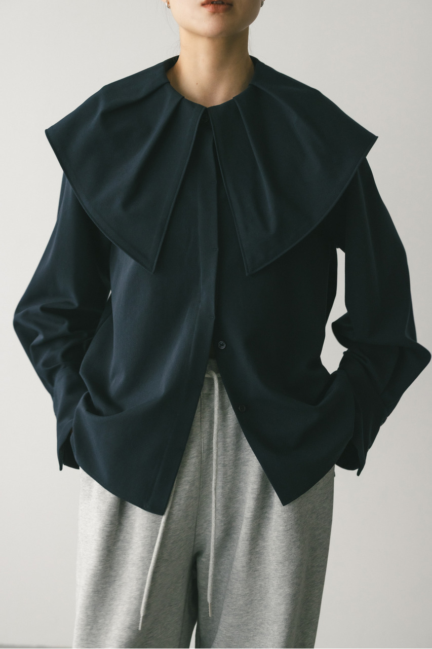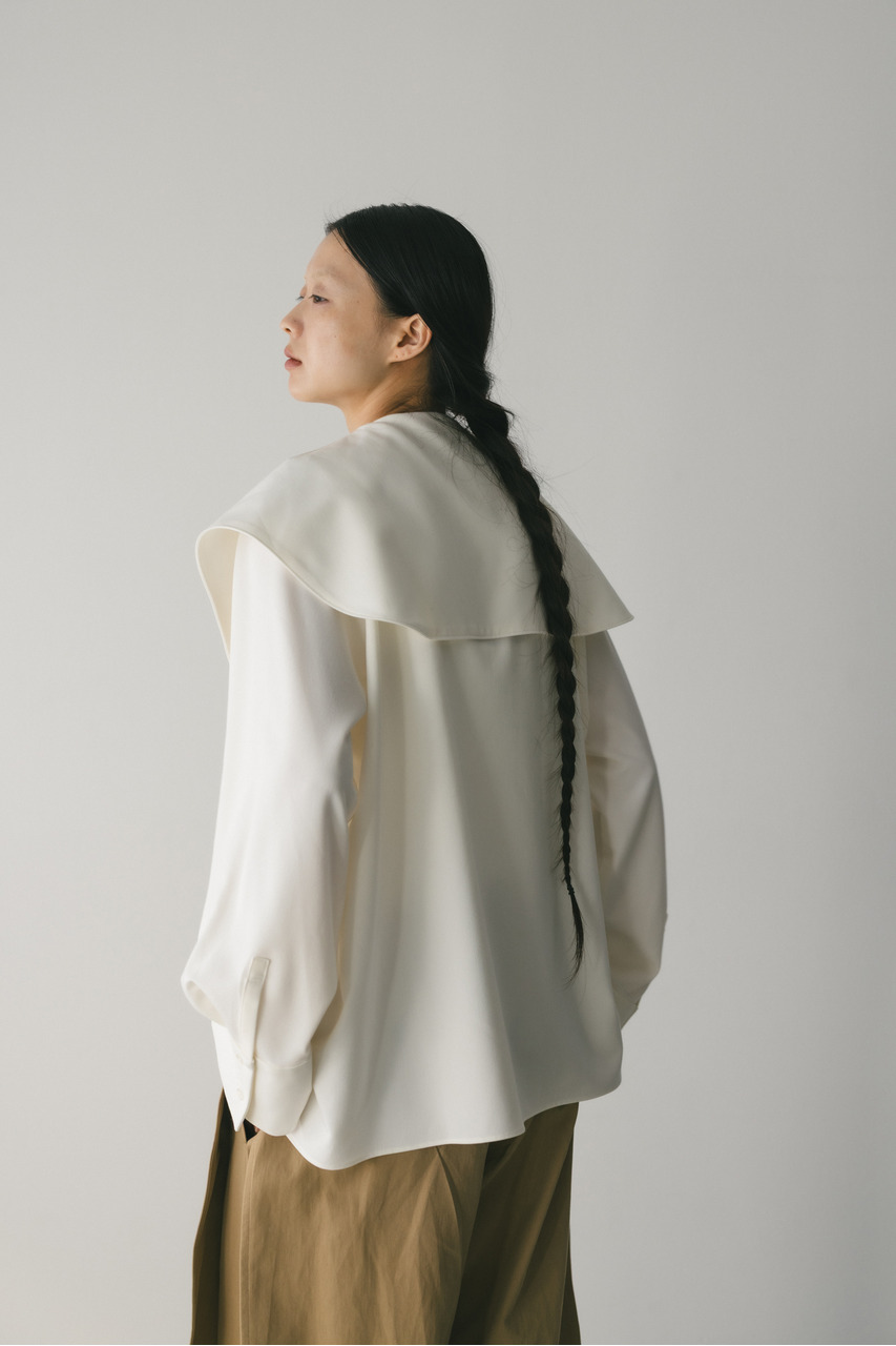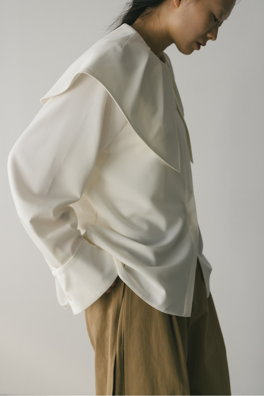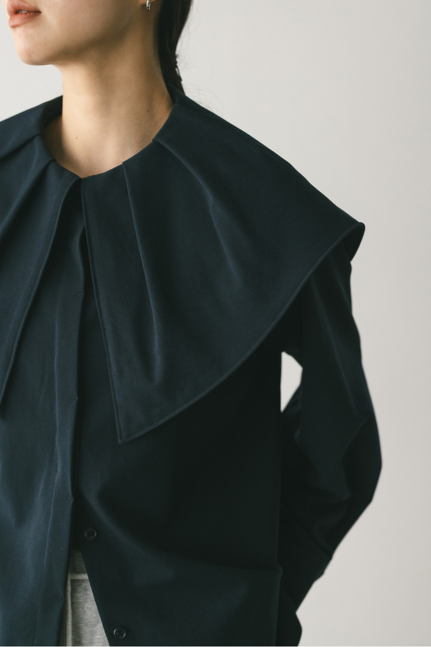 タックをあしらったビッグカラーが特徴的なブラウス。大きめな衿は可愛らしさがありつつもタックデザインとケープのようなデザインが落ち着き感とモードな印象の大人なデザインに仕上げました。ゆったりとしたサイズ間で、1枚でもインナータートルなどとレイヤードしても使えるアイテムです。ストレッチなし、透け感なし。