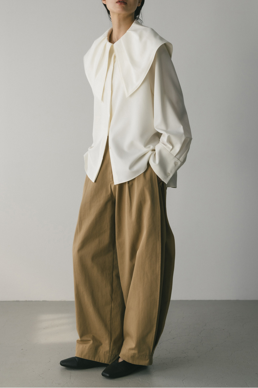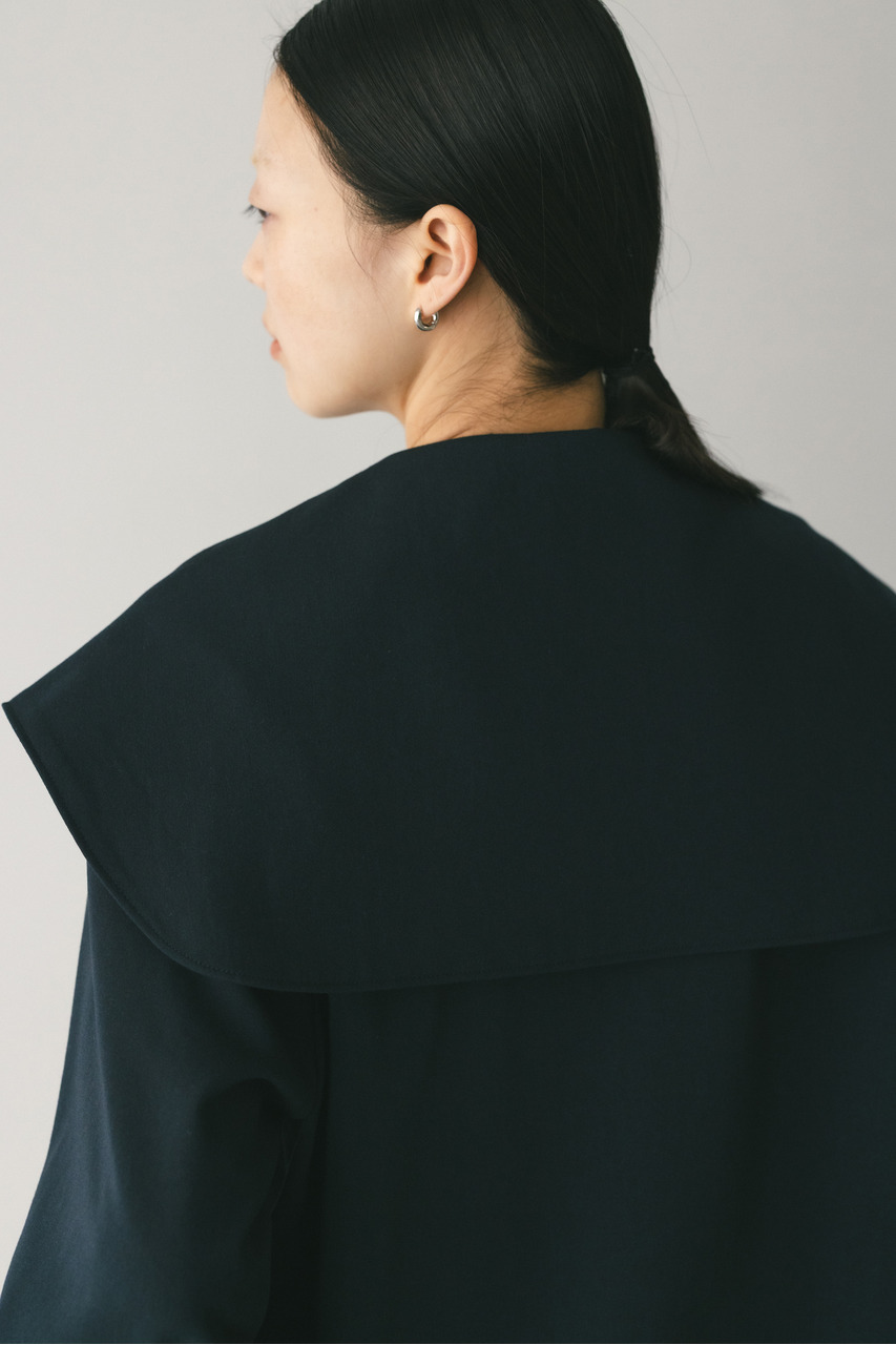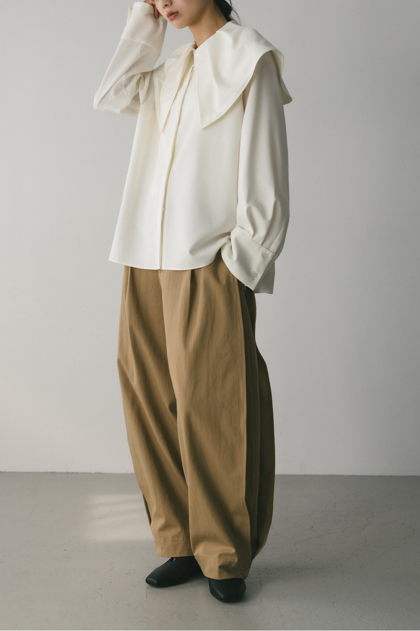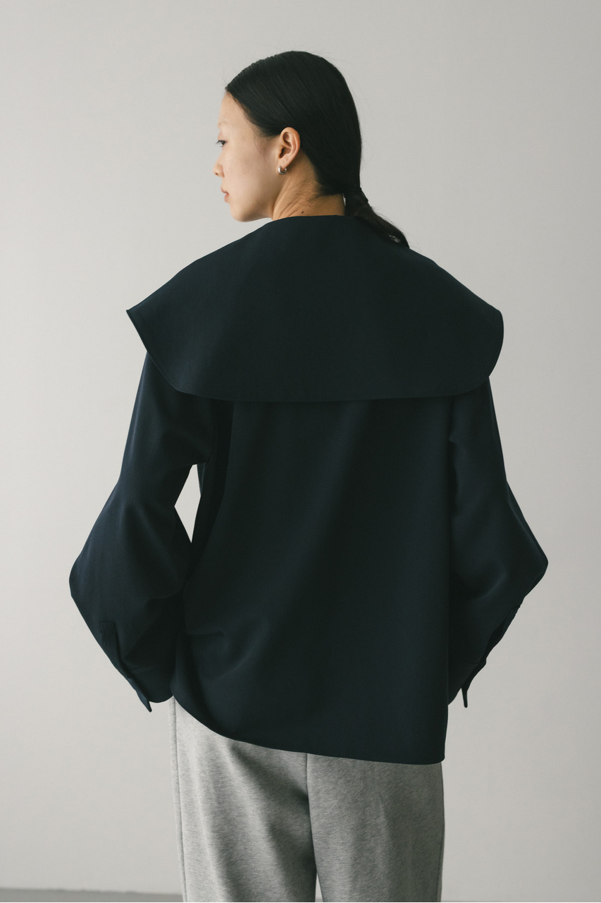 タックをあしらったビッグカラーが特徴的なブラウス。大きめな衿は可愛らしさがありつつもタックデザインとケープのようなデザインが落ち着き感とモードな印象の大人なデザインに仕上げました。ゆったりとしたサイズ間で、1枚でもインナータートルなどとレイヤードしても使えるアイテムです。ストレッチなし、透け感なし。